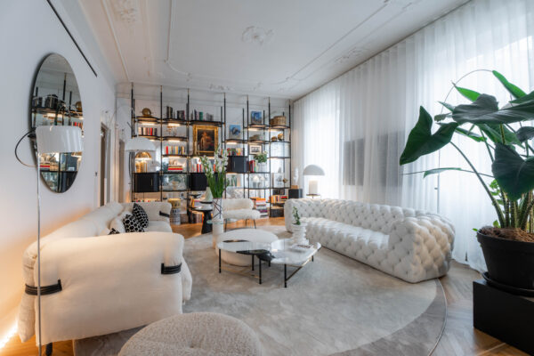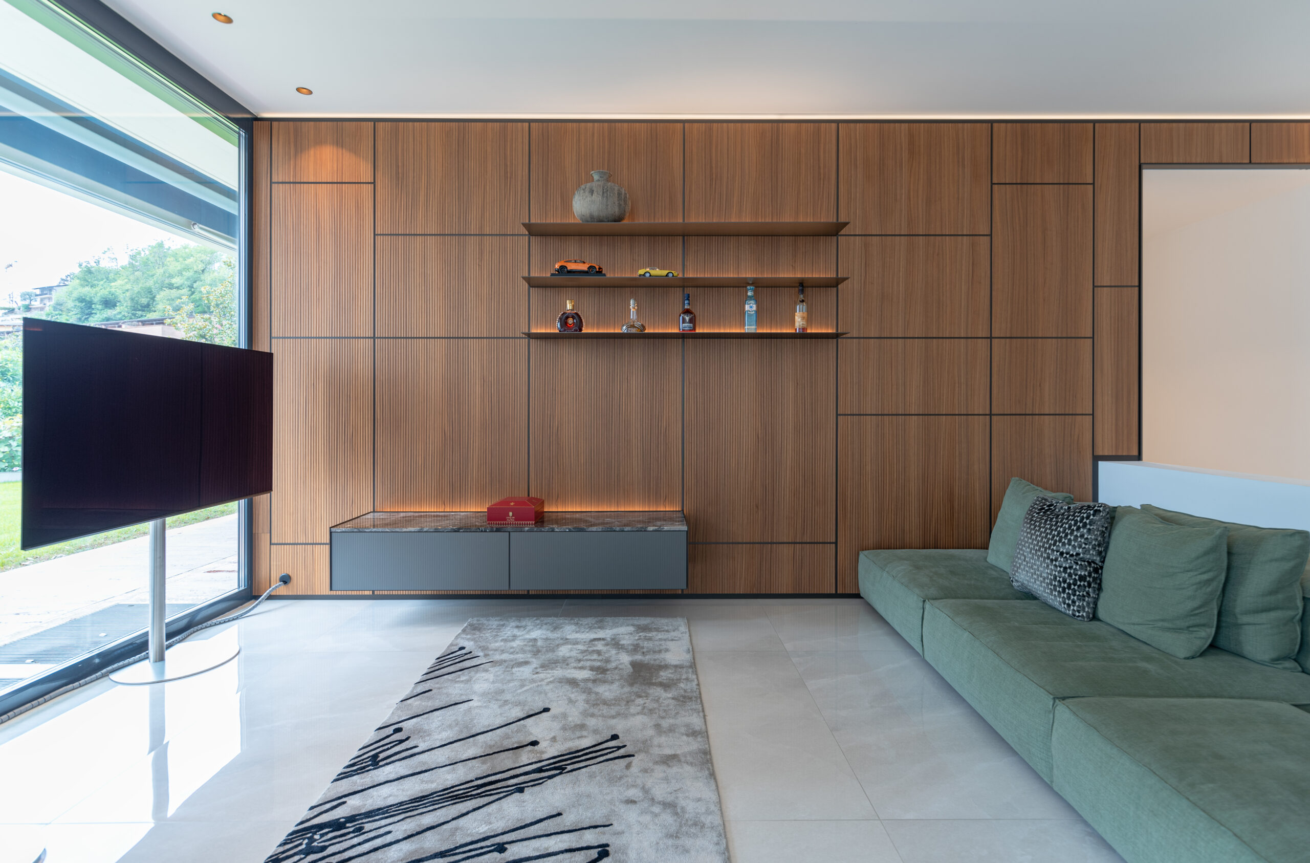 Questo trittico si snoda su più livelli, creando la sensazione di trovarsi in parti diverse della casa pur soggiornando nel medesimo ambiente. Nota di pregio è rappresentata dalla boiserie in legno di Rimadesio, un punto caldo che rischiara e ingentilisce l’ambiente. L’innesto di alcuni elementi più retrò collima nel creare uno spazio più complesso, con richiami ricchi di suggestione.