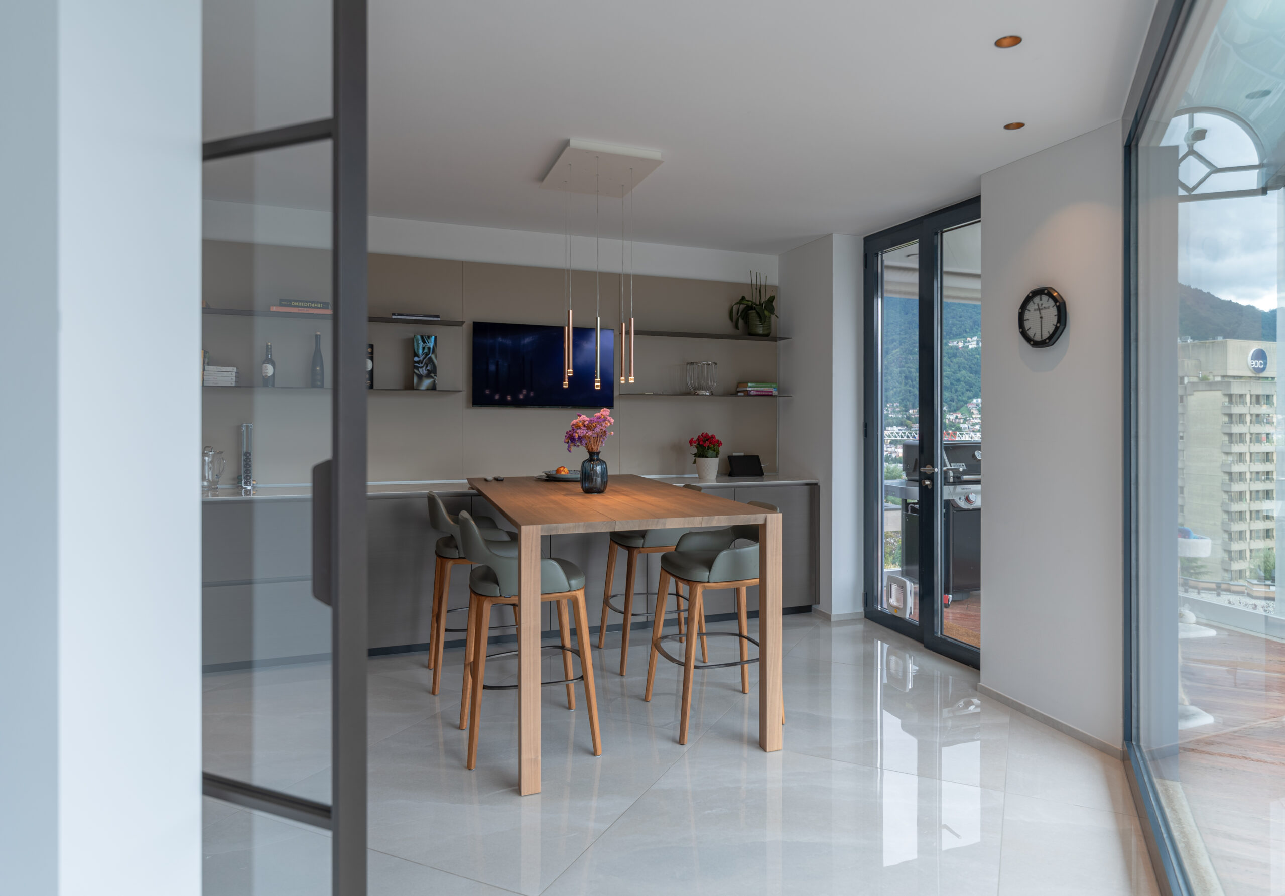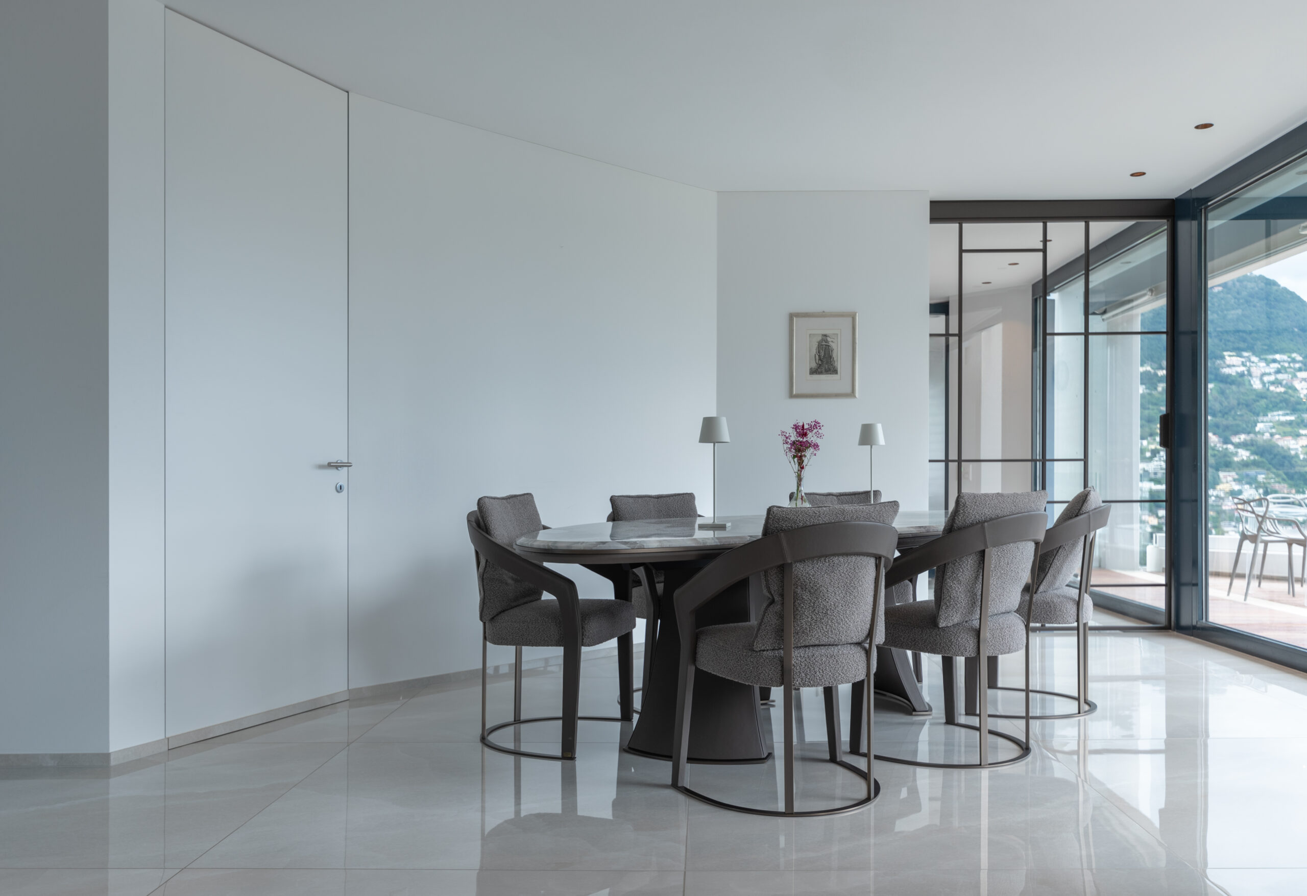 Salvioni ha raccolto le esigenze del cliente confezionando un ambiente sobrio ed elegante, dove forte si percepisce il rigore geometrico dello spazio e i suoi punti di forza. Nell’ampio salone d’ingresso è stato creato uno spazio funzionale frammentando l’open space in tre elementi a sé stanti: un living accogliente, un dining con tavolo Longhi e un home cinema. Queste tre dimensioni dialogano liberamente e si distinguono per la presenza di pezzi di estremo pregio fra cui il divano Minotti in tinte grigie e il divano Living Divani in verde per lo spazio cinema.