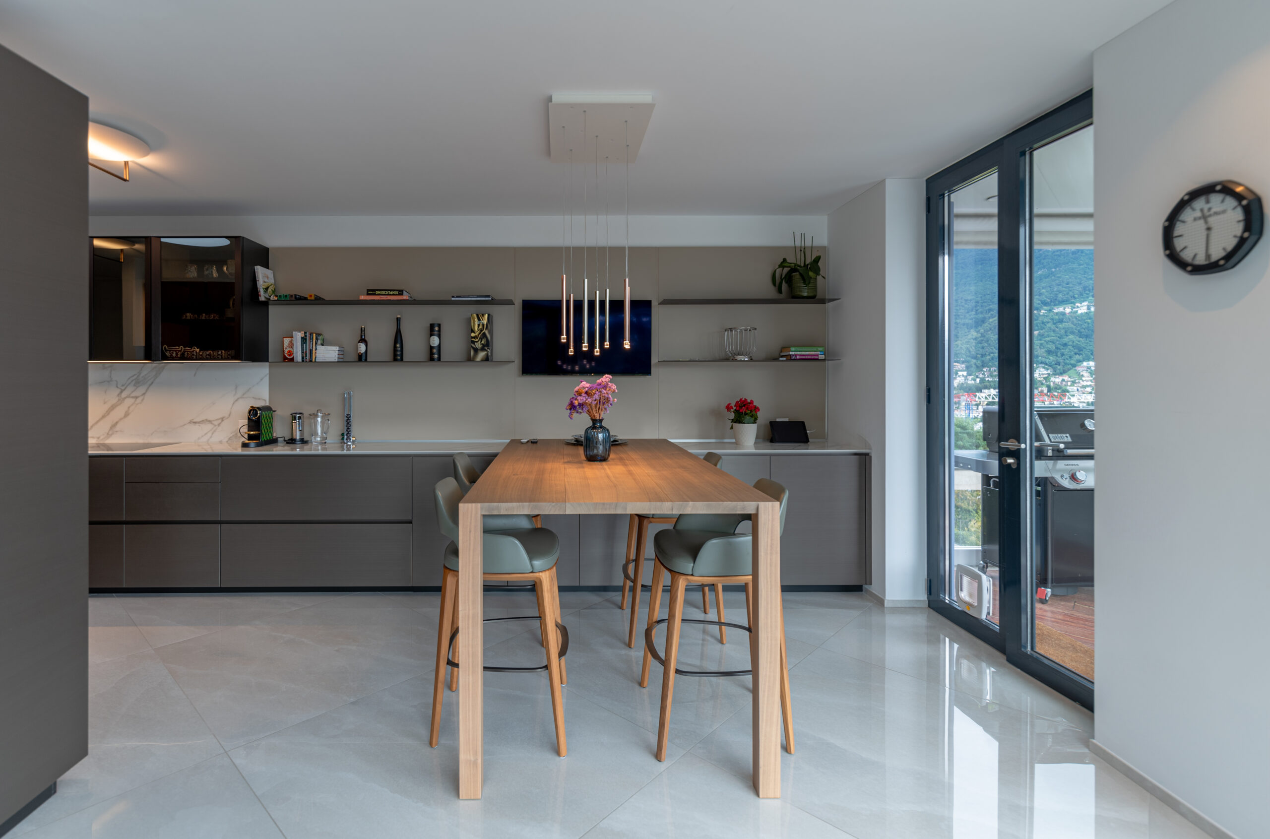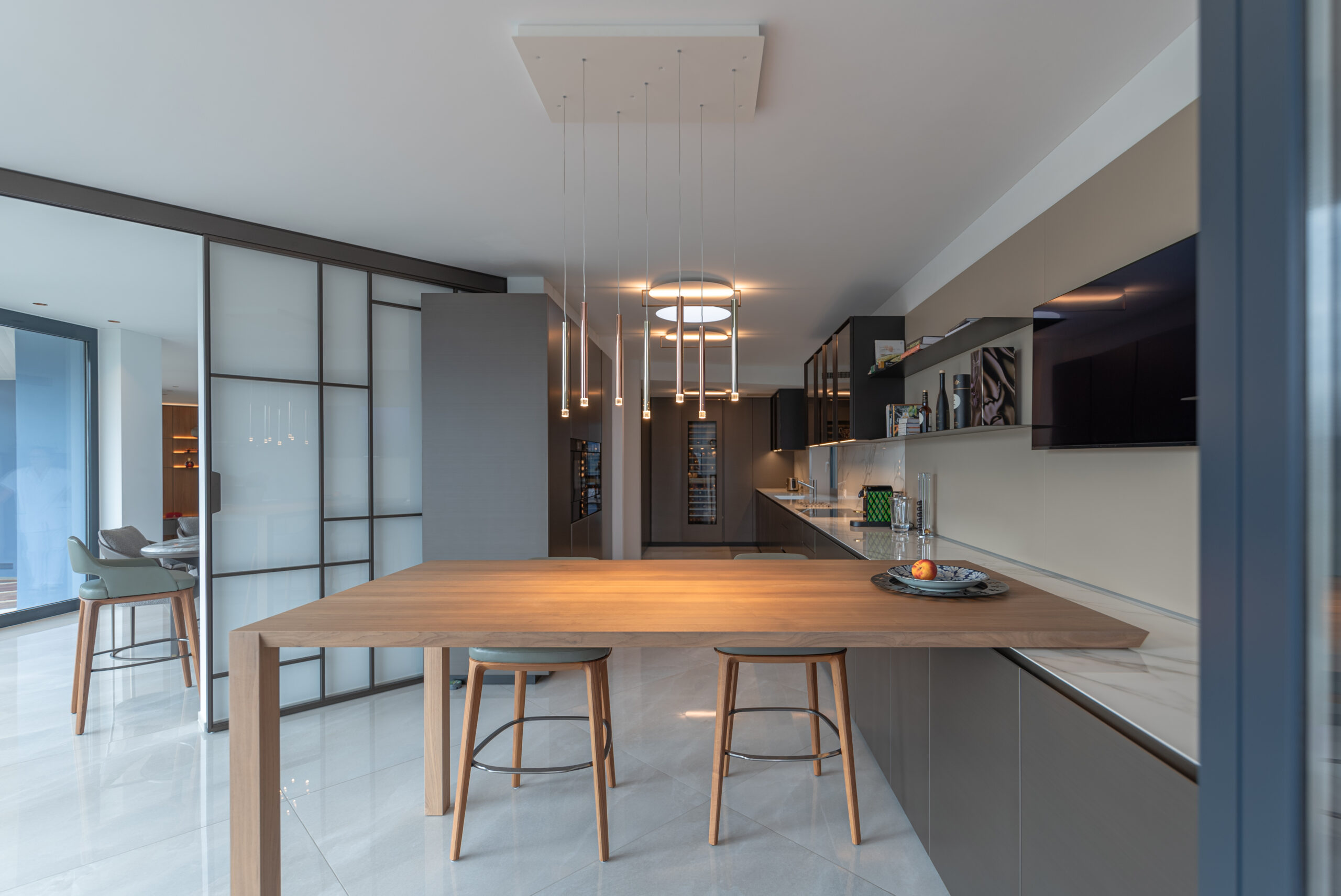 La cucina Poliform si snoda oltre lo spazio living, creando un ambiente provvisto di tutti i migliori elettrodomestici e pensato per ottimizzare la preparazione dei pasti nell’arco della giornata. Una pratica penisola circondata da sgabelli funge da tavolo per pasti più rapidi e intimi. Anche qui l’ambiente gode di un pratico sbocco sull’esterno arredato a zona barbecue.