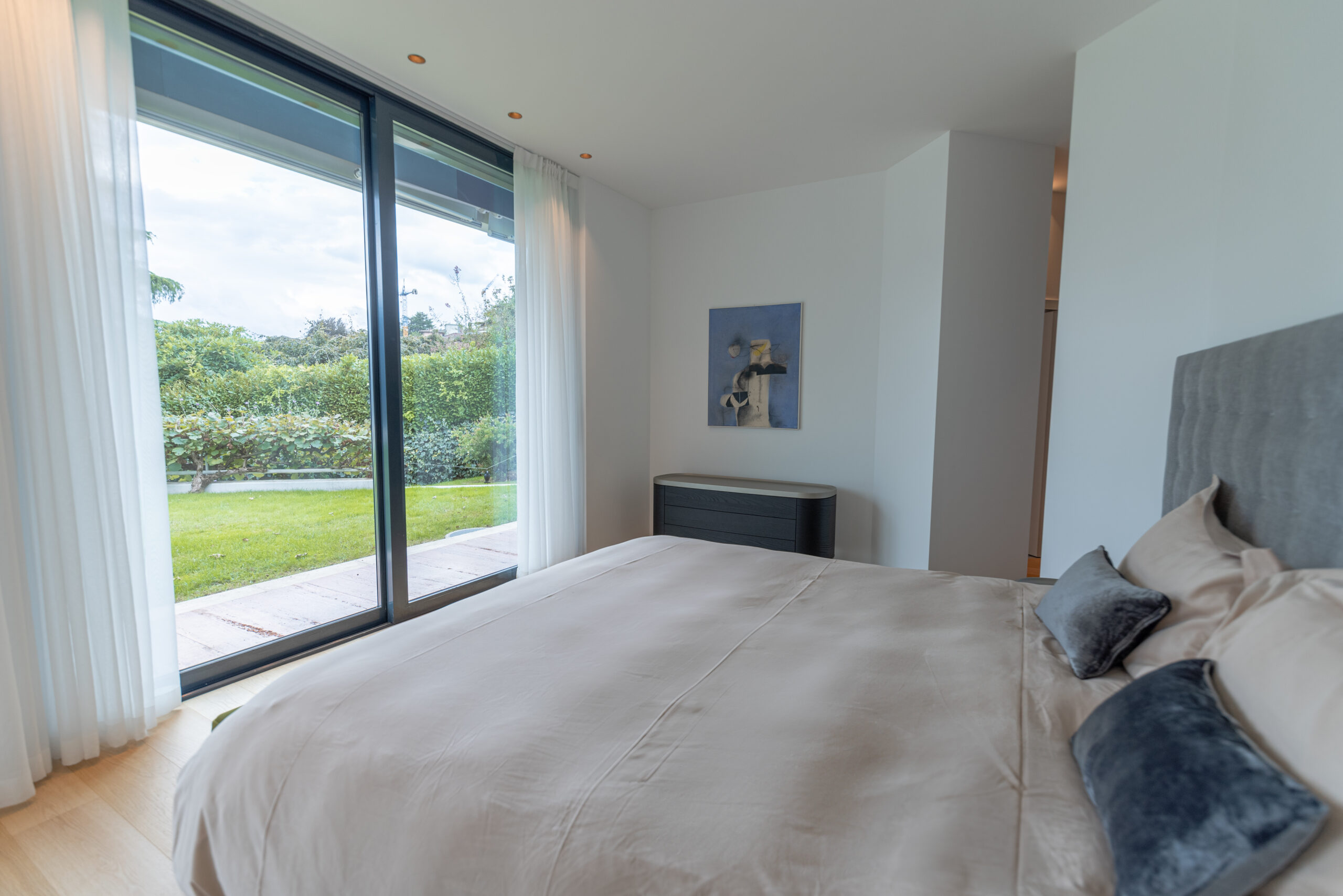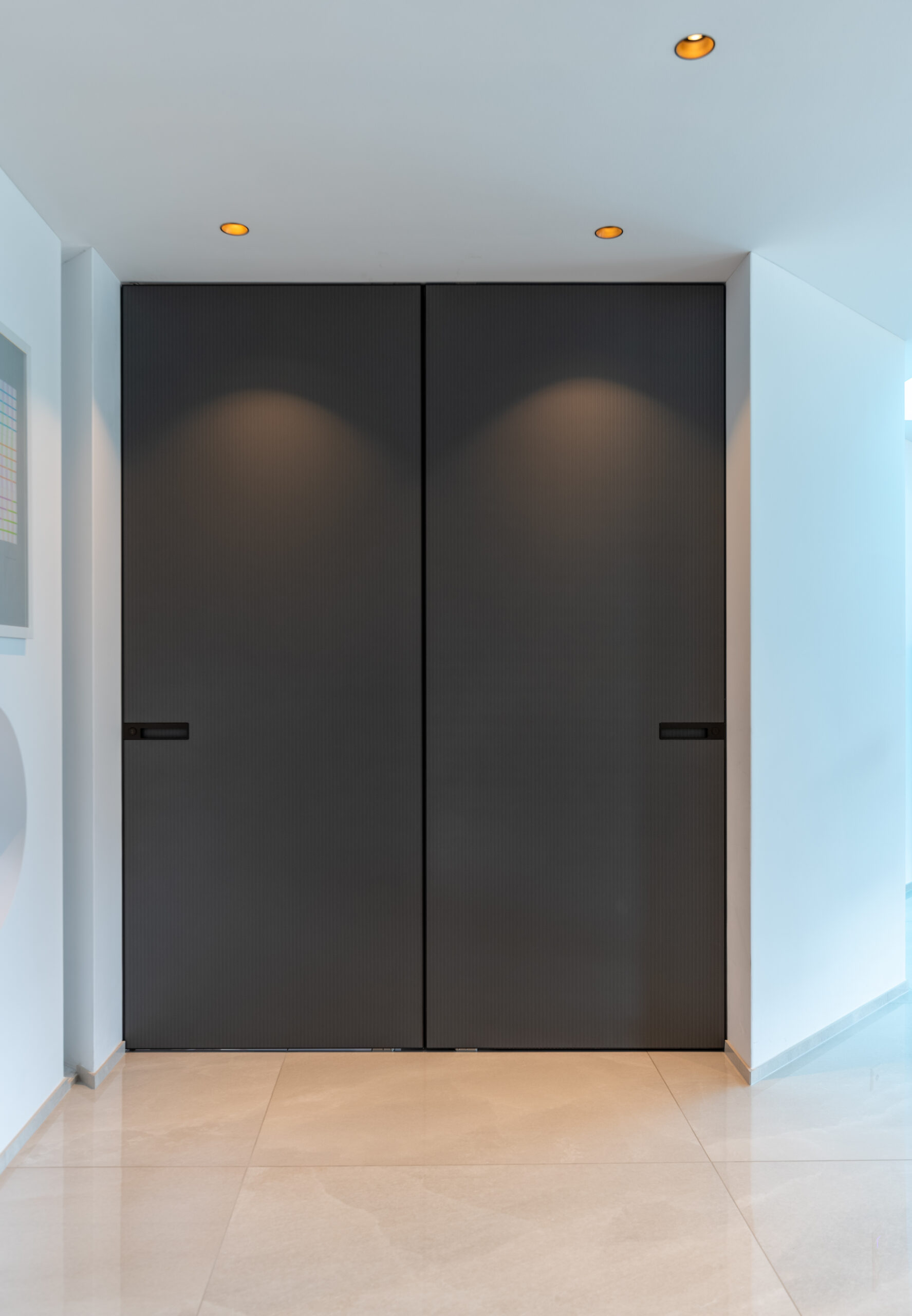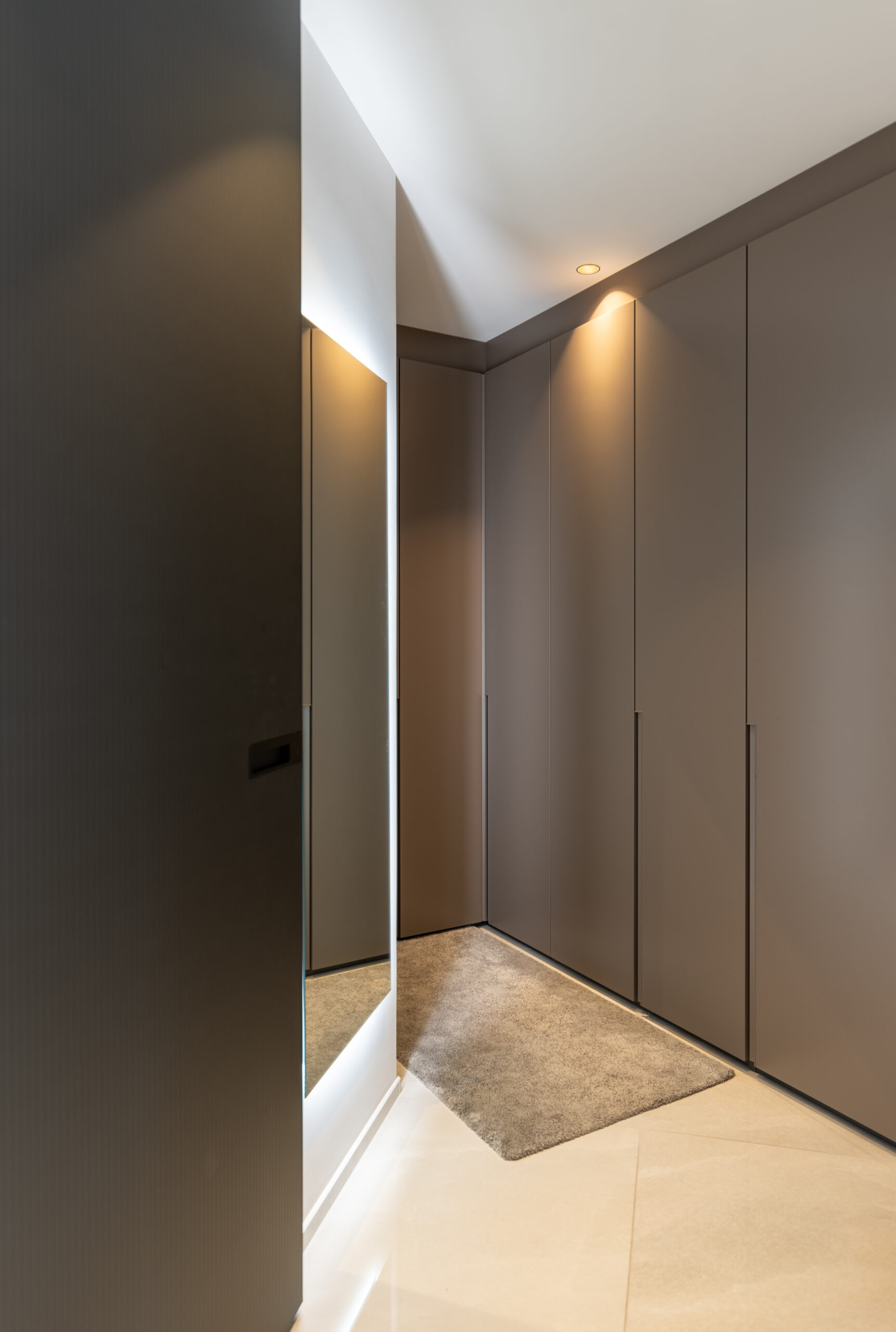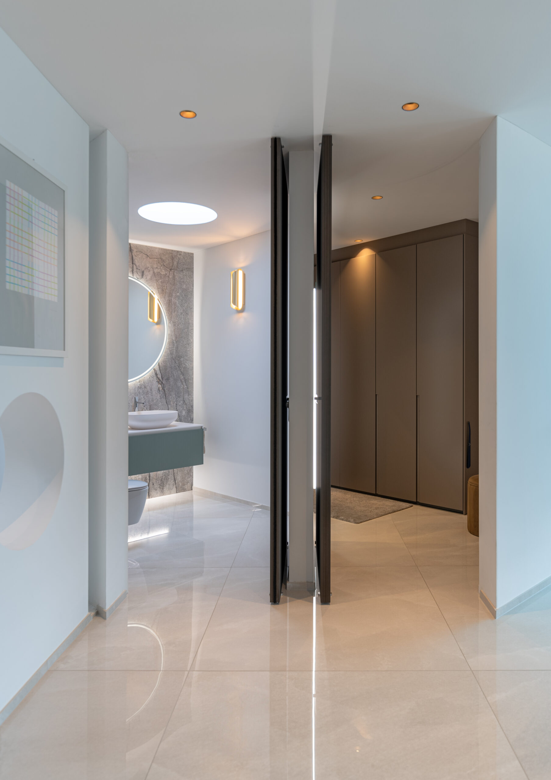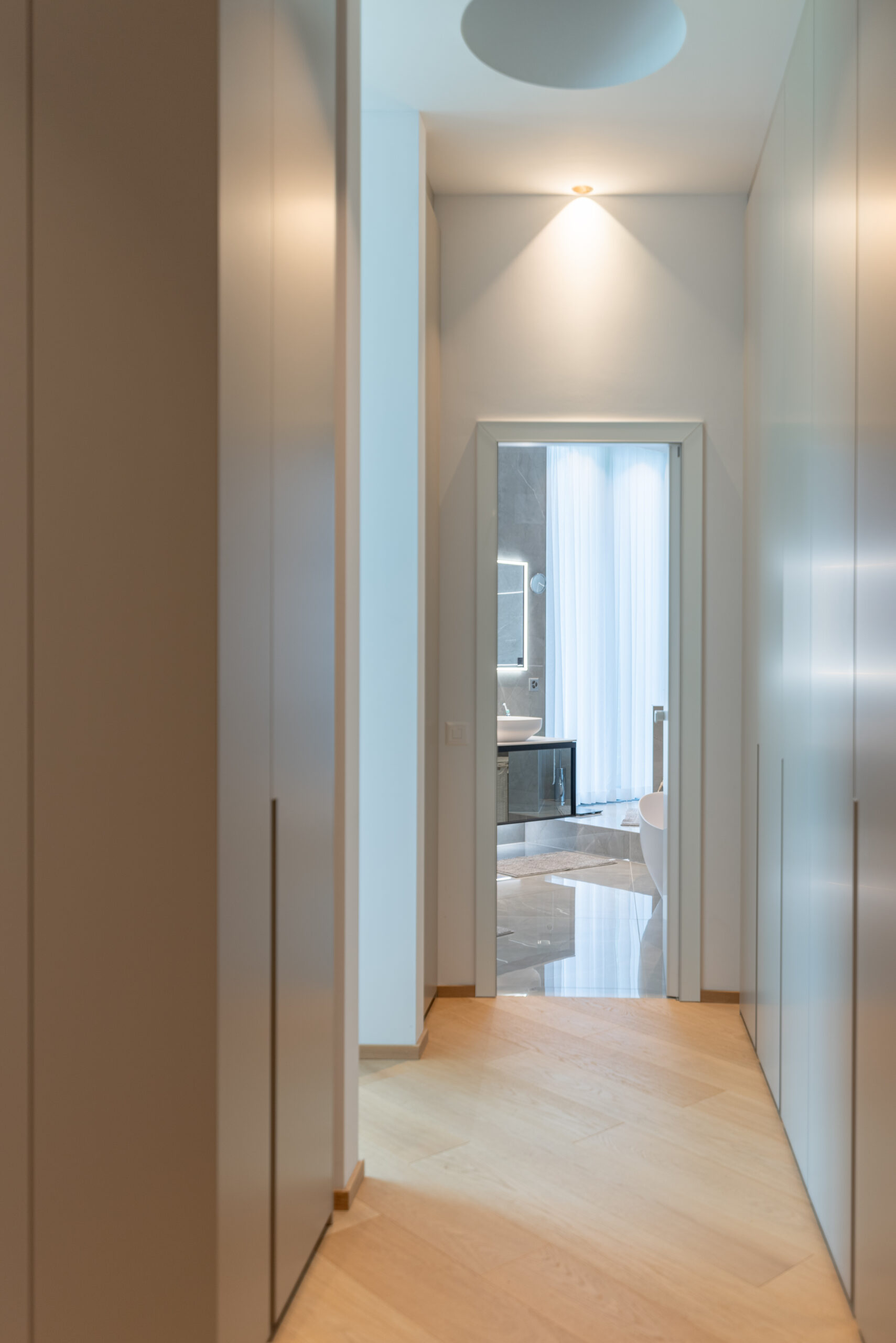 Procedendo verso la zona notte si accede a un corridoio completamente rivestito da armadi Poliform delineati per seguire il naturale andamento dello spazio fino a condurre alle camere, semplici e intime, arredate con il minimo indispensabile e arricchite da tende Athena. A chiusura di un locale adibito a guardaroba troviamo una porta scorrevole Rimadesio che garantisce un minimo di privacy grazie ai toni fumé del vetro. La sensazione qui è di trovarsi in uno spazio pulito e tranquillo, riparato rispetto all’area più mondana, dove rilassarsi e ritagliare dei momenti per se stessi.