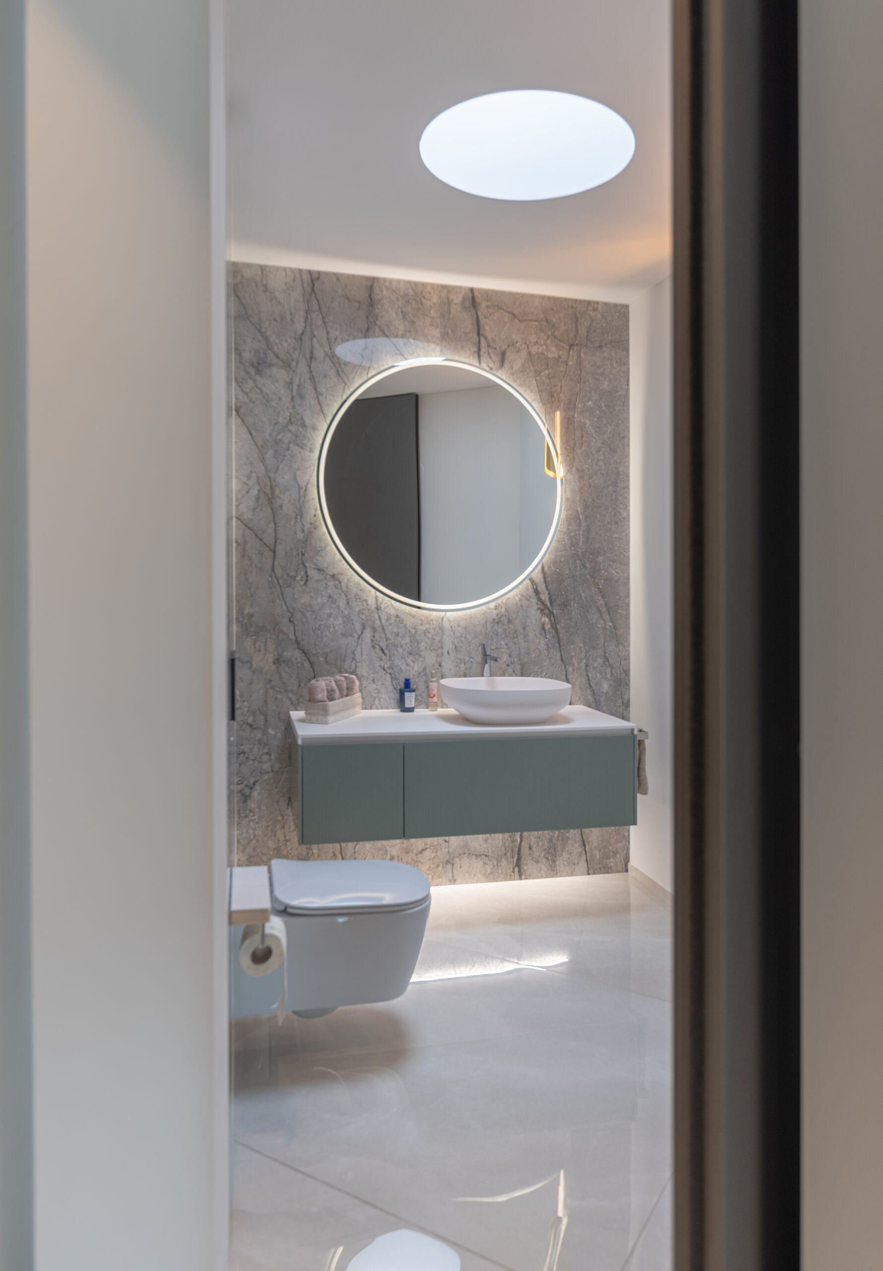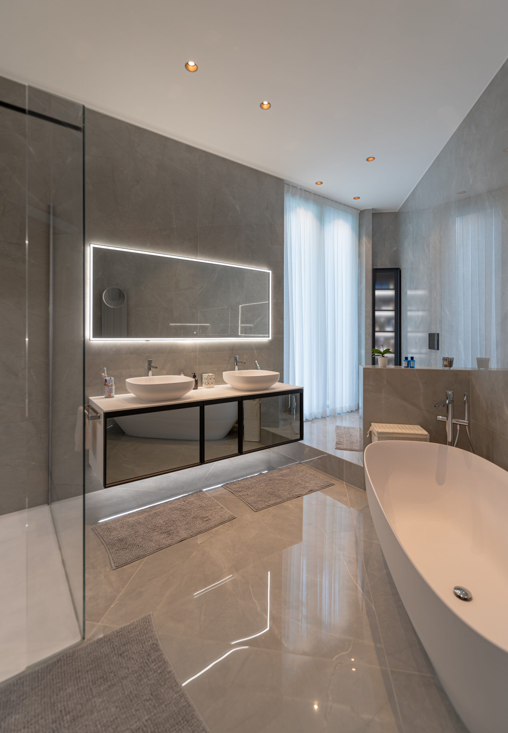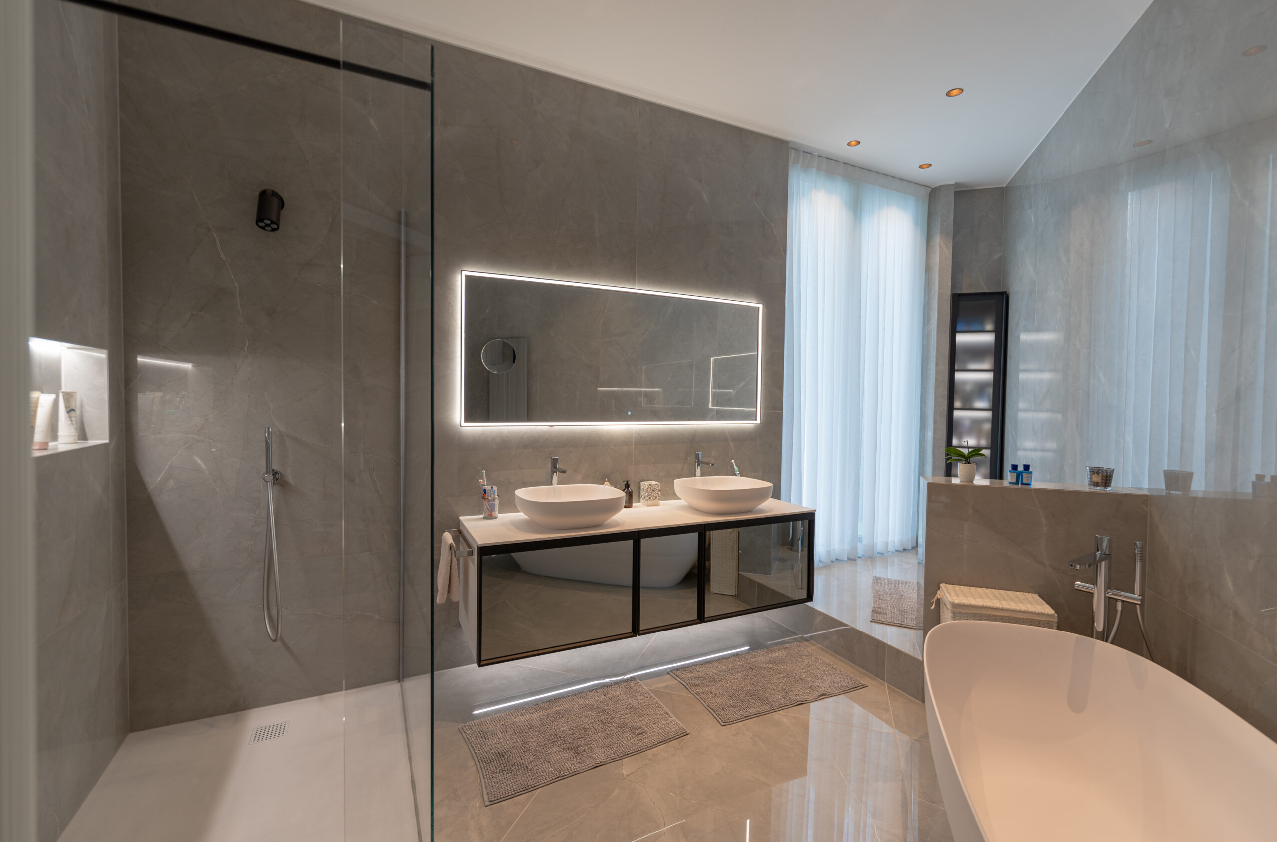 Ultima nota di pregio va al bagno antoniolupi, ampio e rifinito con i migliori materiali per garantire comfort ed eleganza allo stesso tempo. Anche qui le note utilizzate volgono al grigio neutro per non appesantire l’ambiente e aprire gli spazi.