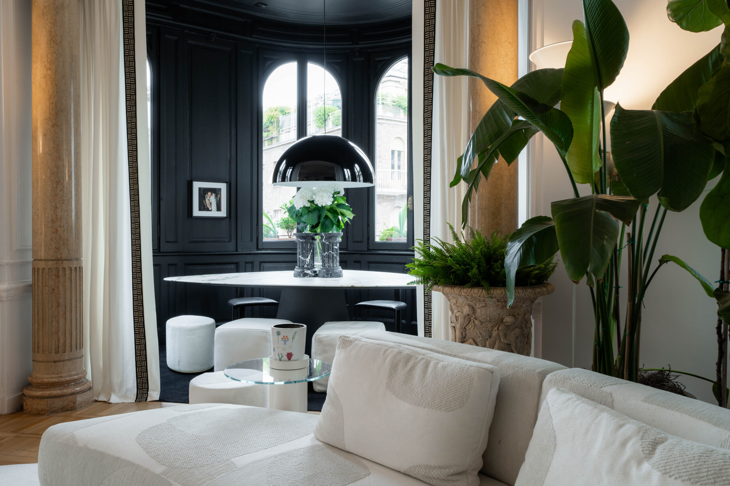 La zona pranzo è stata collocata nel bow-window, unico punto nero di un panorama ultra-bianco, con le sedie Zefir di Baxter e pouf Lou di Gallotti&Radice.