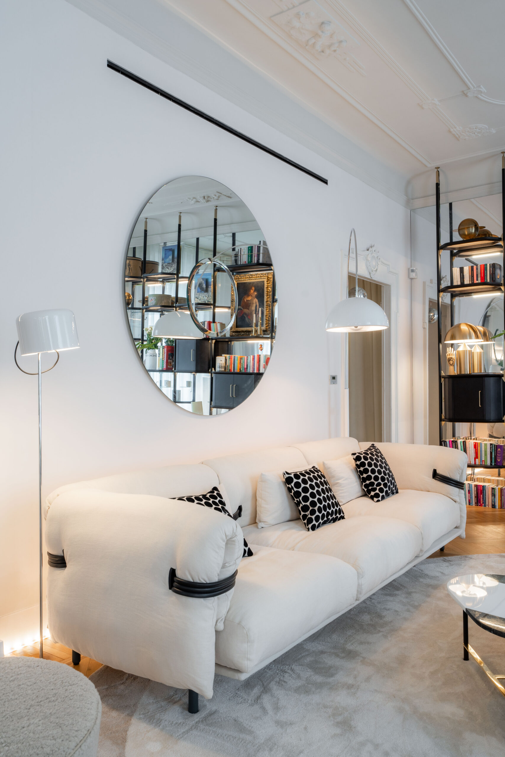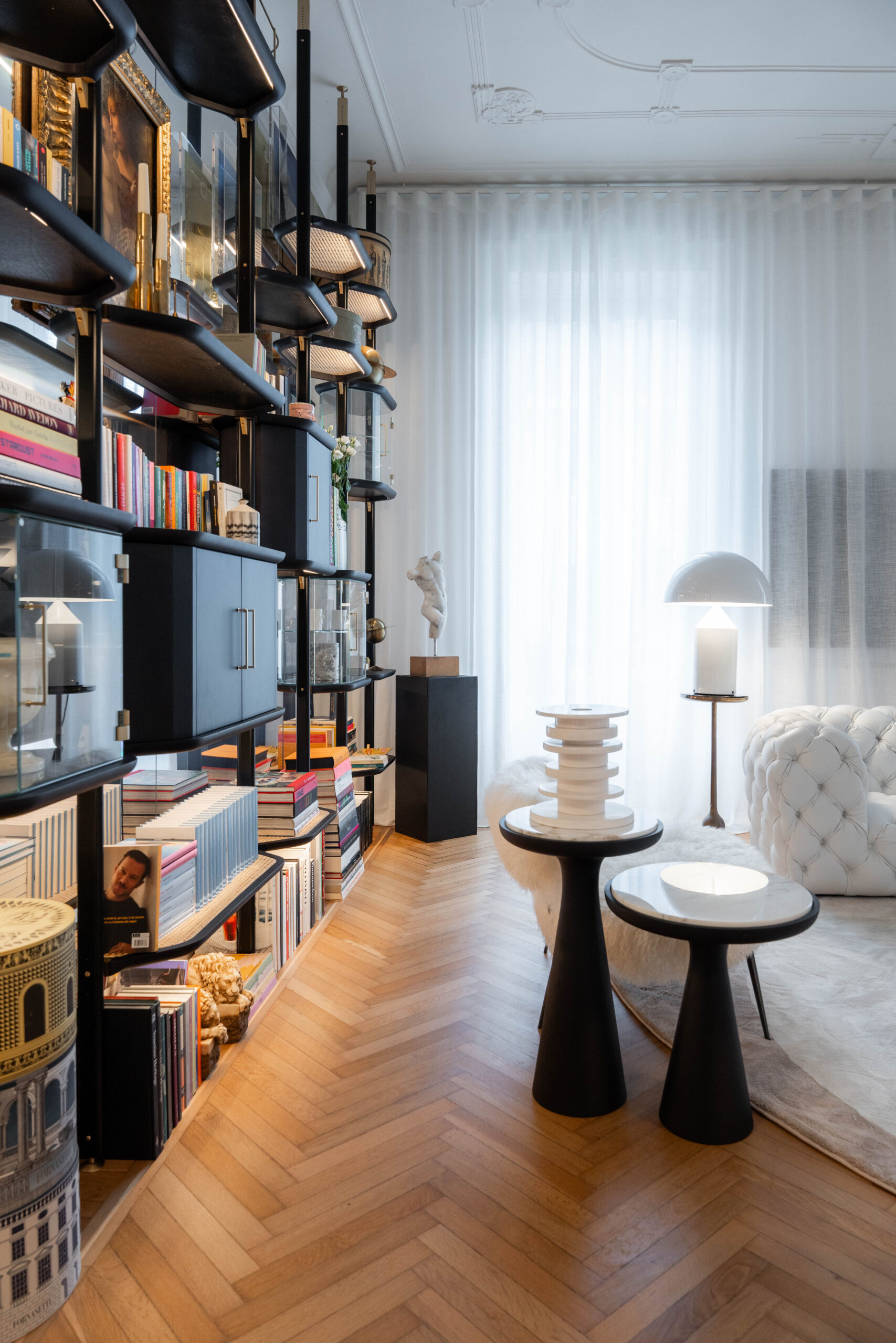 Nel soggiorno spiccano i divani Chester Moon di Baxter e Belt di Moroso circondati dalle poltroncine Nepal Mama di Baxter e pouf Audrey di Gallotti&Radice. Al centro sono stati collocati i tavolini Haumea, Cookies e Fante di Gallotti&Radice, il tutto dominato dalla grande libreria Libelle di Baxter, elemento che cattura lo sguardo e arricchisce l’insieme.