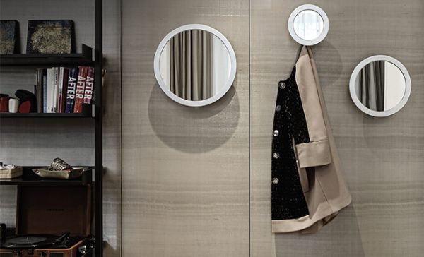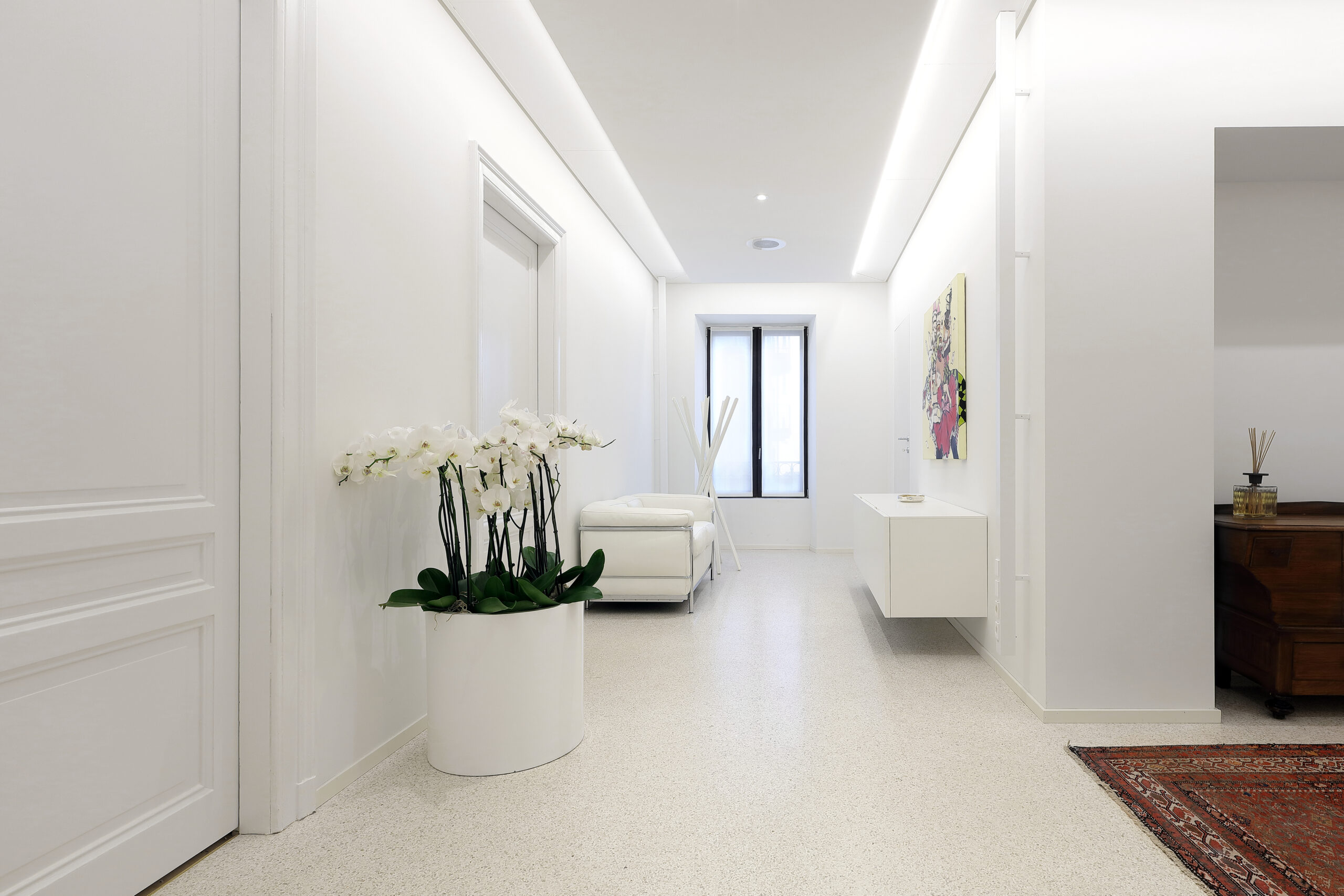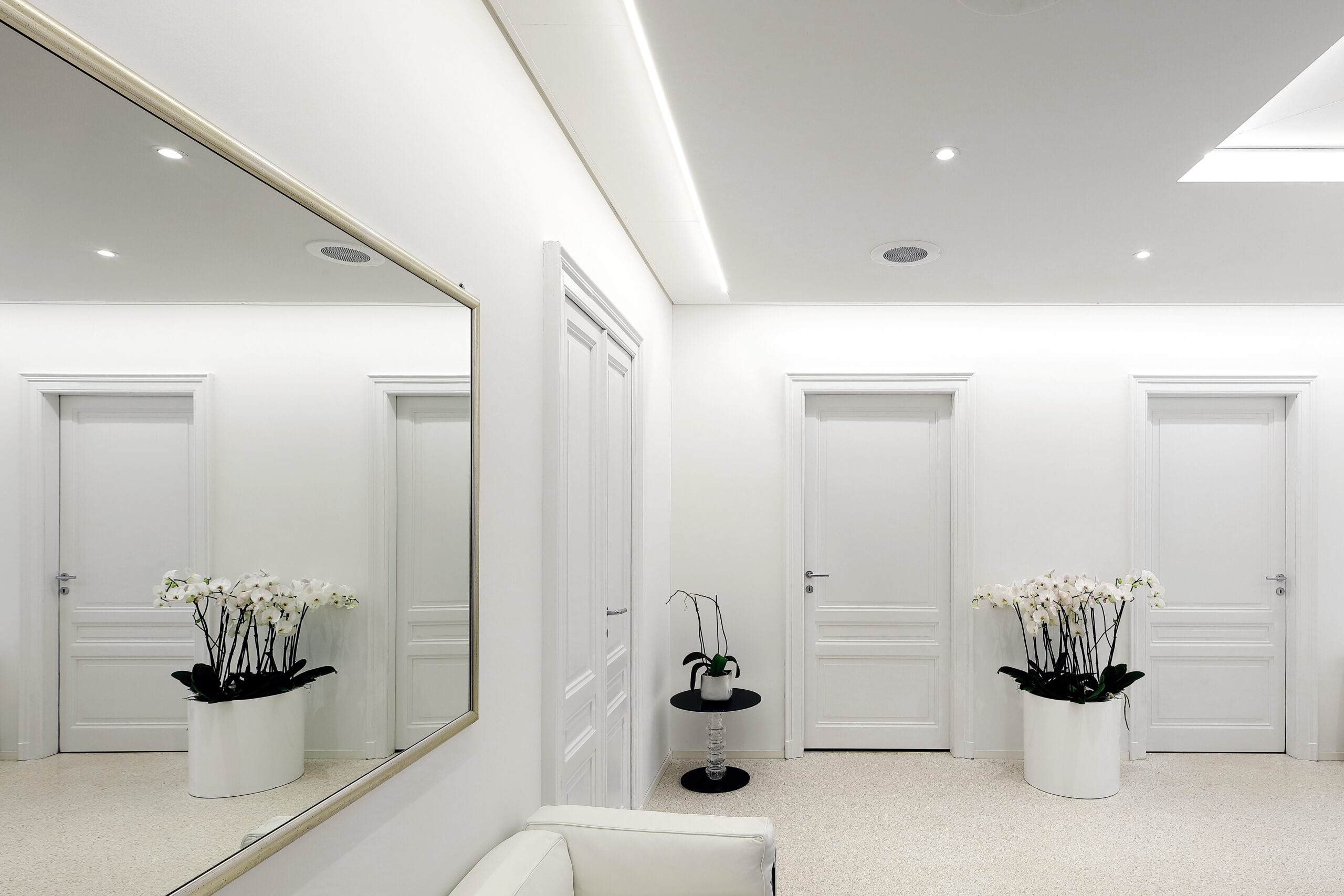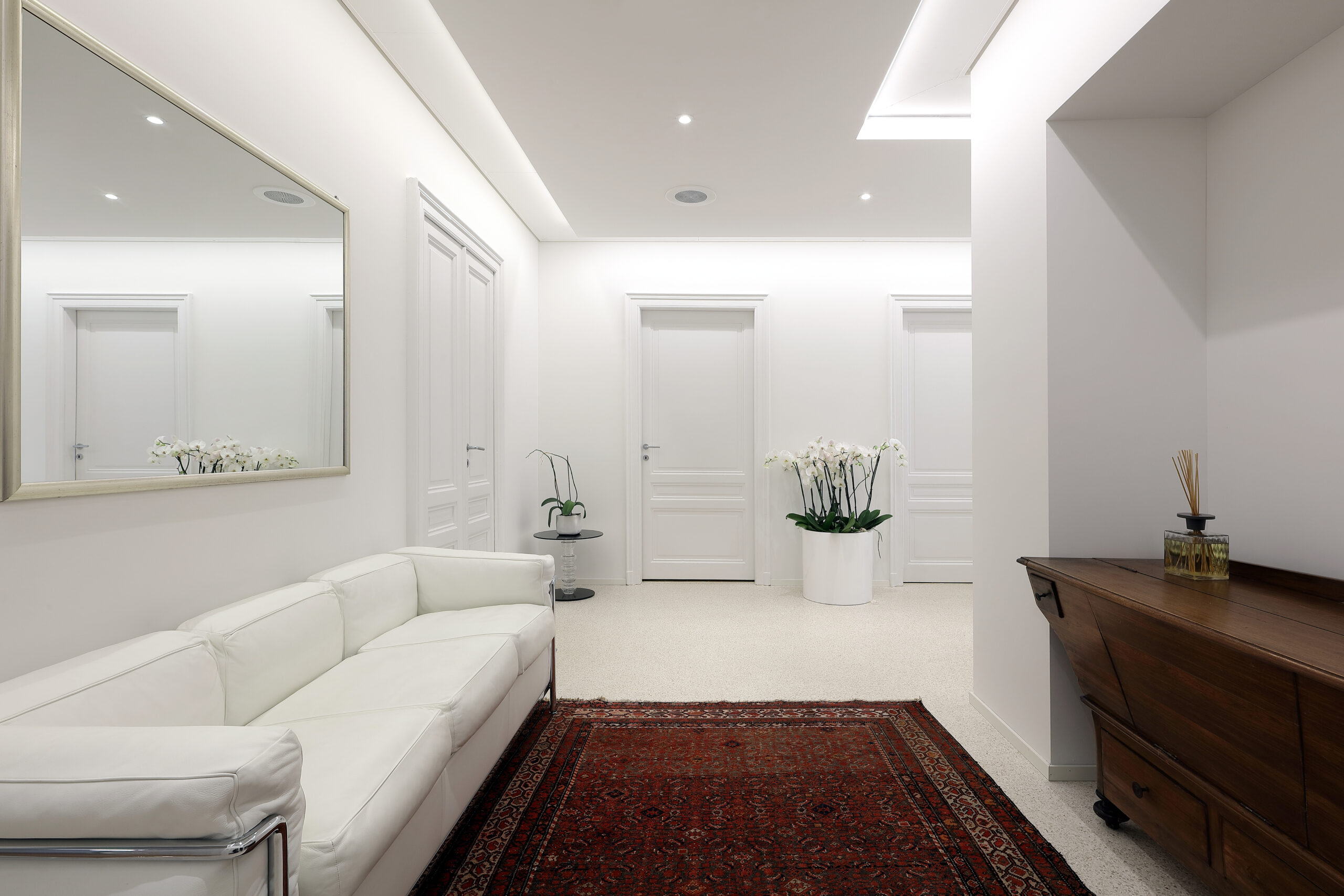 L’ampio vestibolo che funge da sala d’attesa è dominato dal colore bianco, ripreso anche in tutti gli arredi, tra cui il classico divano Cassina di Le Corbusier e l’appendiabiti Zanotta.