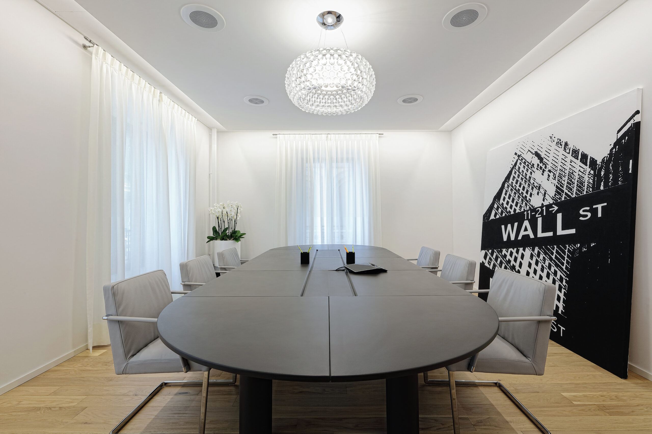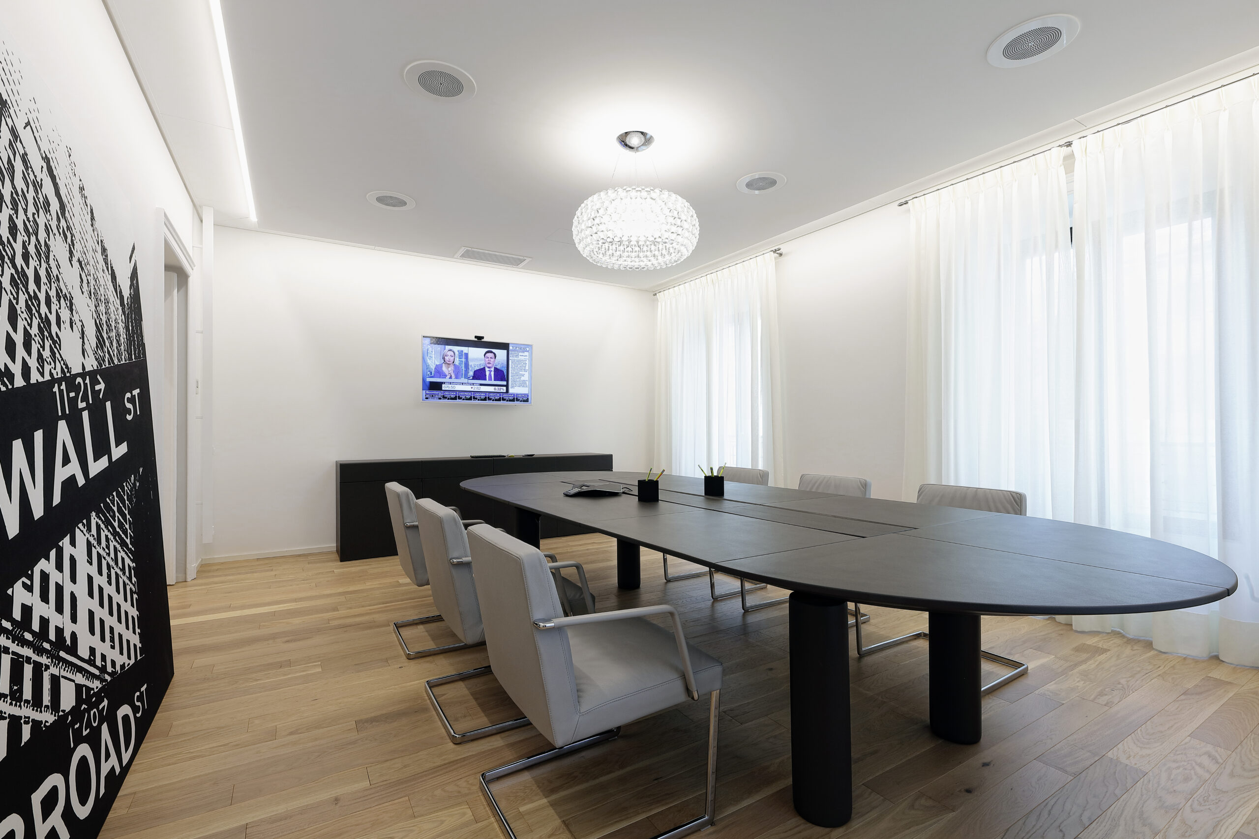 Per la sala riunioni, ampia e spaziosa, si è optato per l’uso della pregiata pelle Frau. Il lampadario è di Foscarini, mentre i tendaggi fanno parte delle collezioni Roberto Molteni.