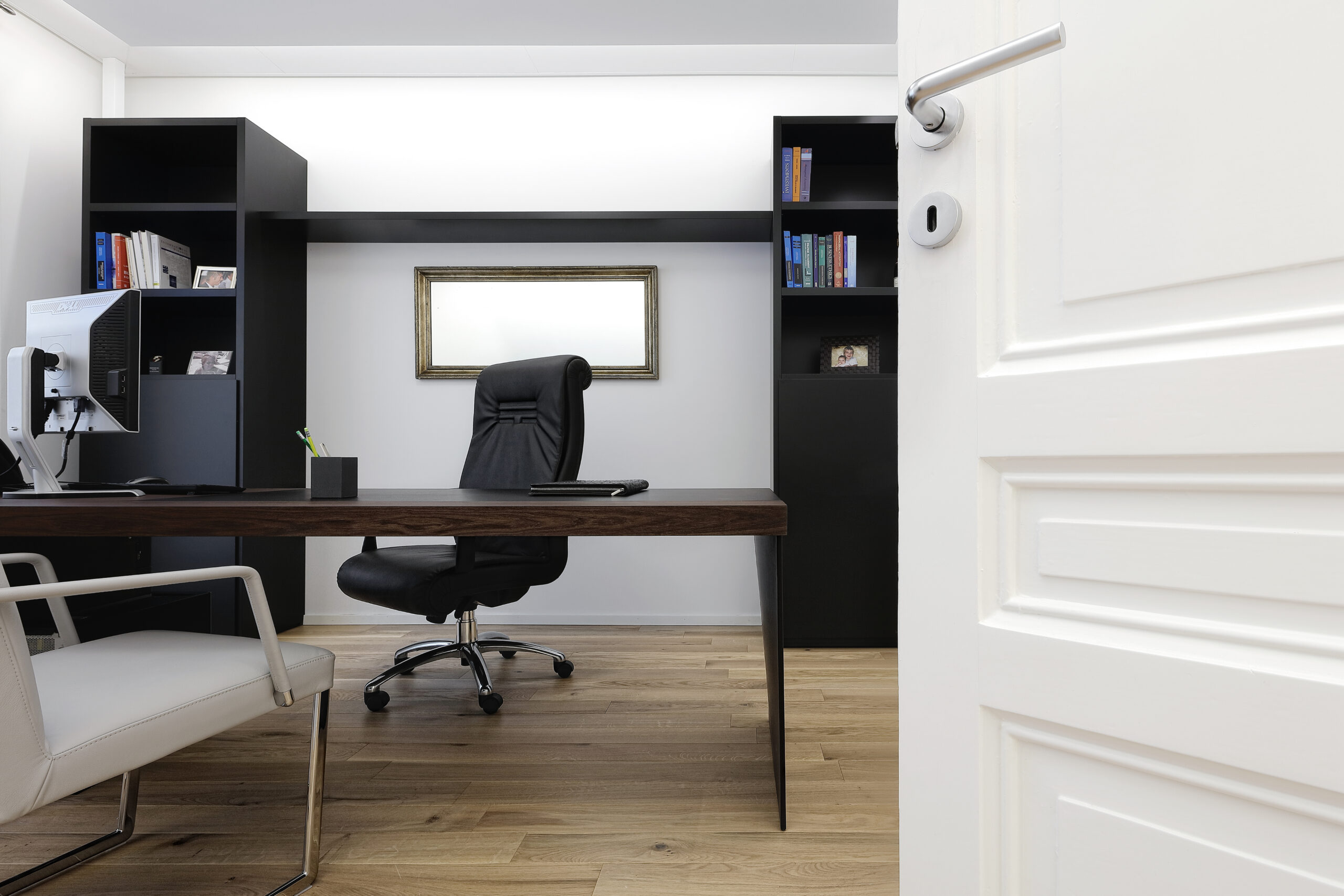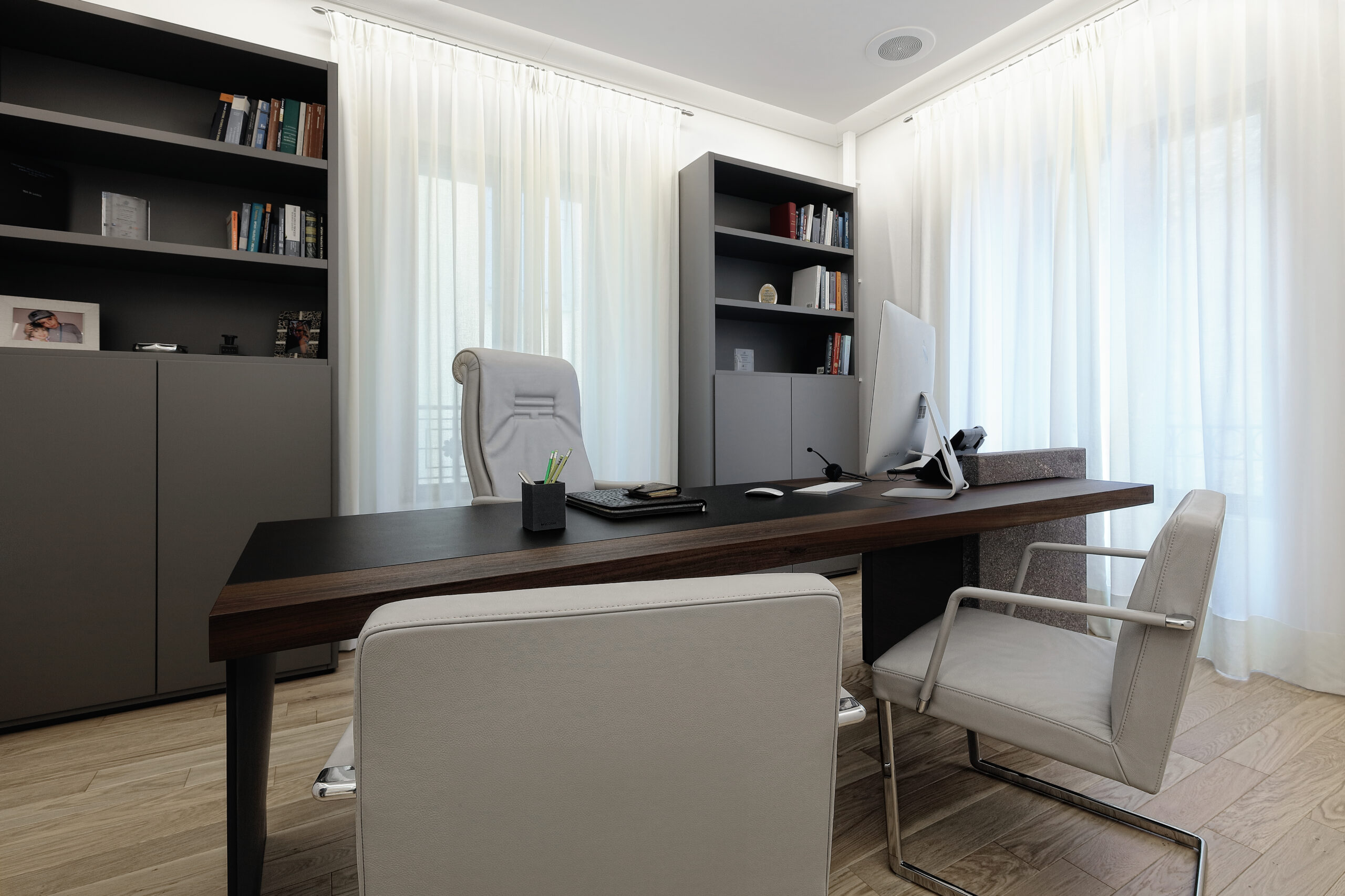 Gli uffici direzionali prevedono un ampio uso delle finiture in pelle. Abbiamo quindi utilizzato arredi della collezione Office di Poltrona Frau con librerie Poliform.