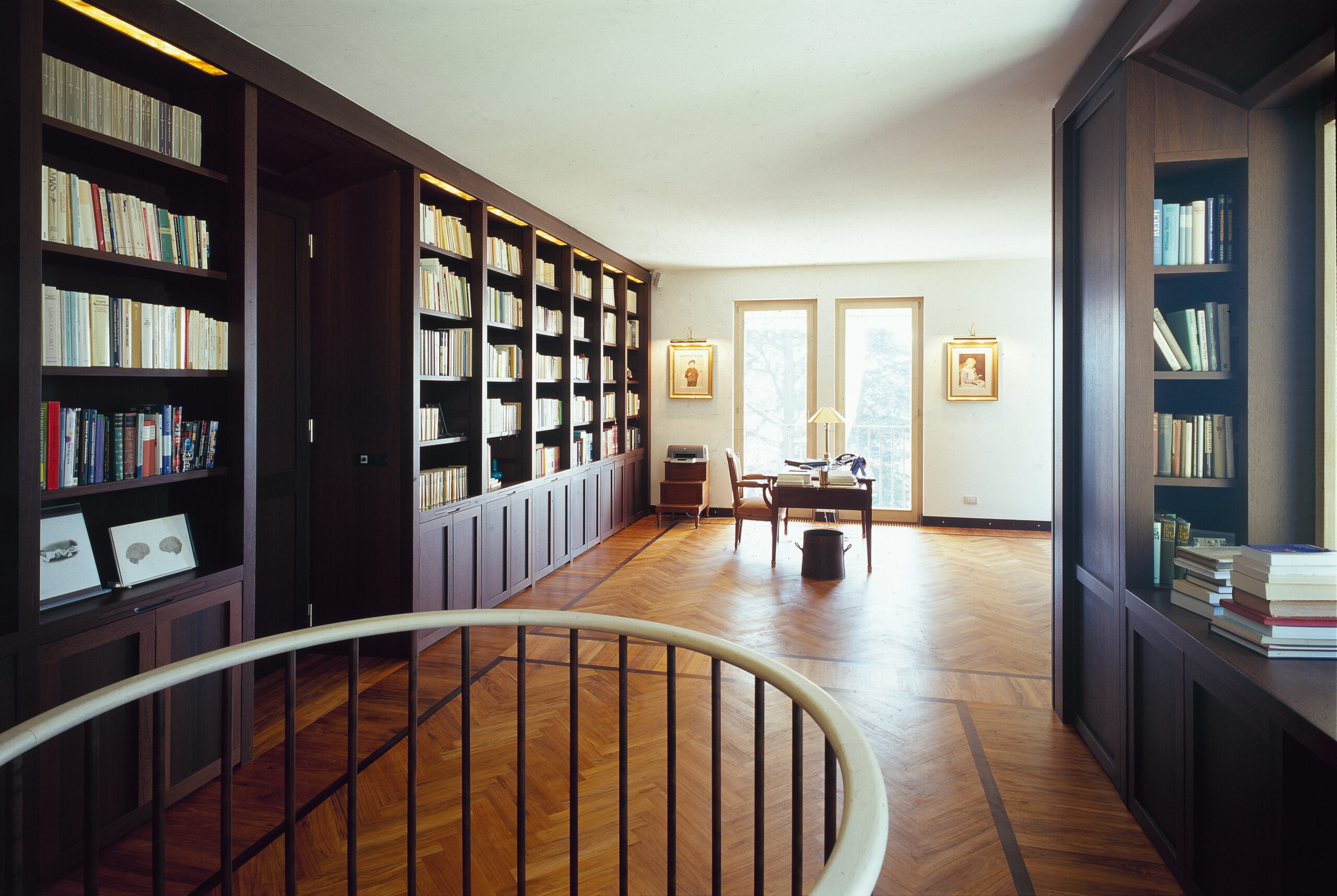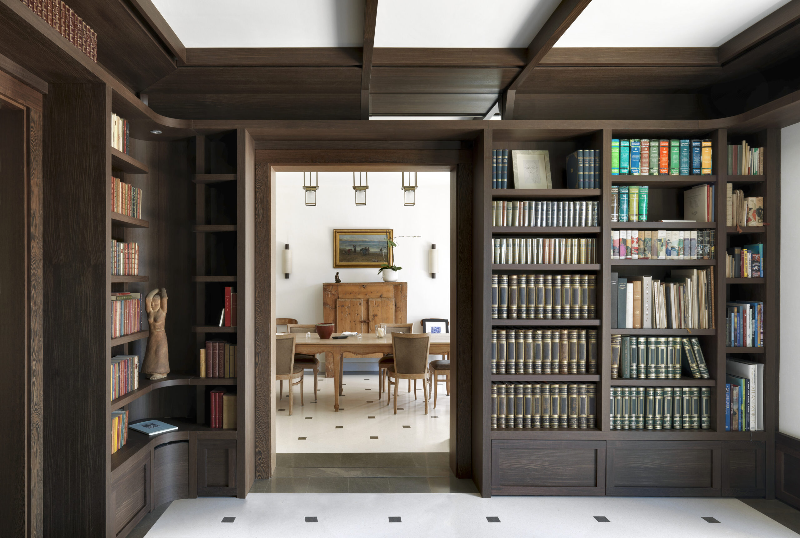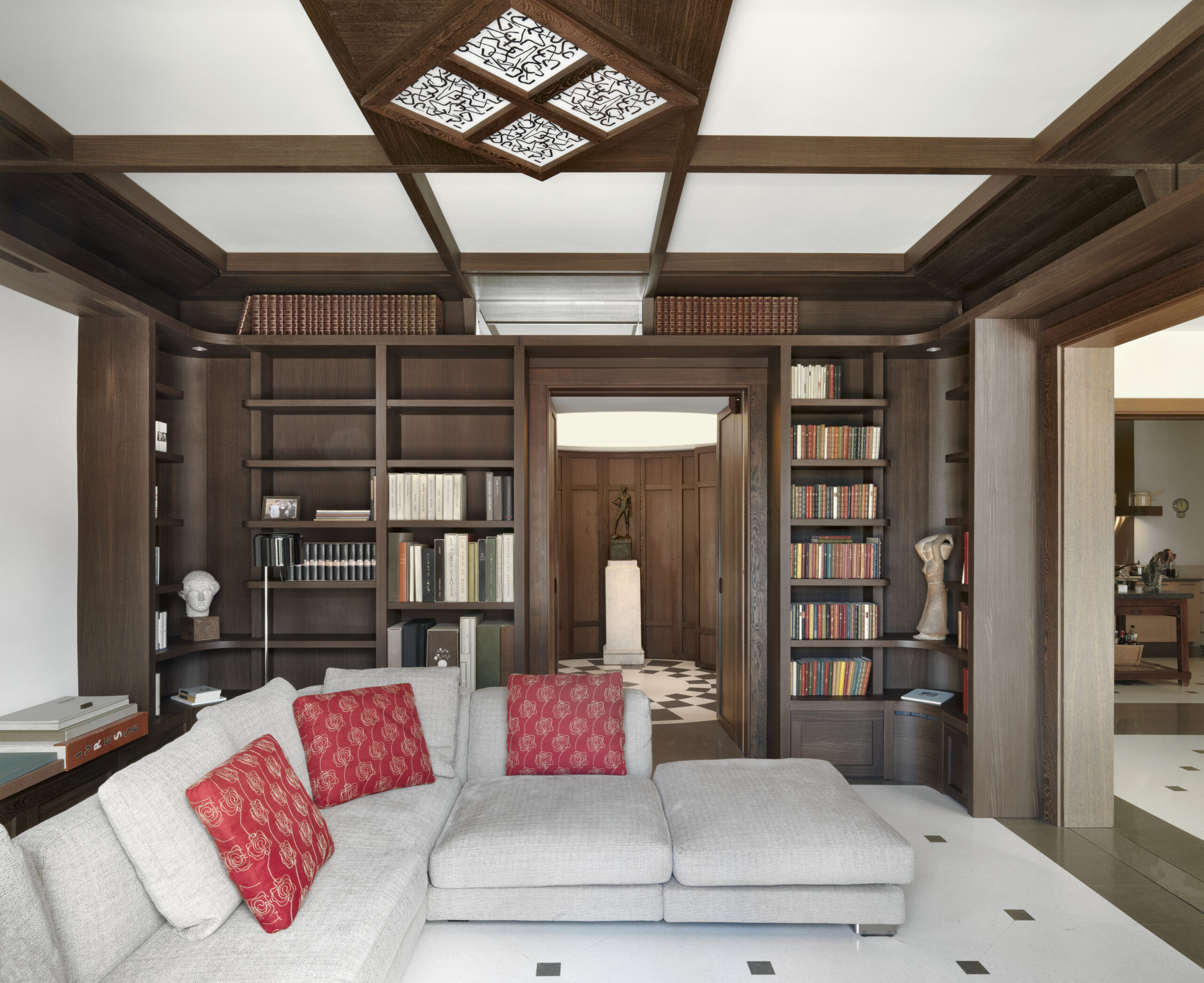 Nella zona biblioteca le librerie a misura, in legno di wengè naturale, e la reinterpretazione del soffitto a cassettoni si completano con le presenze moderne degli imbottiti Flexform.