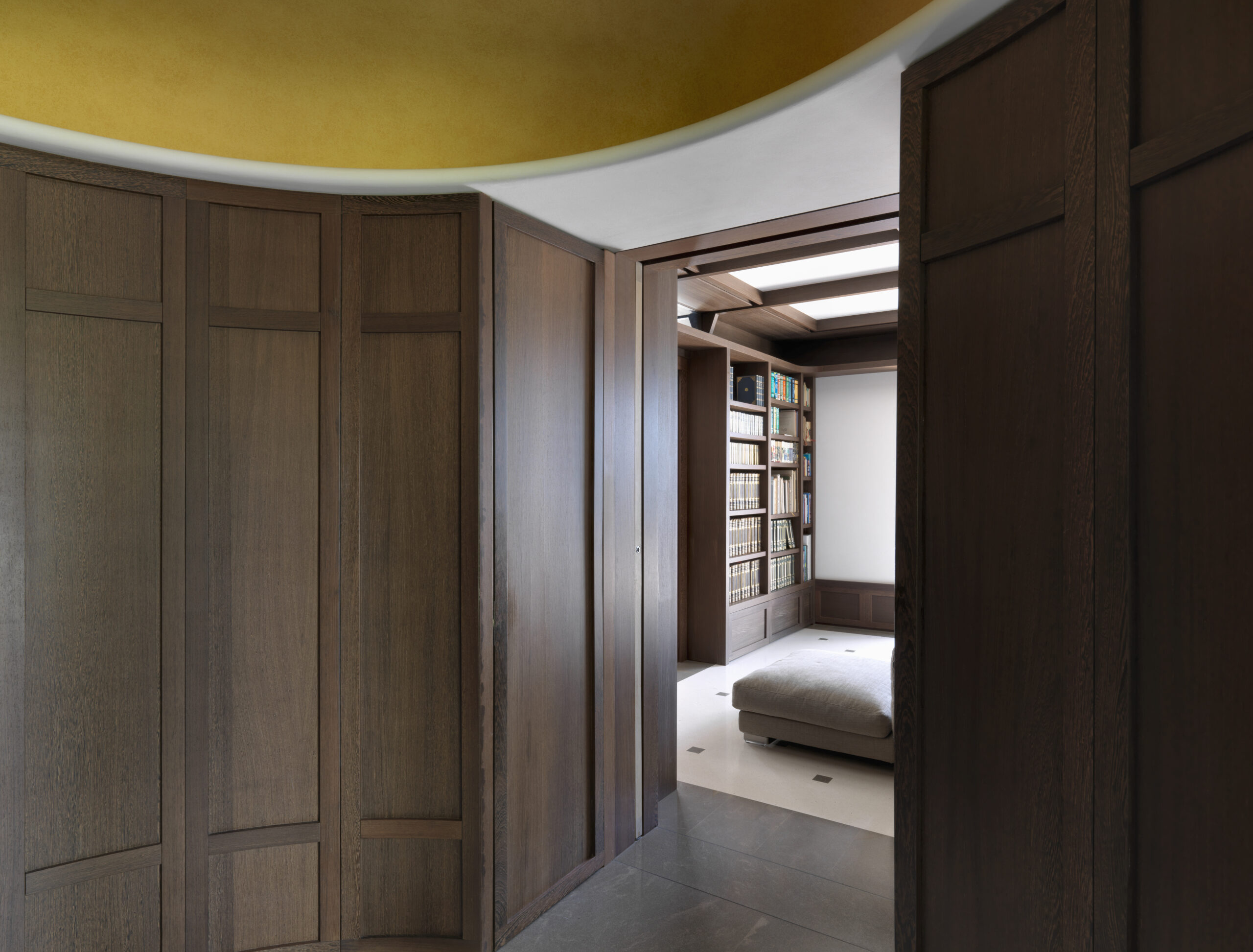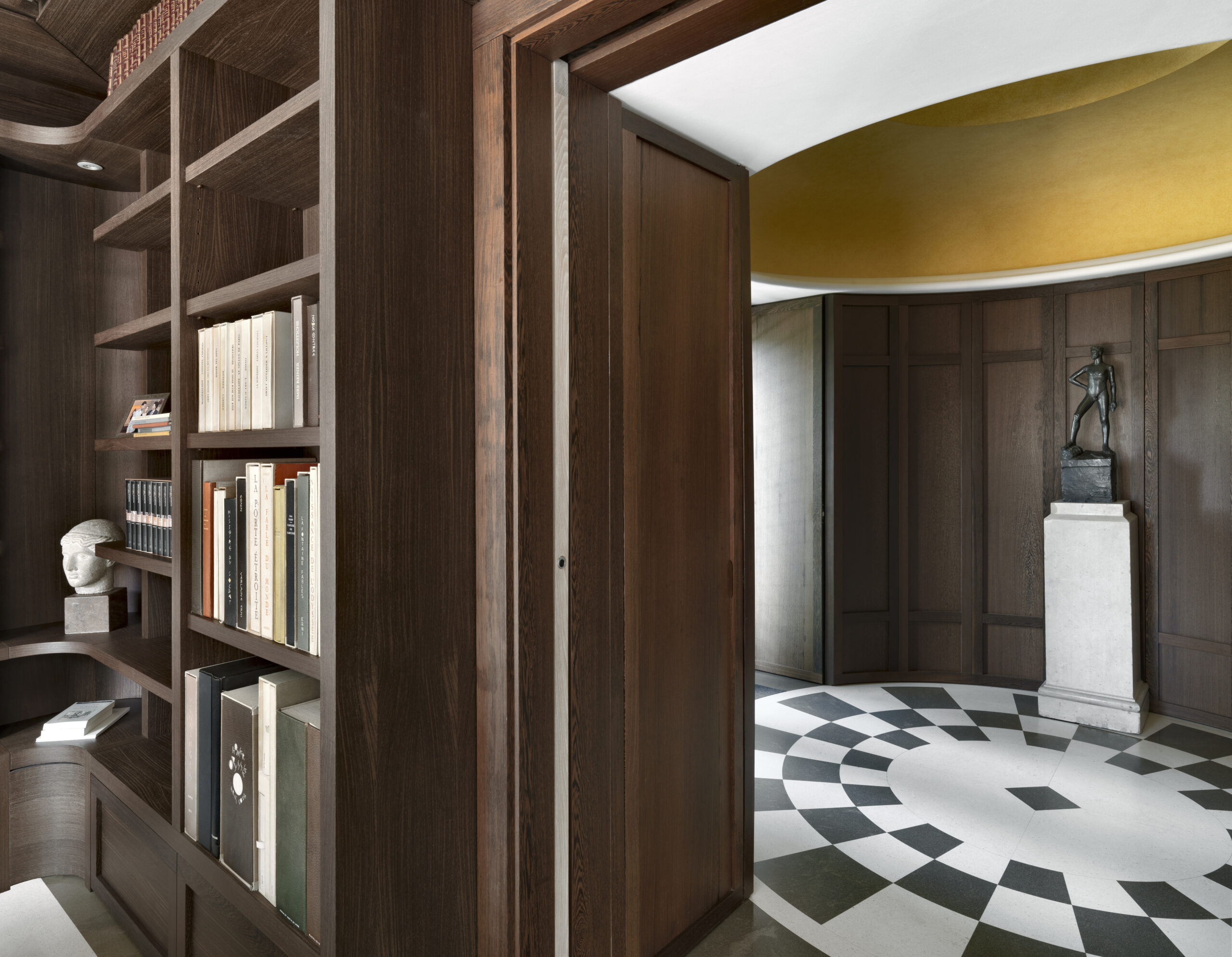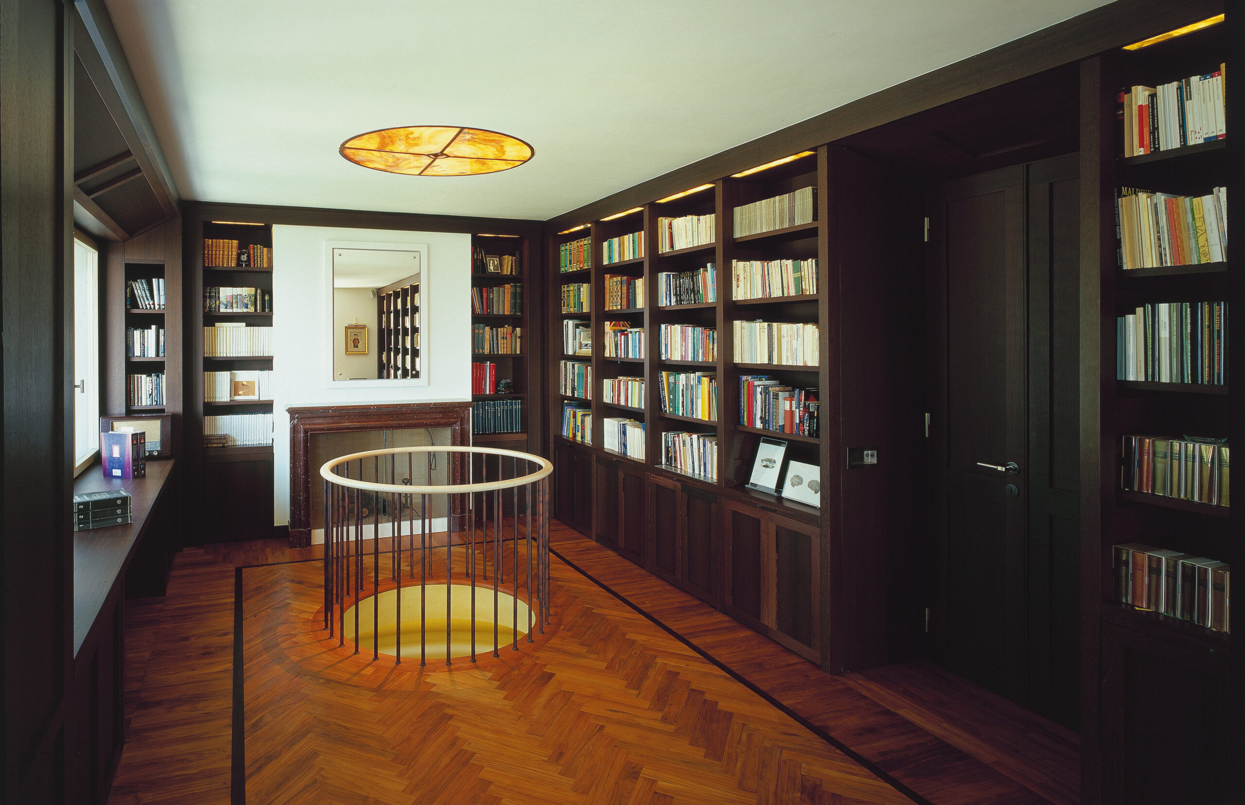 Nella zona biblioteca le librerie a misura, in legno di wengè naturale, e la reinterpretazione del soffitto a cassettoni si completano con le presenze moderne degli imbottiti Flexform.