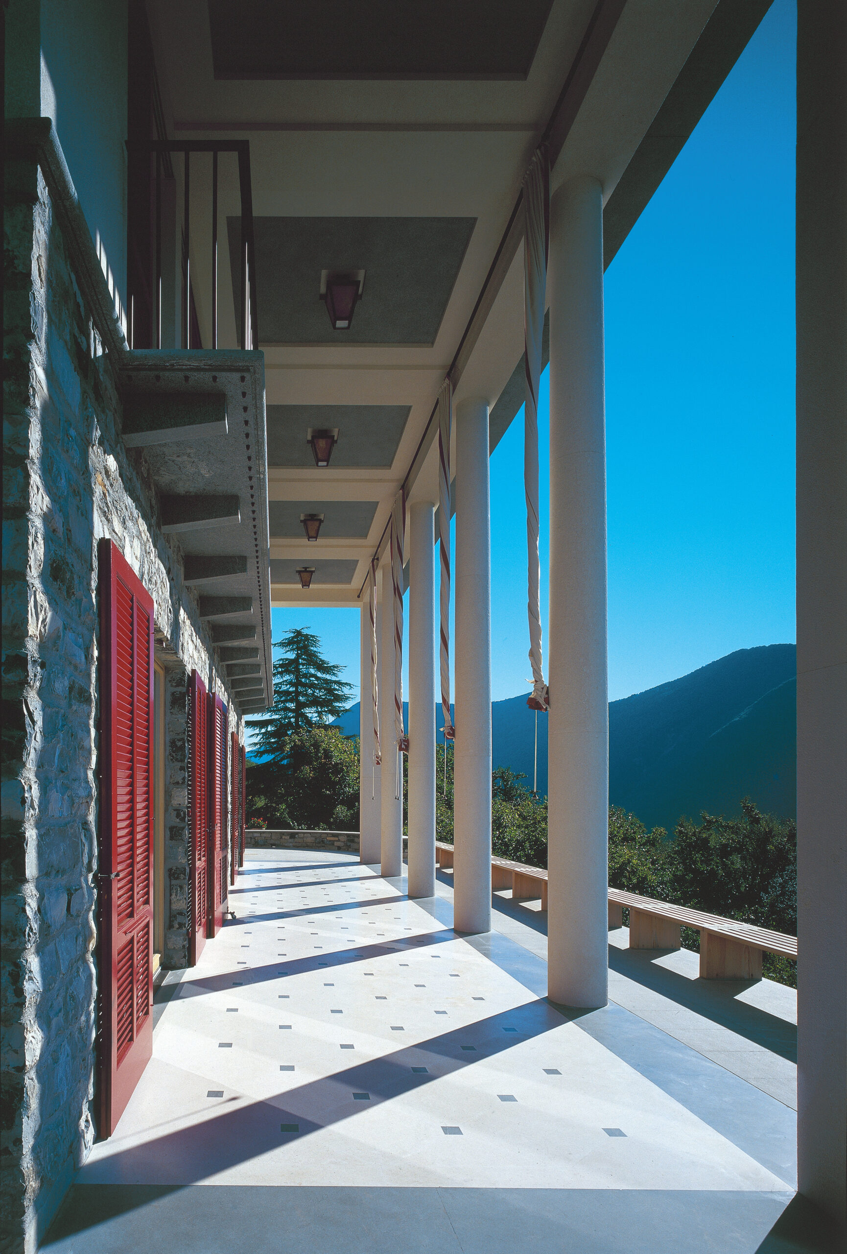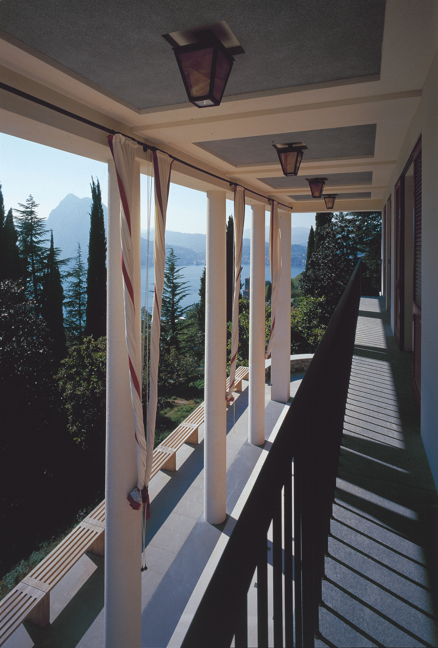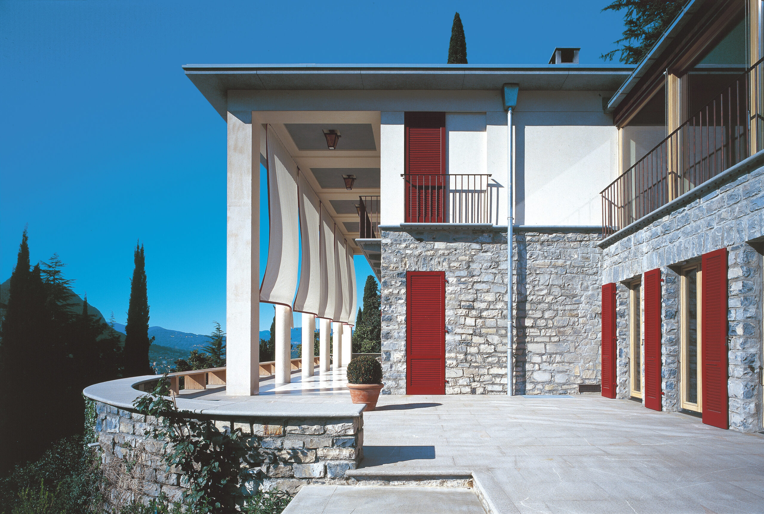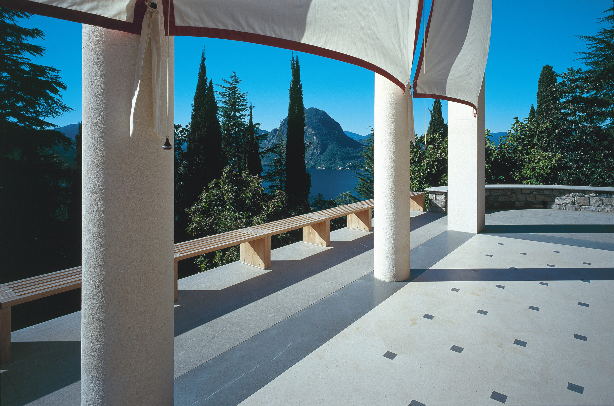 La facciata prospiciente il lago è stata personalizzata attraverso l’inserimento di ampi drappi di tessuto con funzione di tendaggi esterni per schermare la villa dal sole, sul modello dei vecchi tendoni delle ville d’epoca. Una lunga panca in teak realizzata dai nostri laboratori delimita e incornicia il porticato.