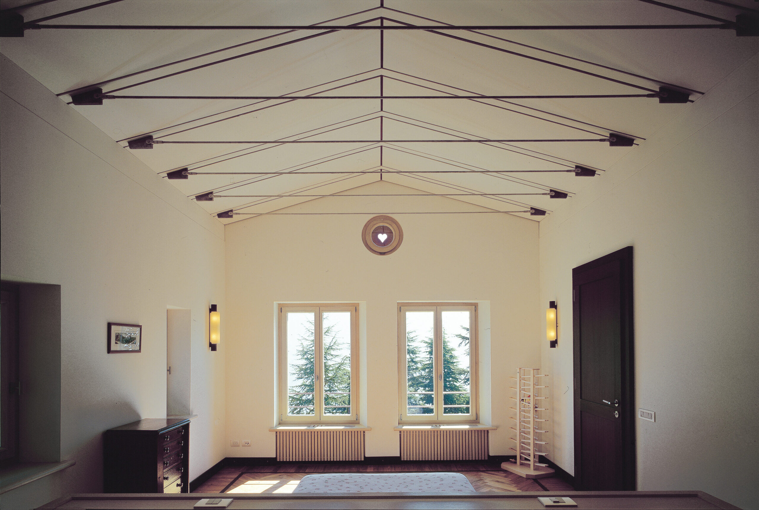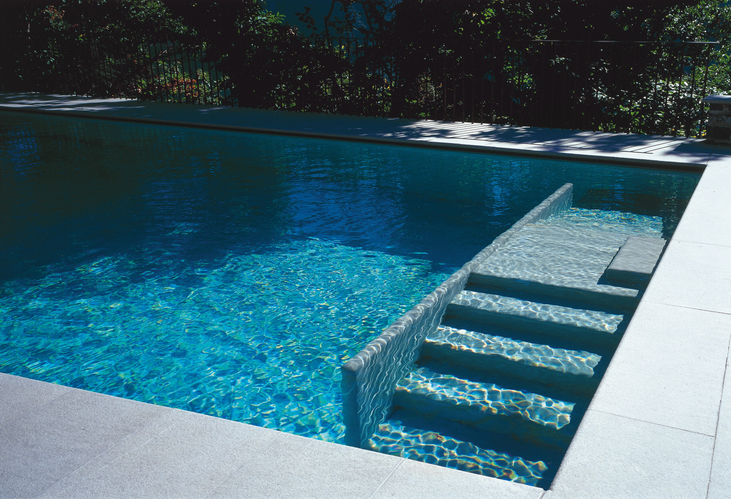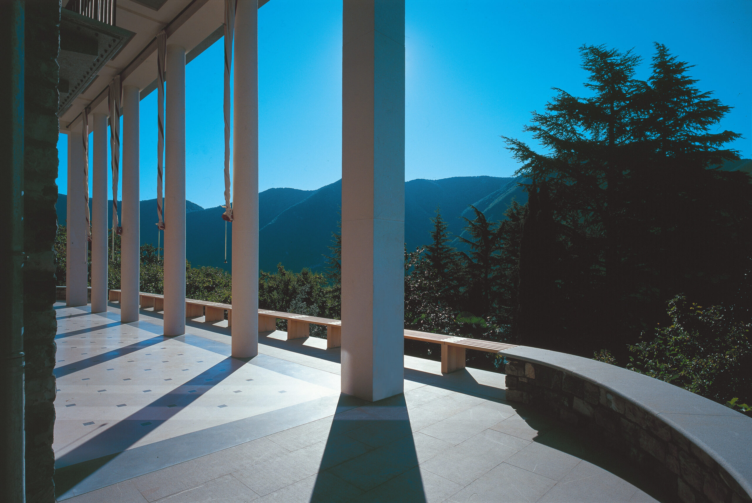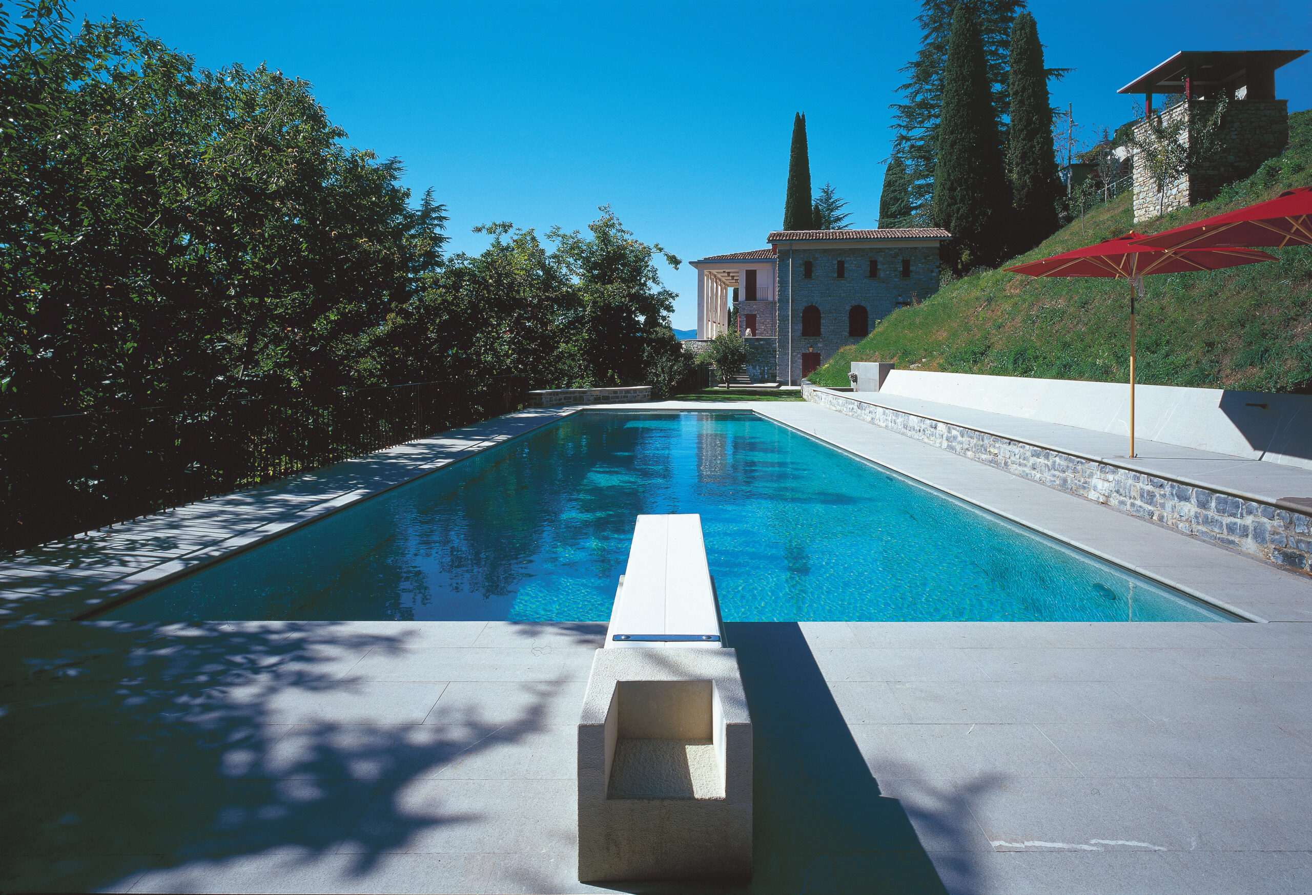 La facciata prospiciente il lago è stata personalizzata attraverso l’inserimento di ampi drappi di tessuto con funzione di tendaggi esterni per schermare la villa dal sole, sul modello dei vecchi tendoni delle ville d’epoca. Una lunga panca in teak realizzata dai nostri laboratori delimita e incornicia il porticato.