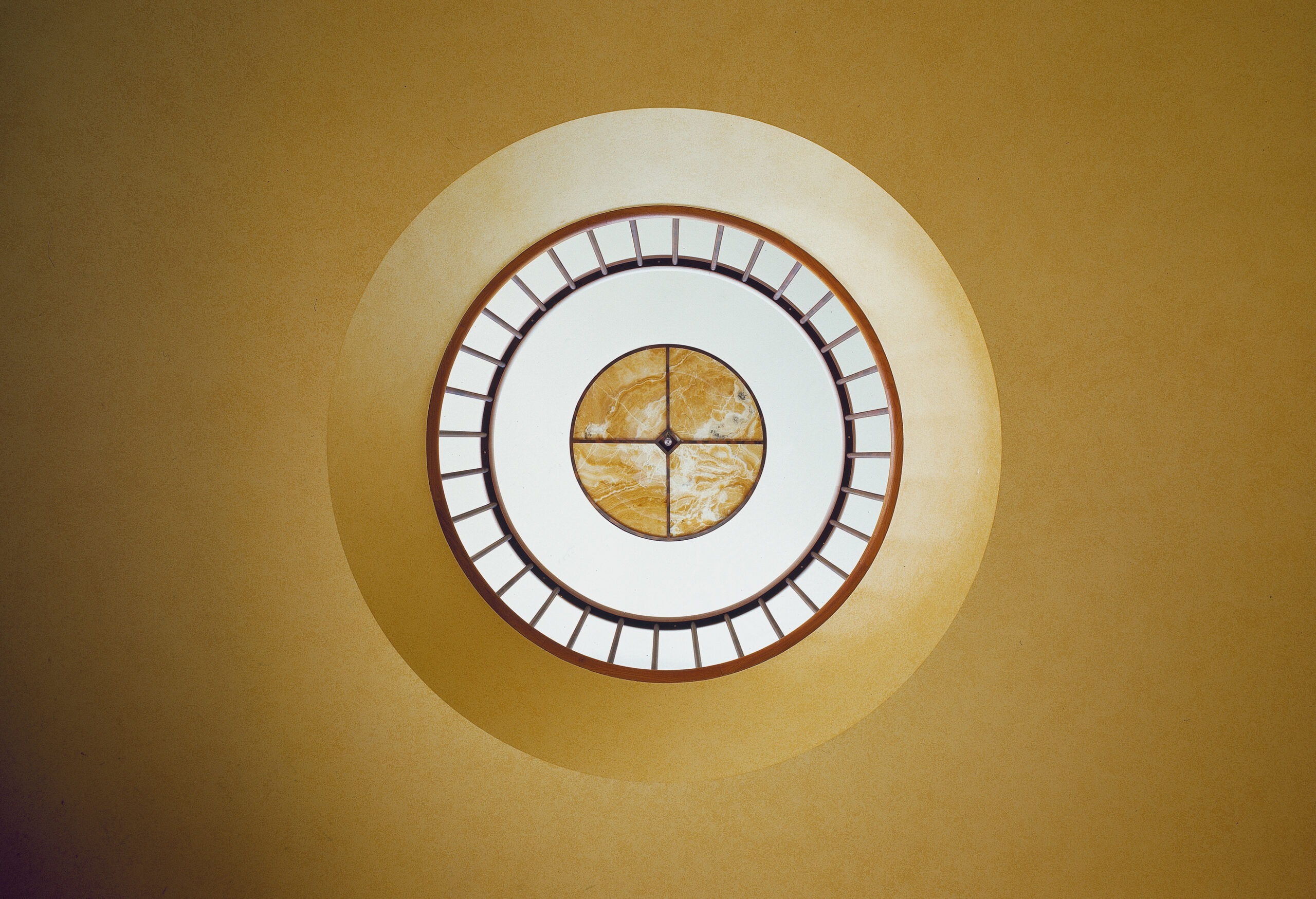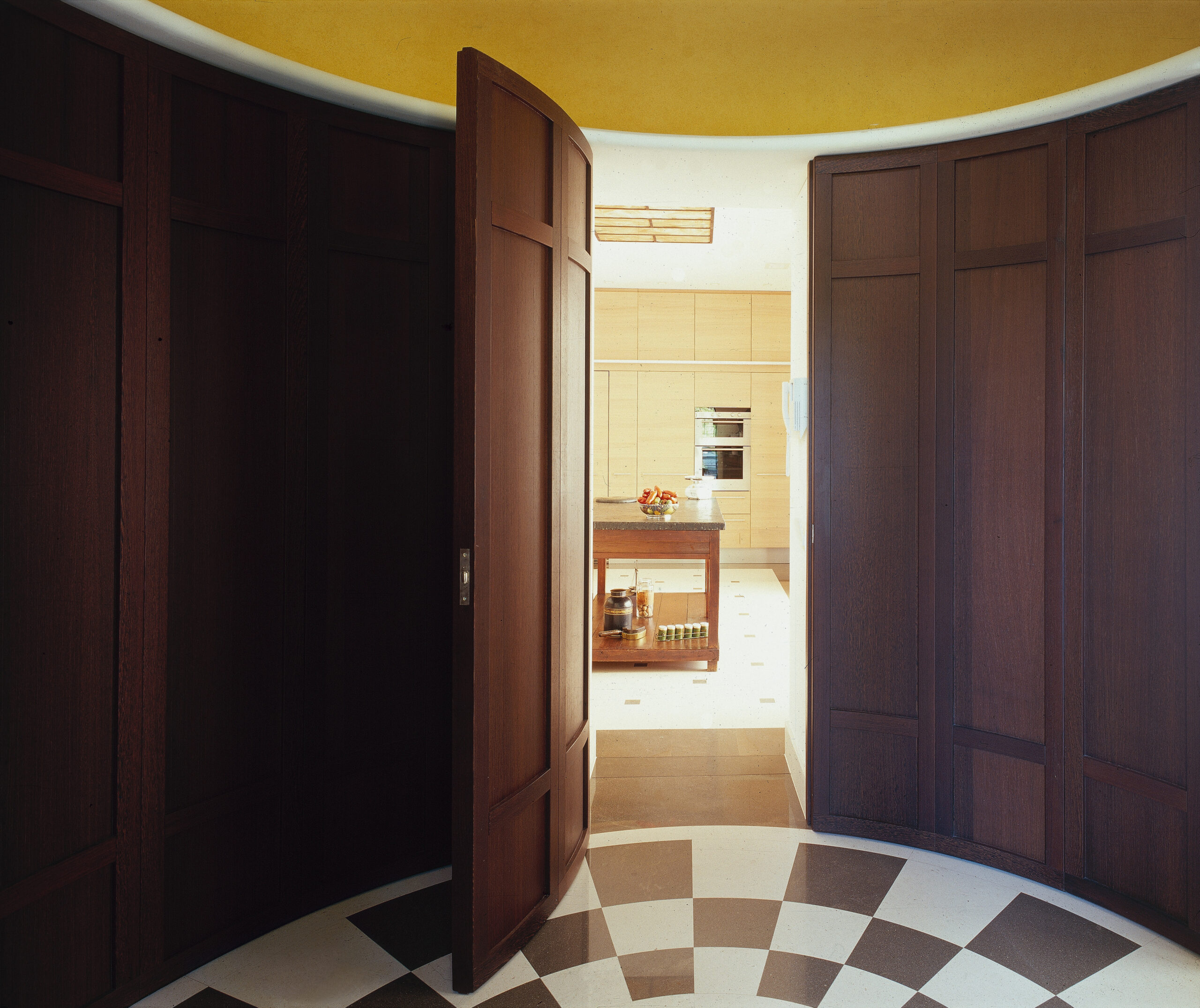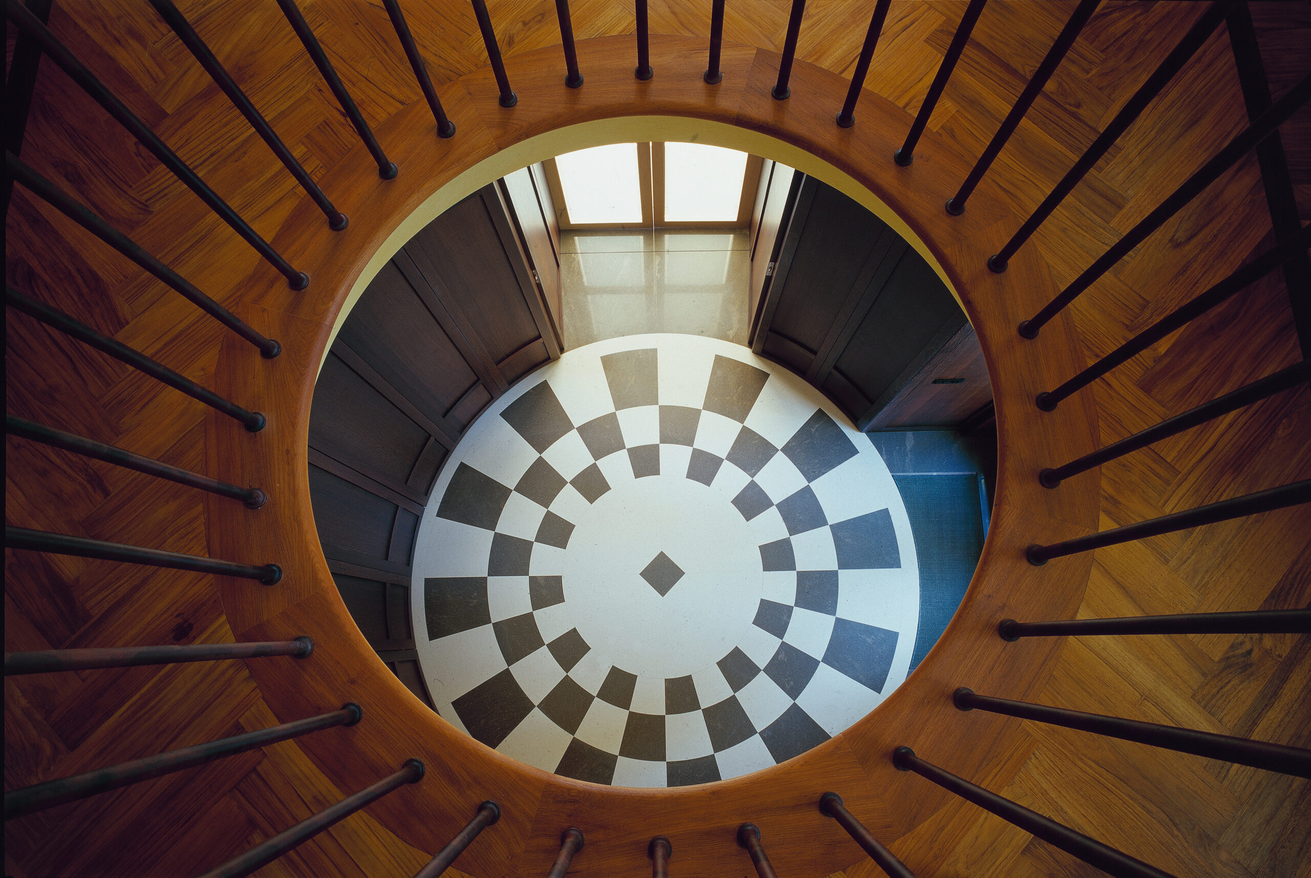 La hall d’ingresso si sviluppa su una pianta circolare in cui al pavimento a scacchiera e alle boiserie perimetrali corrisponde l’apertura circolare della balaustra al piano superiore, che a sua volta prende luce dal lucernario con lastre in onice.