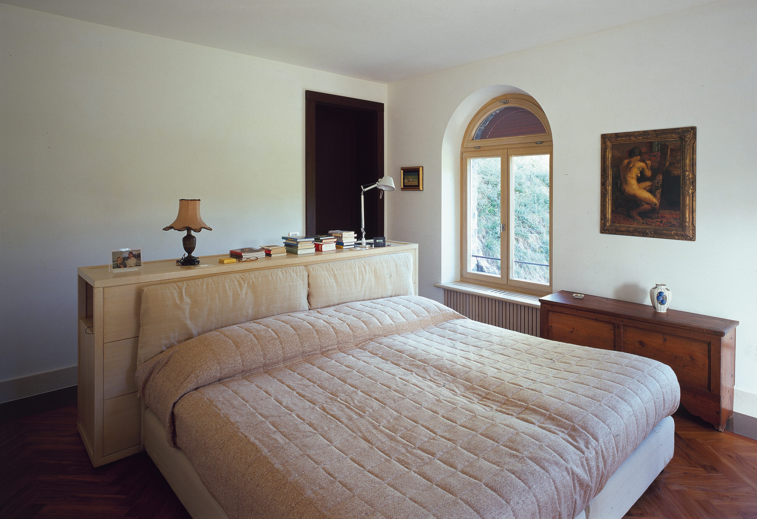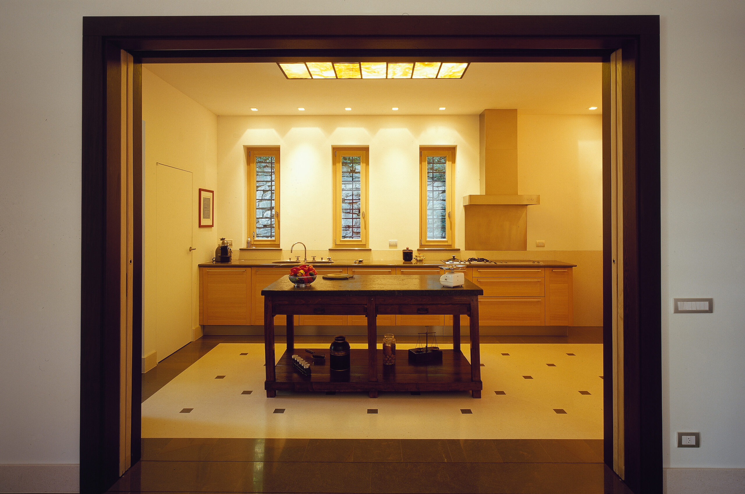 La boiserie circolare dell’ingresso si apre sulla generosa zona cucina in cui al tradizionale bancone centrale si contrappongono i minimalisti prodotti di Varenna Cucine in rovere sbiancato.