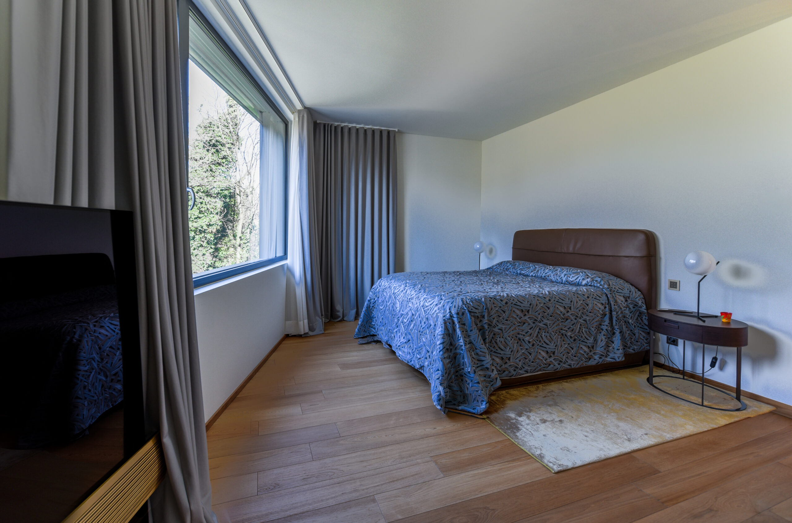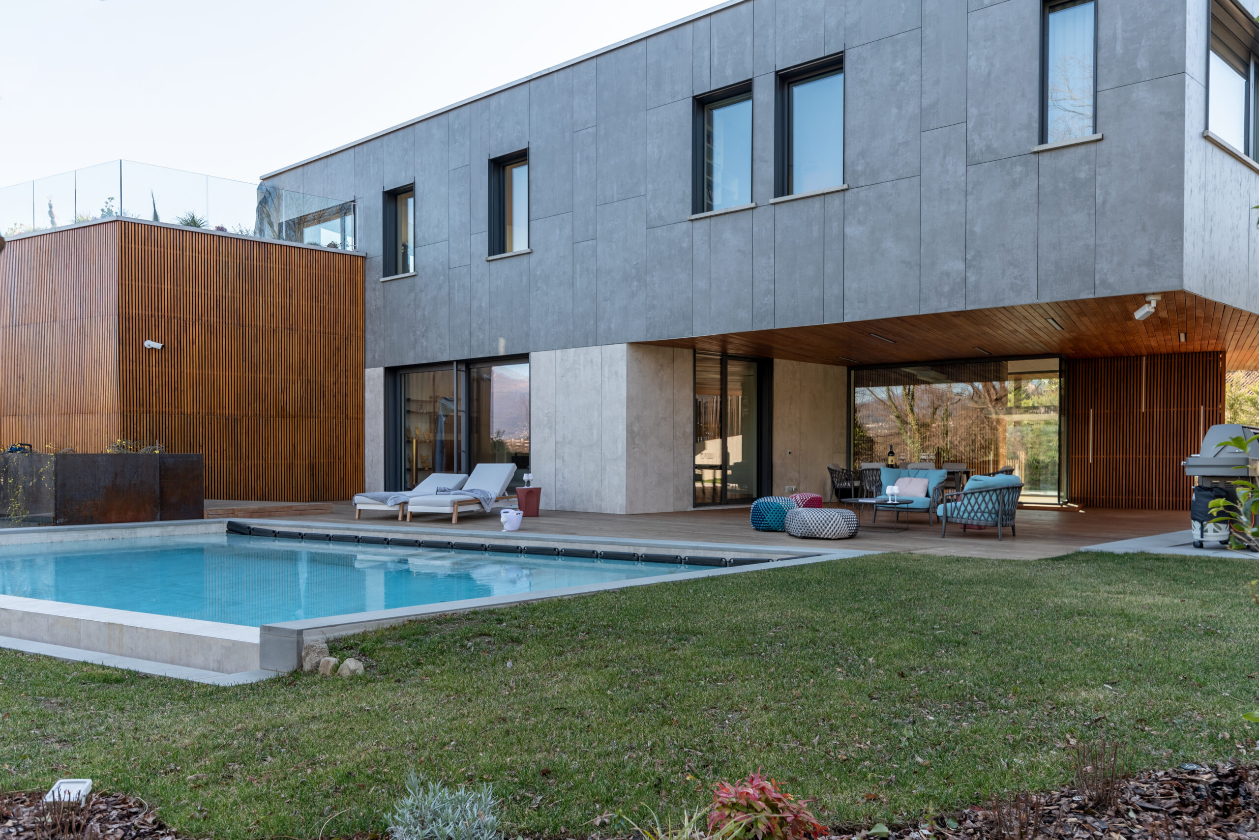 A poca distanza dal centro storico di Lugano, lungo un dolce pendio affacciato sul lago e circondato da rigogliosi alberi decidui, nasce una villa che sviluppa un’idea innovativa di architettura residenziale, nata dalla collaborazione tra un pool di investitori svizzeri e gli architetti Pier Massimo Cinquetti e Benedetto Camerana. L’edificio è caratterizzato da forme geometriche semplici, interne ed esterne, che risolvono armoniosamente il dialogo con la natura circostante attraverso l’utilizzo di materiali tipici dell’architettura della zona del Ticino e ampie superfici vetrate per enfatizzare la vista verso il lago e il bosco.