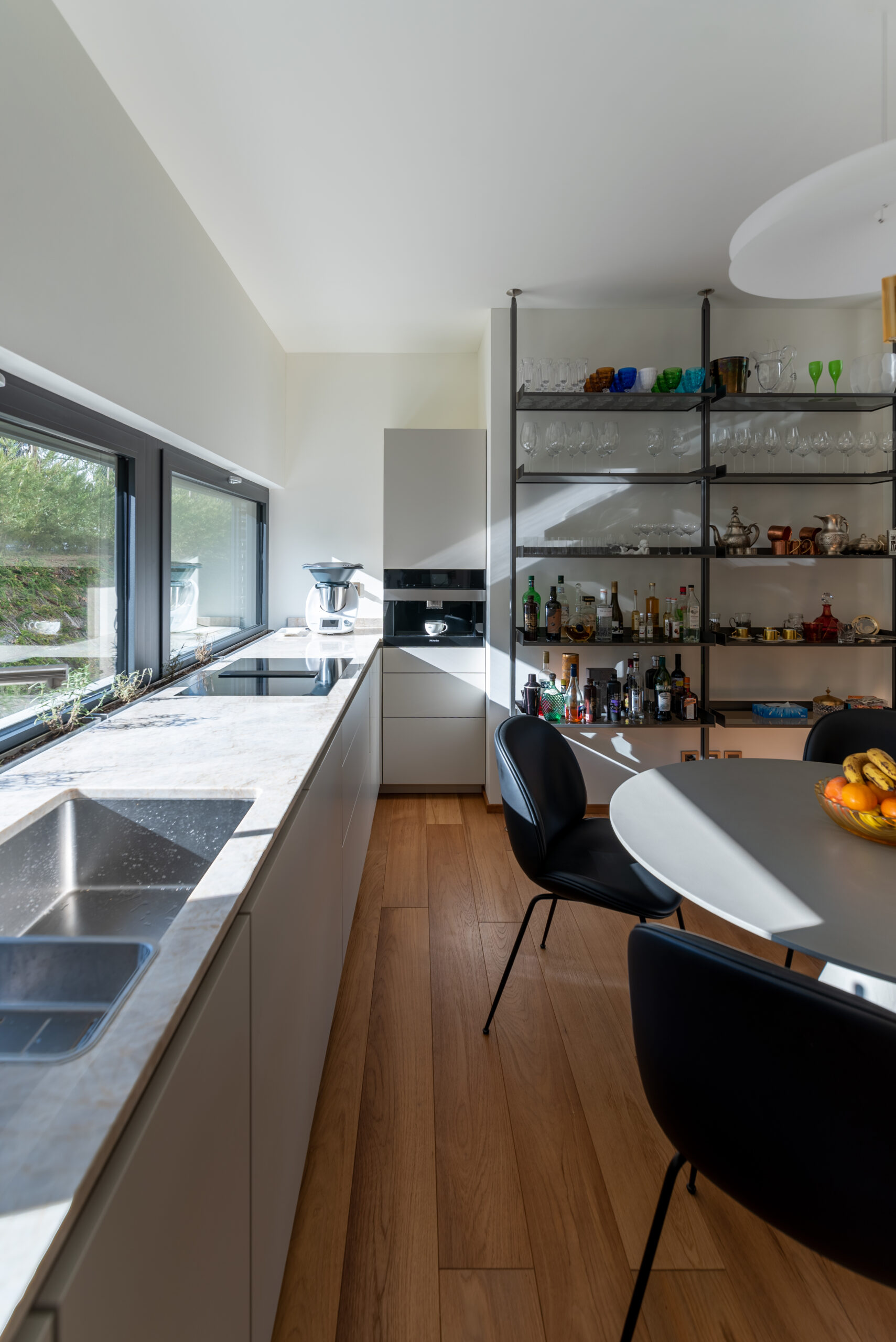 Per l’arredo della zona giorno del piano terra sono stati selezionati alcuni pezzi del marchio Cassina, caratterizzati da uno stile distintivo e potente. Il sistema Zenit di Rimadesio incornicia l’elegante area living, oltre la quale si estende la zona notte. Lo spazio cucina ospita un tavolo Desalto e sedie Gubi, ideali per un ambiente più intimo e familiare. Un assortimento di lampade Flos crea armoniosi punti luce accanto agli imbottiti e sopra il tavolo Cassina.