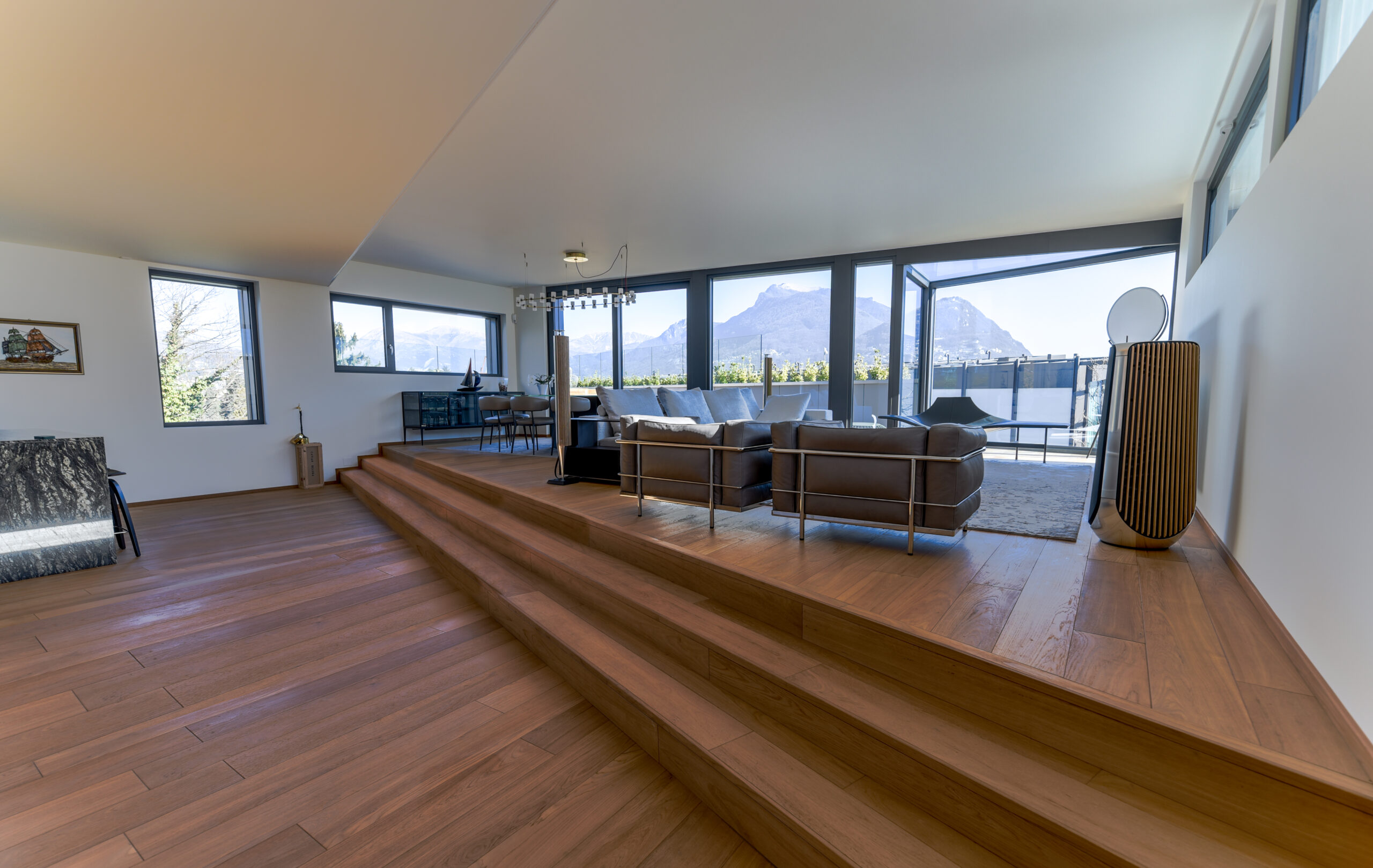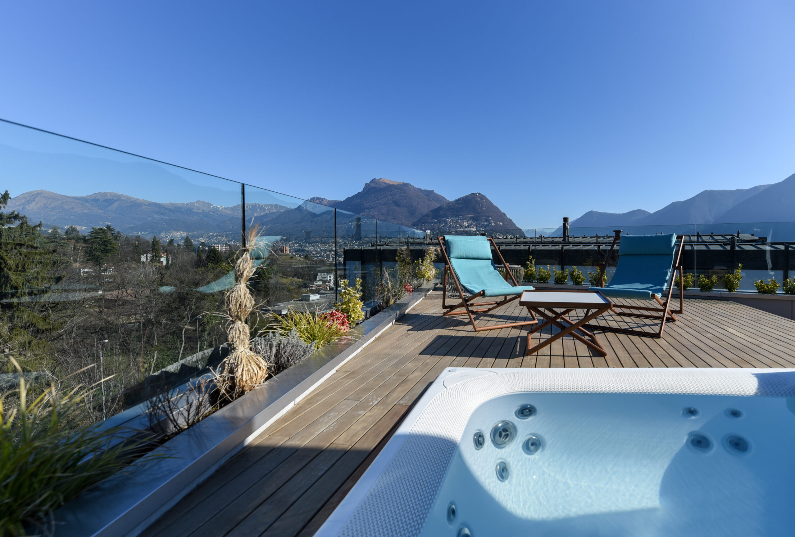 Dall’ampia area giorno si accede a un terrazzo adibito a solarium, dove una vasca idromassaggio e una coppia di sdraio Paola Lenti invitano a concedersi un po’ di svago all’aria aperta. Da qui il paesaggio offre il suo spunto migliore, permettendo alla vista di spaziare fra colline e paesaggi mozzafiato a ogni ora del giorno e della notte.