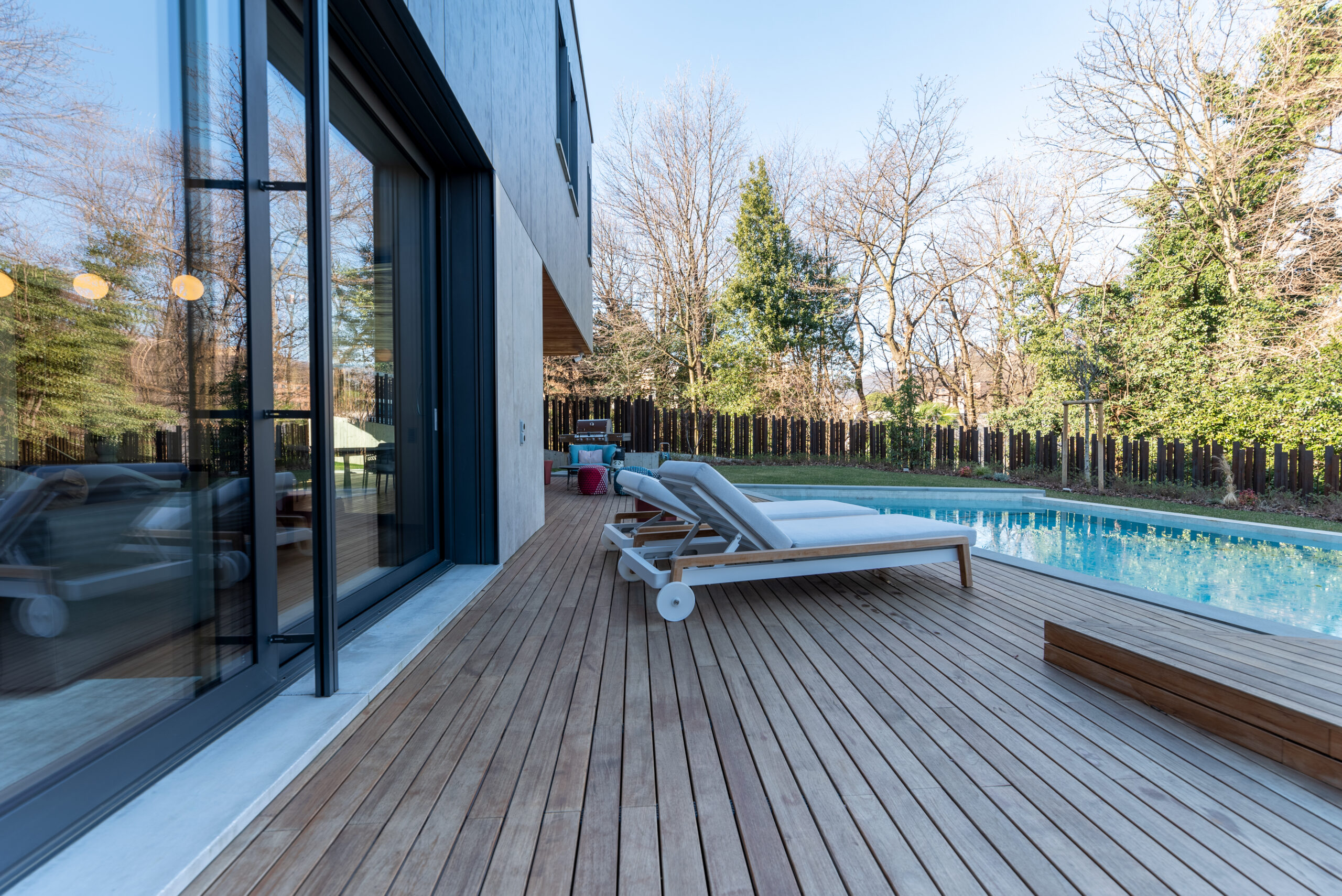 All’esterno, il giardino privato parla un linguaggio coerente con la natura circostante e cinge e dona privatezza assoluta alla piscina. In questo contesto dominato dall’ampia vista e dalla sensazione di intimità sono state collocate poltrone e pouf di B&B Italia dai colori vivaci oltre a due lettini Paola Lenti a bordo piscina.