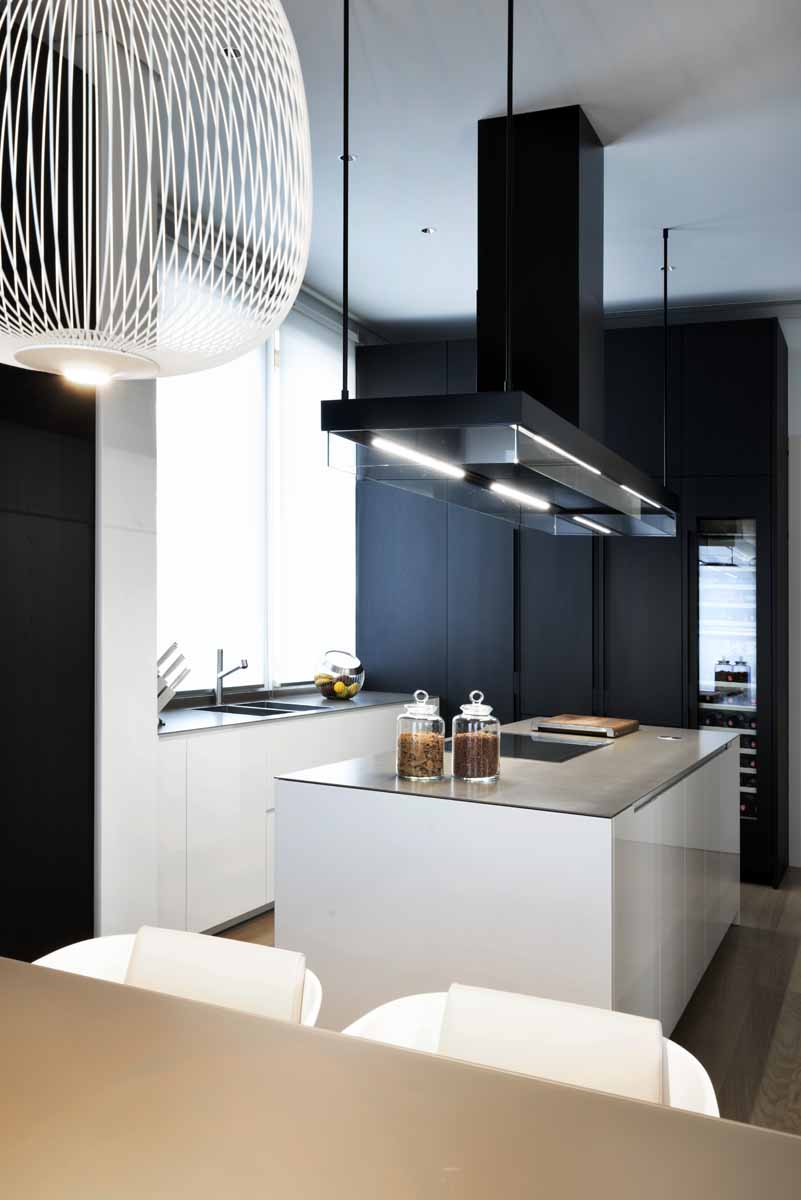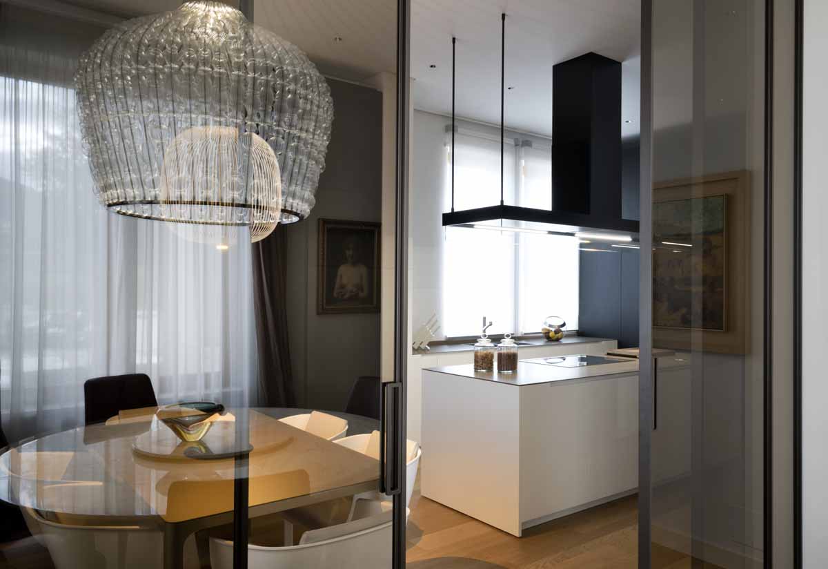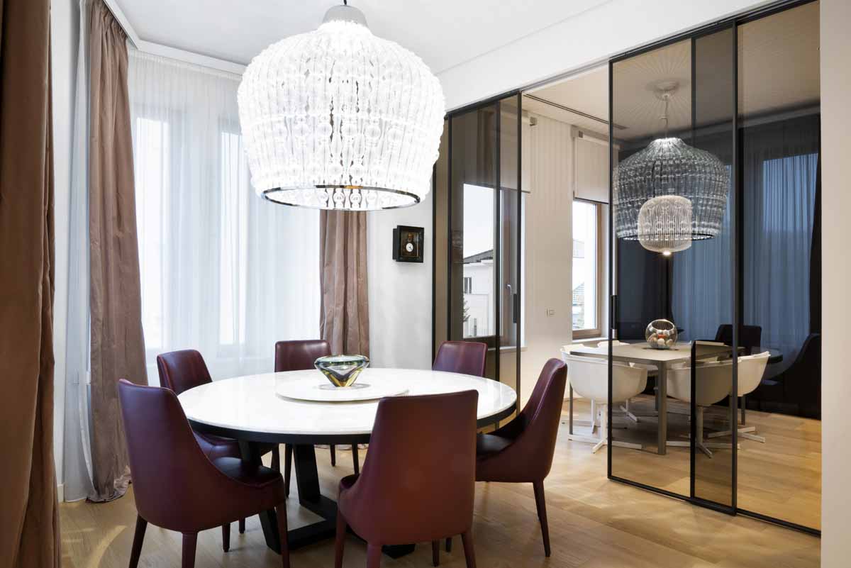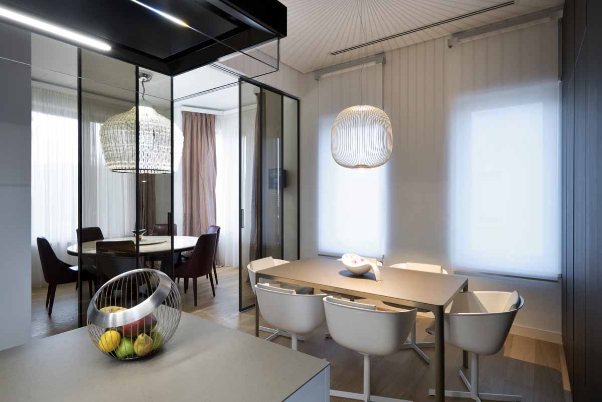 Il grande tavolo B&B Italia contornato dalle sedie Febo con schienale alto ospita fino a dieci commensali. Una parete divisoria con ante scorrevoli Rimadesio, ideale per separare gli spazi pur mantenendoli visivamente comunicante, divide questa zona dalla cucina arredata Varenna, con finiture in essenza e laccato nonché dominata da un’isola centrale di grande versatilità.