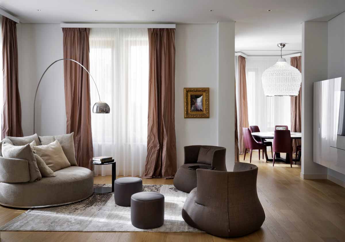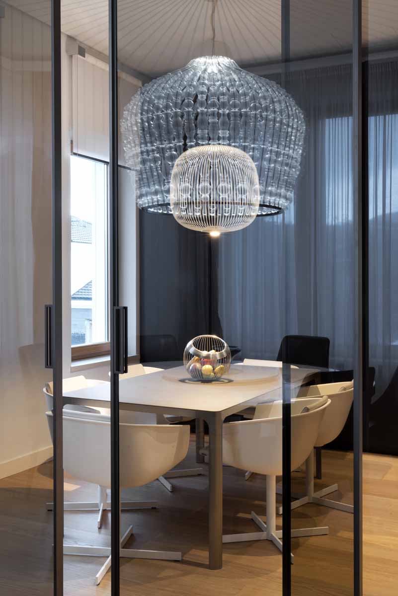 Lo spazio living nasce inizialmente come un’unica zona, in seguito divisa per dare spazio a un’area formale adatta al ricevimento degli ospiti e a una più informale riservata viceversa alla famiglia e allo svago dei figli. Il primo spazio formale, dominato da un espositore sospeso realizzato su disegno Marco Piva da Salvioni Arredamenti, ospita divani Poltrona Frau e poltrone B&B Italia, affiancate da preziosi tavolini Gallotti&Radice. L’atmosfera accogliente dello spazio viene qui accentuata dalle lampade Fontana Arte e Oluce.