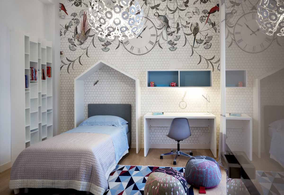 L’area destinata alle camere comprende due stanze per gli ospiti, due camerette e una grande camera padronale da cui si può godere della migliore vista sul paesaggio di tutta la villa. Il primo piano, riservato esclusivamente al nucleo familiare, si distingue per la scelta di cromie più calde e mobili informali, assortiti in base alle specifiche esigenze di ogni componente della famiglia e coadiuvati da alcuni pezzi custom-made. Fra gli immancabili armadi e guardaroba Poliform, spicca la scelta di letti B&B Italia e Flou, scrivania Erba Mobili, sedie Vitra e librerie MDF.