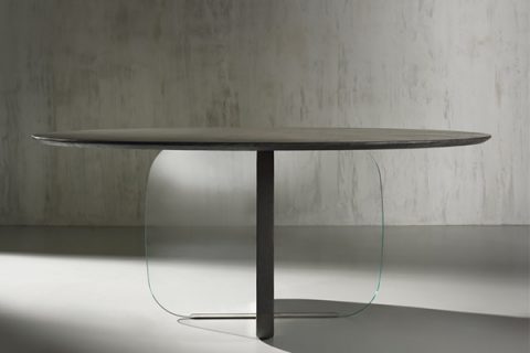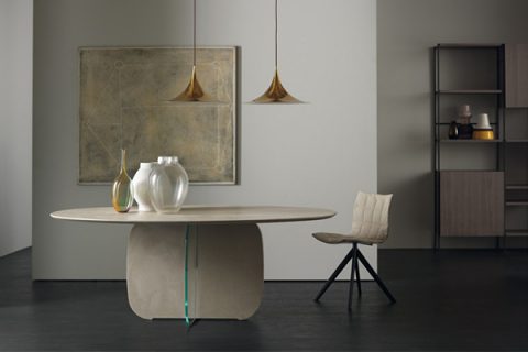 A special mention goes to the Giano table, whose dual soul, light to the eye and imposing in the structure, gives it a changeable geometry in correspondence with the variation of the observer’s point of view. The masterly play of transparencies enhances the essential line of the design and the versatility of the material.