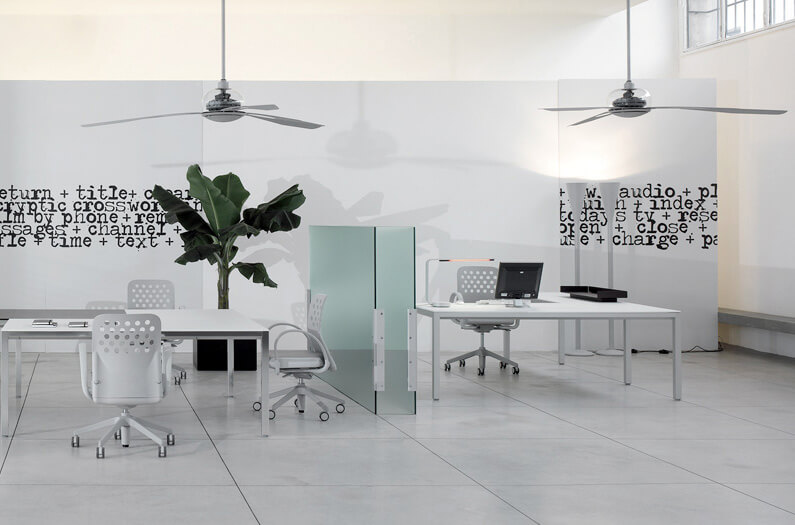 The first big bestseller IOC was the Freeway writing system, designed by the Castiglia Associati Studio and characterized by the numerous compositional possibilities offered by its bridge base. In addition, the great success of the Ultralight partition walls was due to the considerable customization allowed to the client, which made possible to obtain many different spaces in large open spaces.