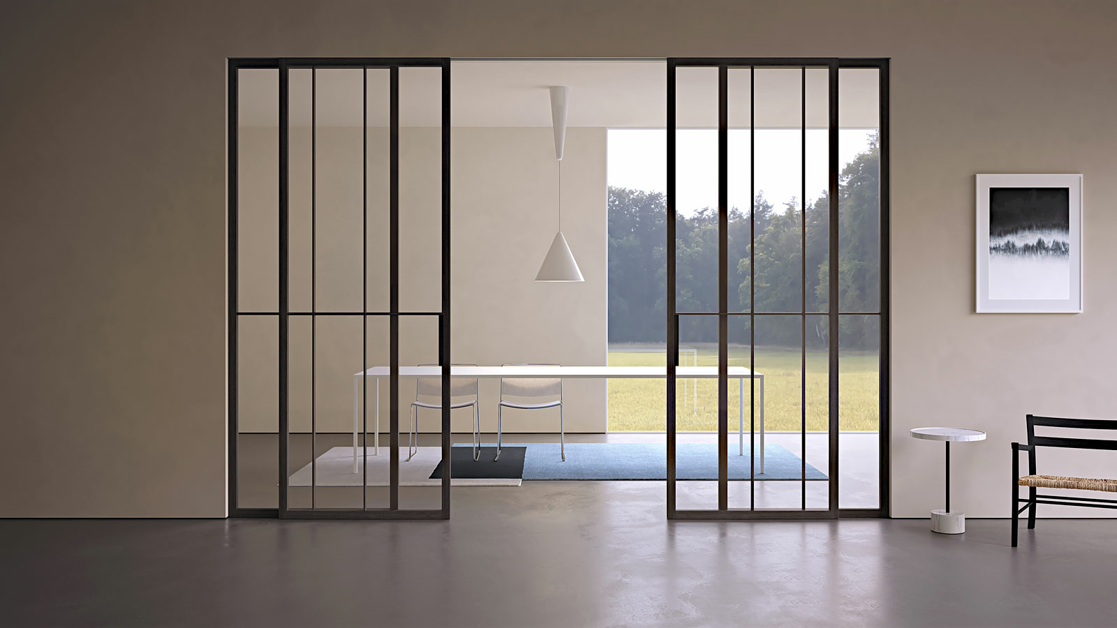 In the field of internal flush-to-wall doors, Lualdi proposes the tried-and-tested Rasomuro system, in its many stylistic variants, which makes it possible to optimize the reduced spaces of the apartments. Similar results can be achieved with external wall doors, such as the Outline model by Erik Morvan. Another fundamental type offered by Lualdi is the internal sliding doors or sliding windows, like the Shoin system.