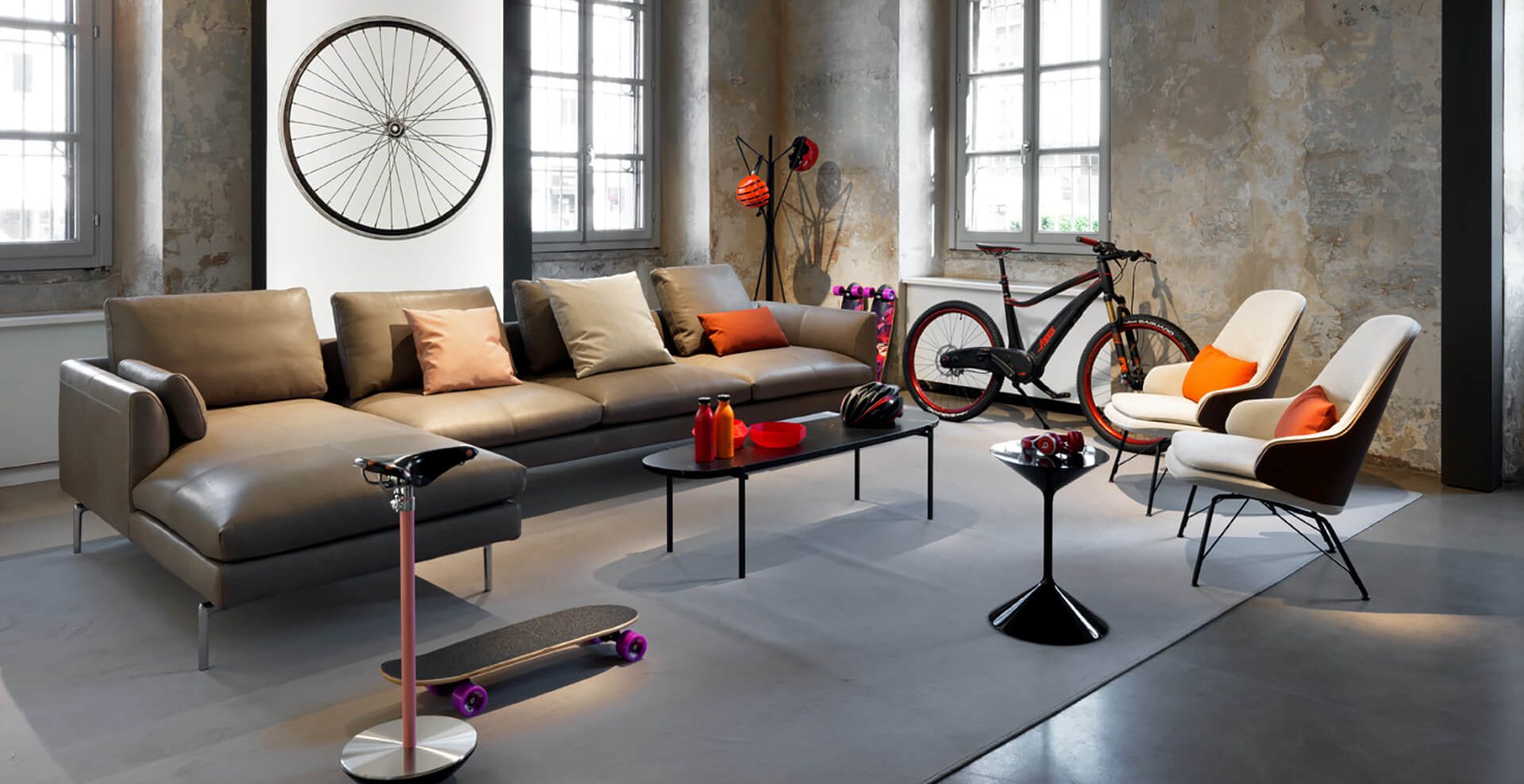 Zanotta’s production stretched to all the different types of furniture: from the sofas, including the William model by Damian Williamson and the historic Throw Away by Willie Landels, to the beds and the tables. The Reale table by Carlo Mollino and the Leonardo table by Achille Castiglioni belong to the latter category. It is also in the furnishing accessories that Zanotta offers its best, with surprising pieces such as the iconic Sacco armchair.