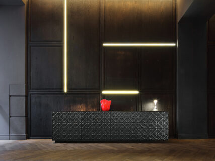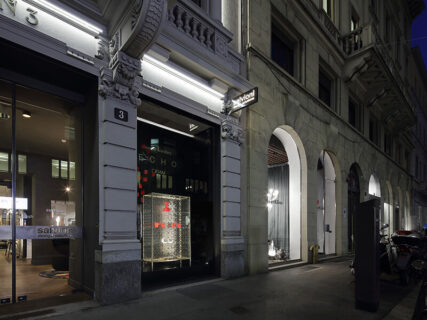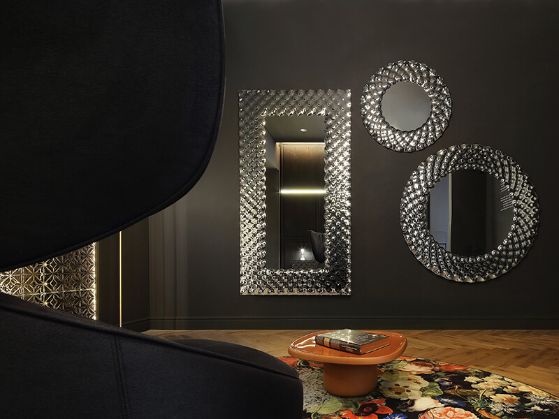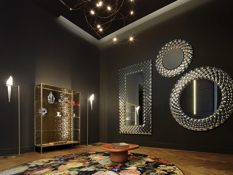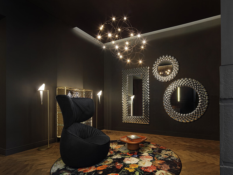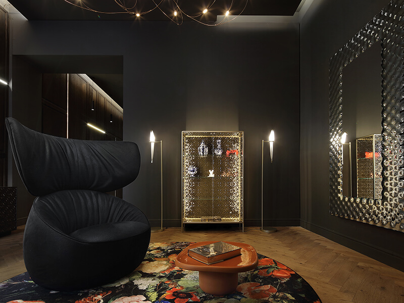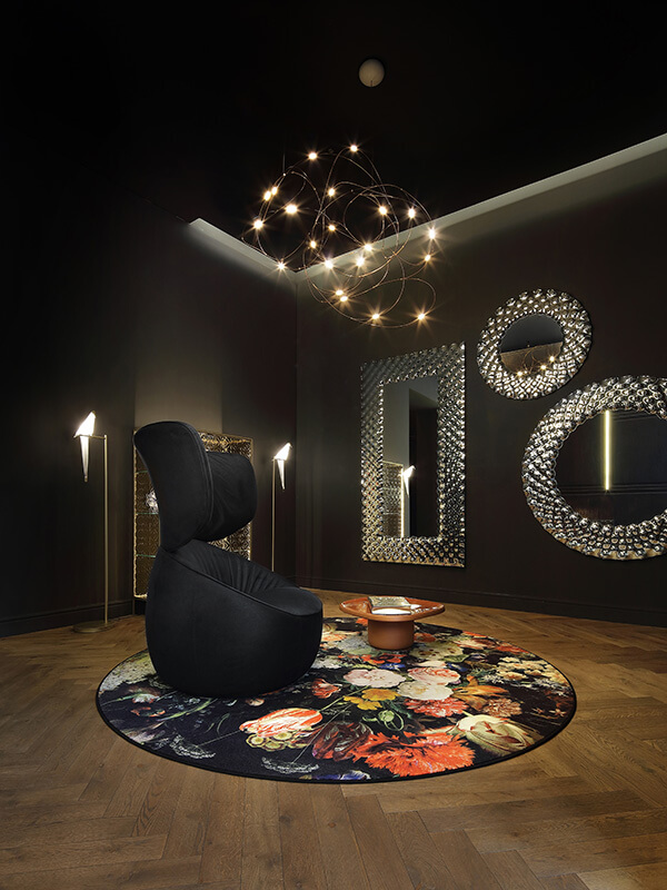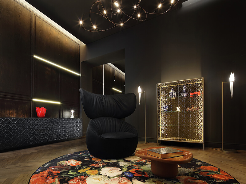 A site-specific installation placed in the suggestive window of the concept store in via Durini in Milan was the backdrop to this global event, dominating the scene with its dark tones where the soft and decorated surfaces of the Echo furniture stand out combined with the Hana armchair by Moooi also placed in neutral tones. Masterful touch of color, the carpet with floral motif placed in the center of the space perfectly softens the rigorous forms scheme.