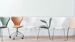 This extreme versatility is emphasized by the large number of variants and finishes available in the Fritz Hansen catalog: the shell can be made with veneers of various woods, with a warm and natural look or entirely lacquered in different colors, or, again, in ashwood stained in different nuances showing the grain of the wood. It can also be covered in leather or in fabric,entirely or even only in the anterior part.