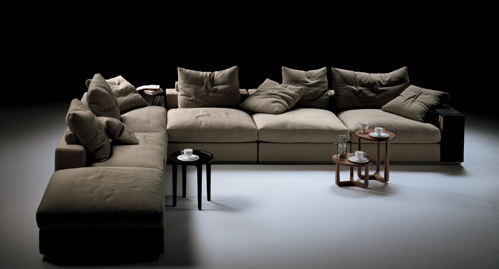 Absolute modularity is one of the most important factor in Groundpiece: every element can be combined in order to form linear or corner sofas of any size, whether or not fitted with armrests.