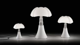 With a delicate appearance, this lamp recalls almost floral suggestions. It was designed by Gae Aulenti in 1965 conceiving it for a specific destination, the Olivetti showroom in Paris, but after a few years it was successfully introduced into mass production by Martinelli Luce.