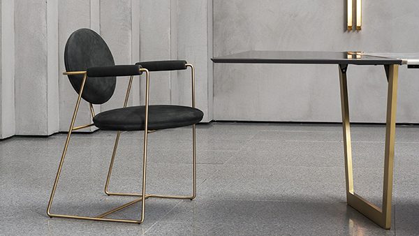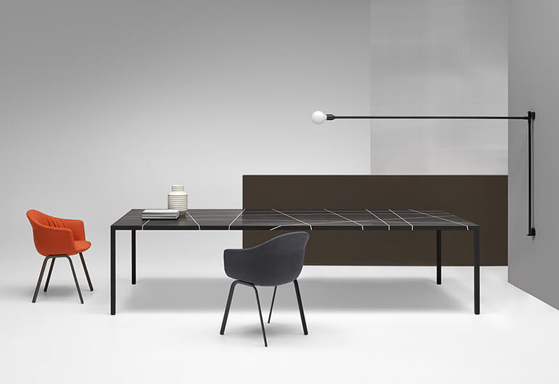 A note of merit should be made to the Tense Material table, whose particular finish is made starting from the marble powder which, skilfully mixed with a binder, is laid out manually on the entire surface of the top. After careful polishing, an inlay is made that follows the dictates of the famous “surface line point” theory developed by Kandinsky, and finished with a special treatment of varnishing and natural wax.