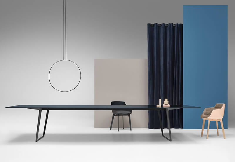 No less valuable is the Axy table where the search for lightness is combined with the dynamic perception of the suspension. An essential architecture, where the original design of the two structural bridges, entirely made of aluminum, recomposes expressive tensions and lines of force in the field with expressive effectiveness.