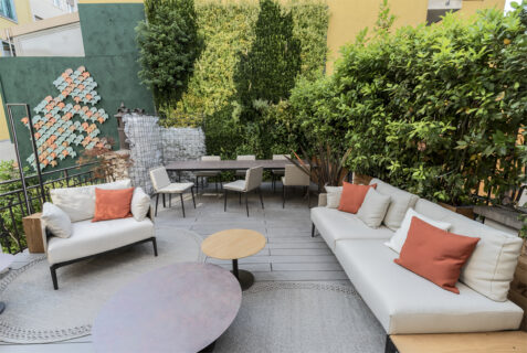 The new -1 floor, expanded and completely redesigned in order to house a material library, has created a further visual cross-section in turn stimulated by the window in via Durini, airy and for this year finely orchestrated by the hand of Acerbis. Spearhead, the Salvioni terraces act as a real lung towards the outdoor world, nature and the open air. Enriched by Talenti furnishings, they have been able to create an authentic oasis of taste where is possible to savor the idea of relaxation and comfort away from the chaos of the Milanese metropolis.
