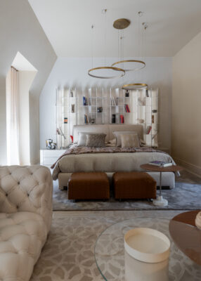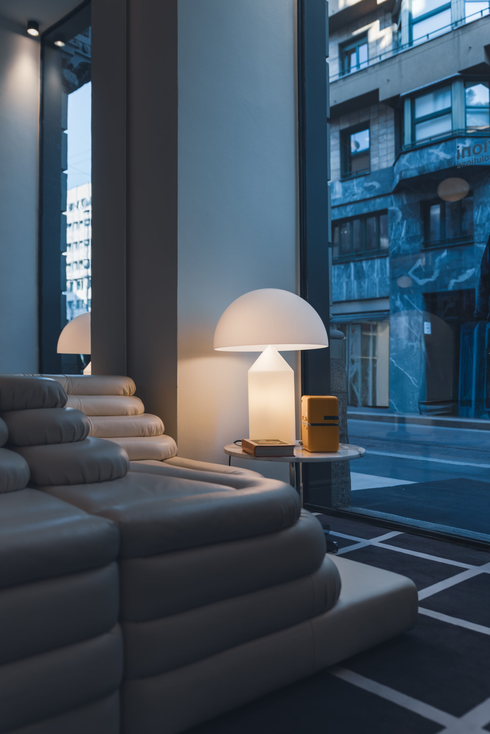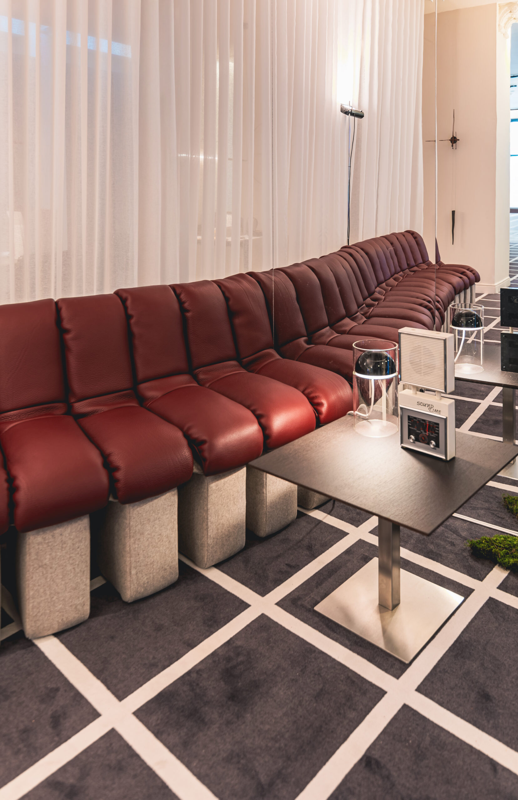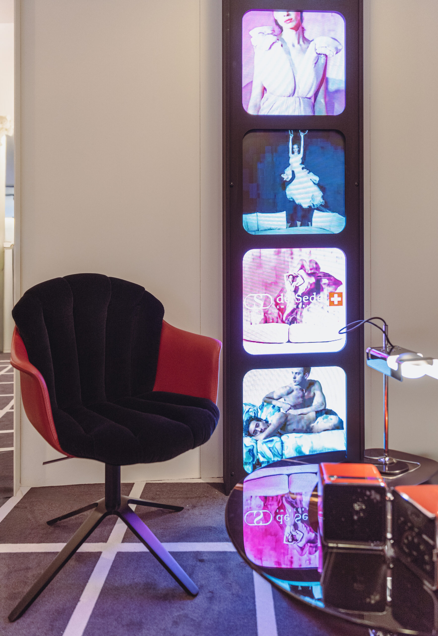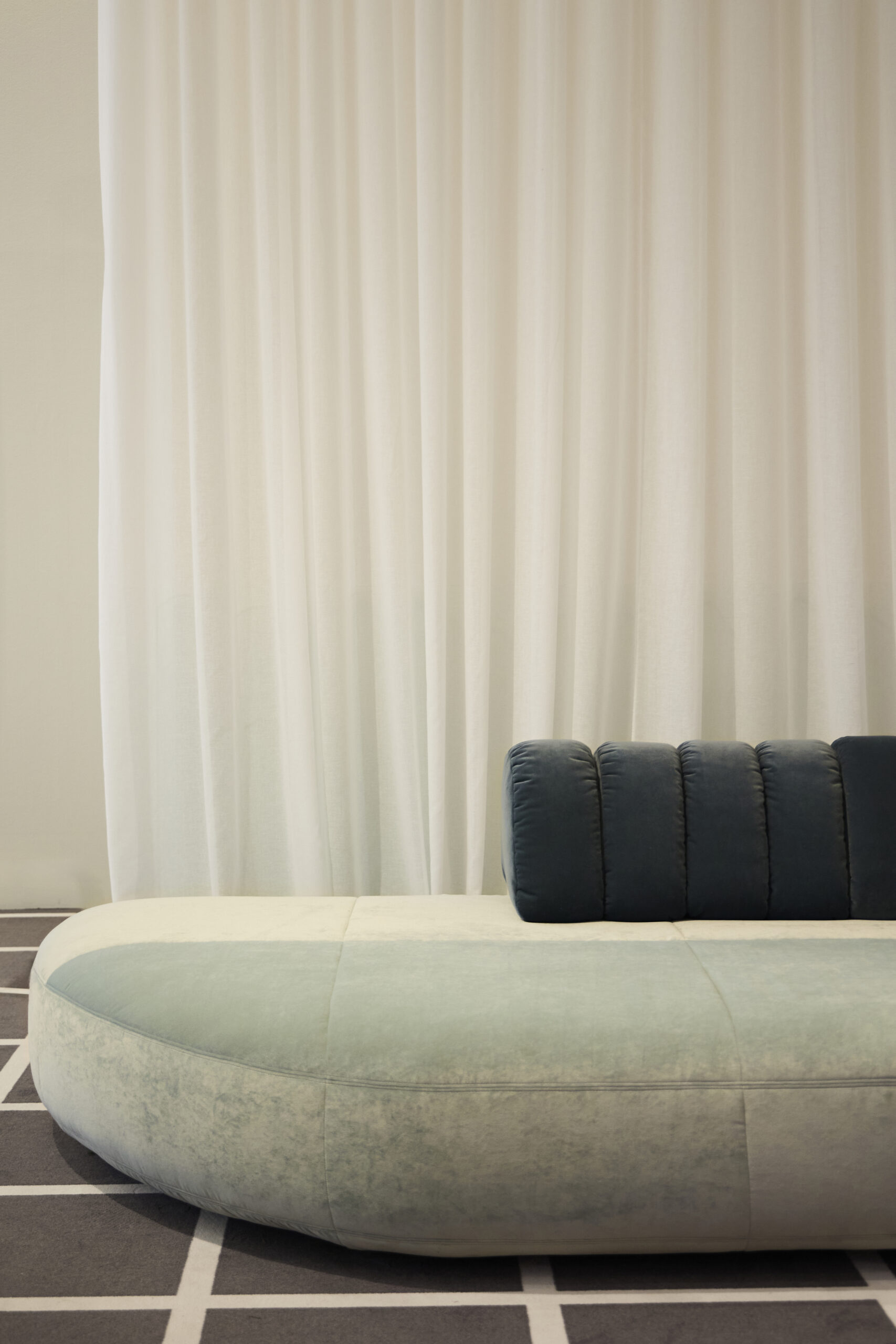 The lighting of the space was entrusted to Oluce, which presented numerous catalogue proposals such as the famous Atollo lamp, an icon of the 70s, while the curtains present are the result of the joint study of de Sede and Roberto Molteni Soft Decoration, which for the occasion has taken up colours and patterns aligned with the style chosen by the brand. On this floor, the works of art by the artist Helidon Xhixha were placed, proposed by the art and design hub 6499 Milano.