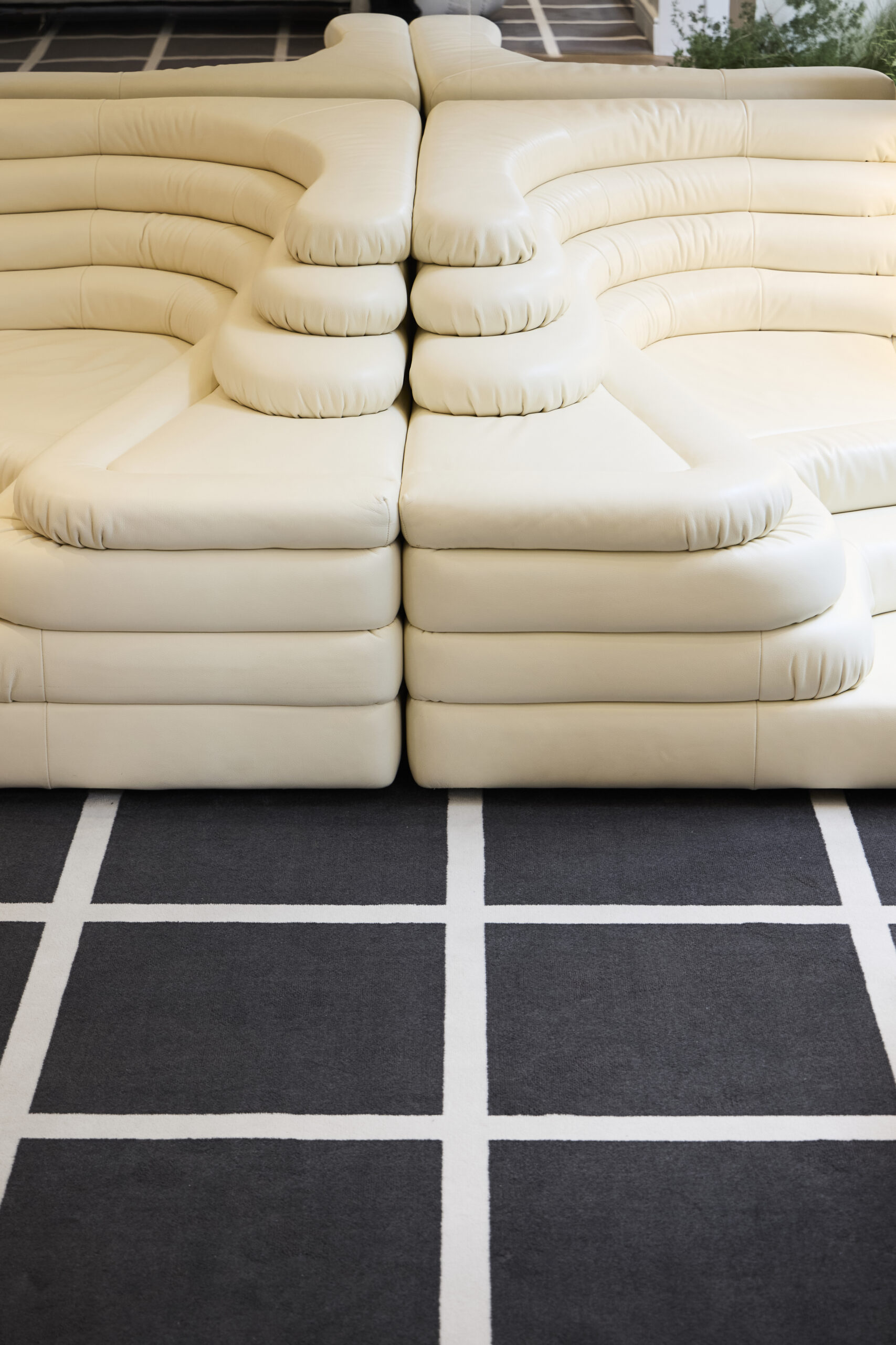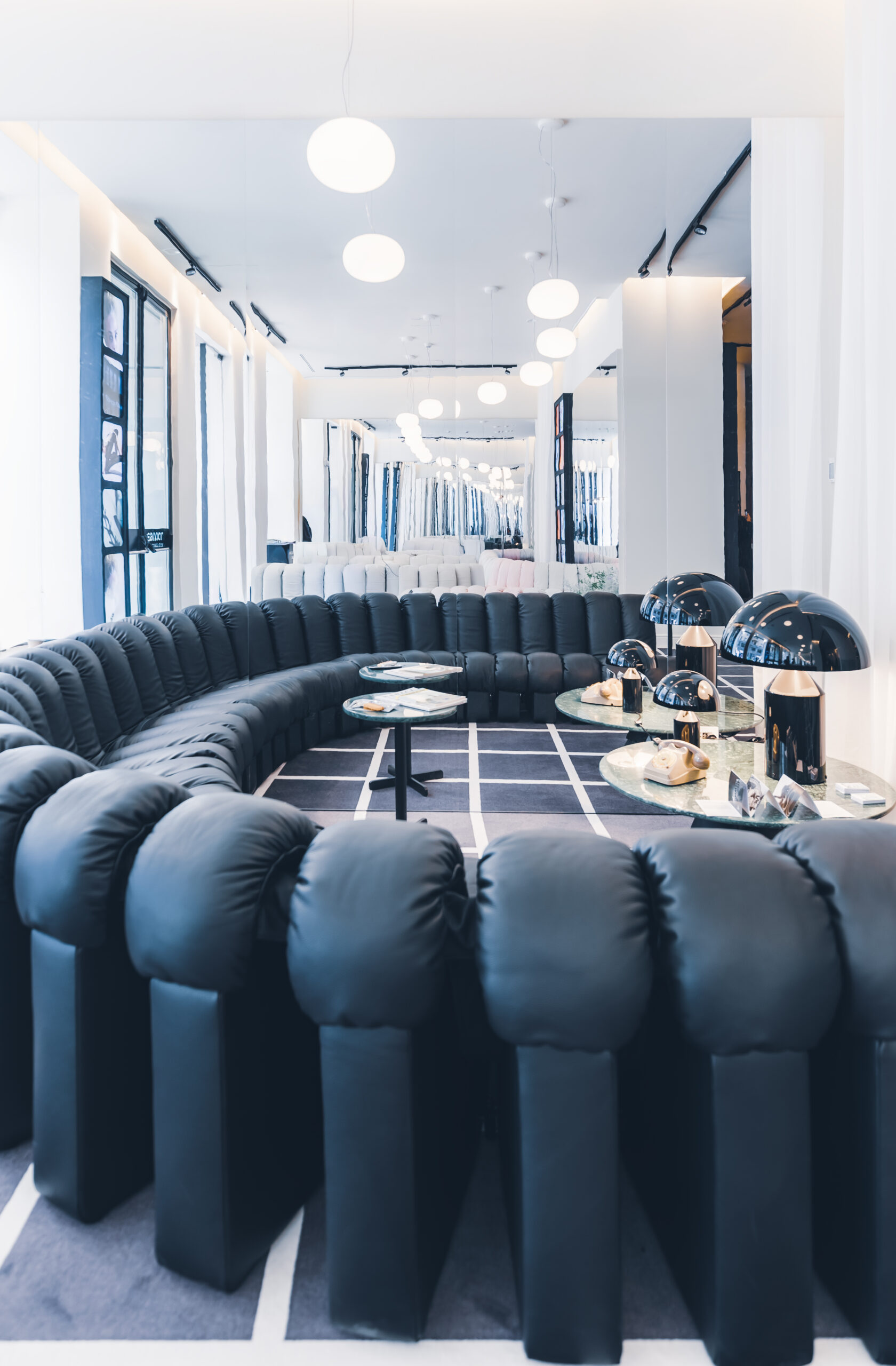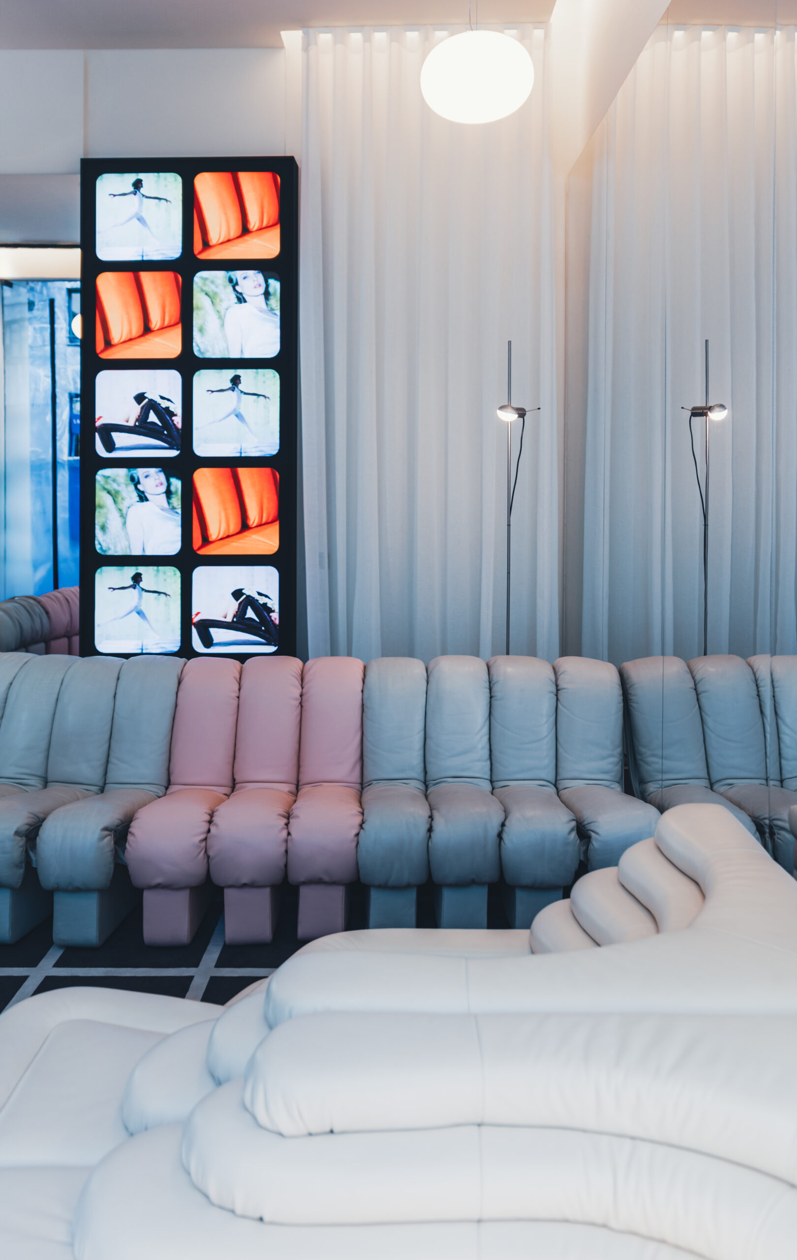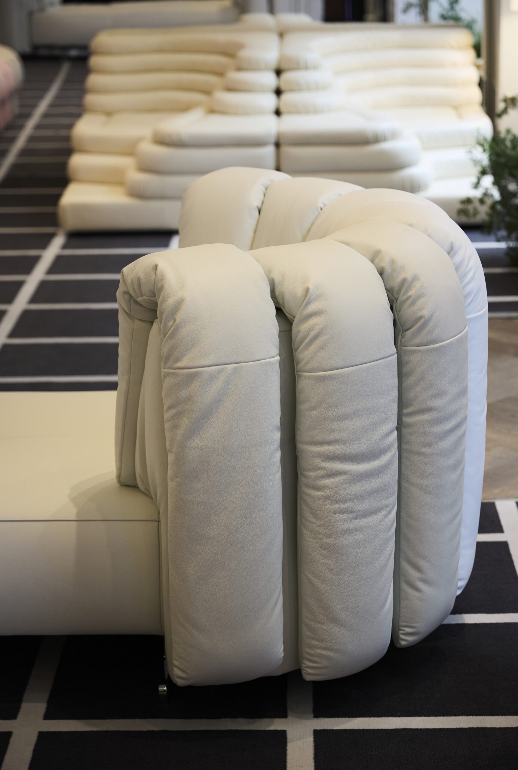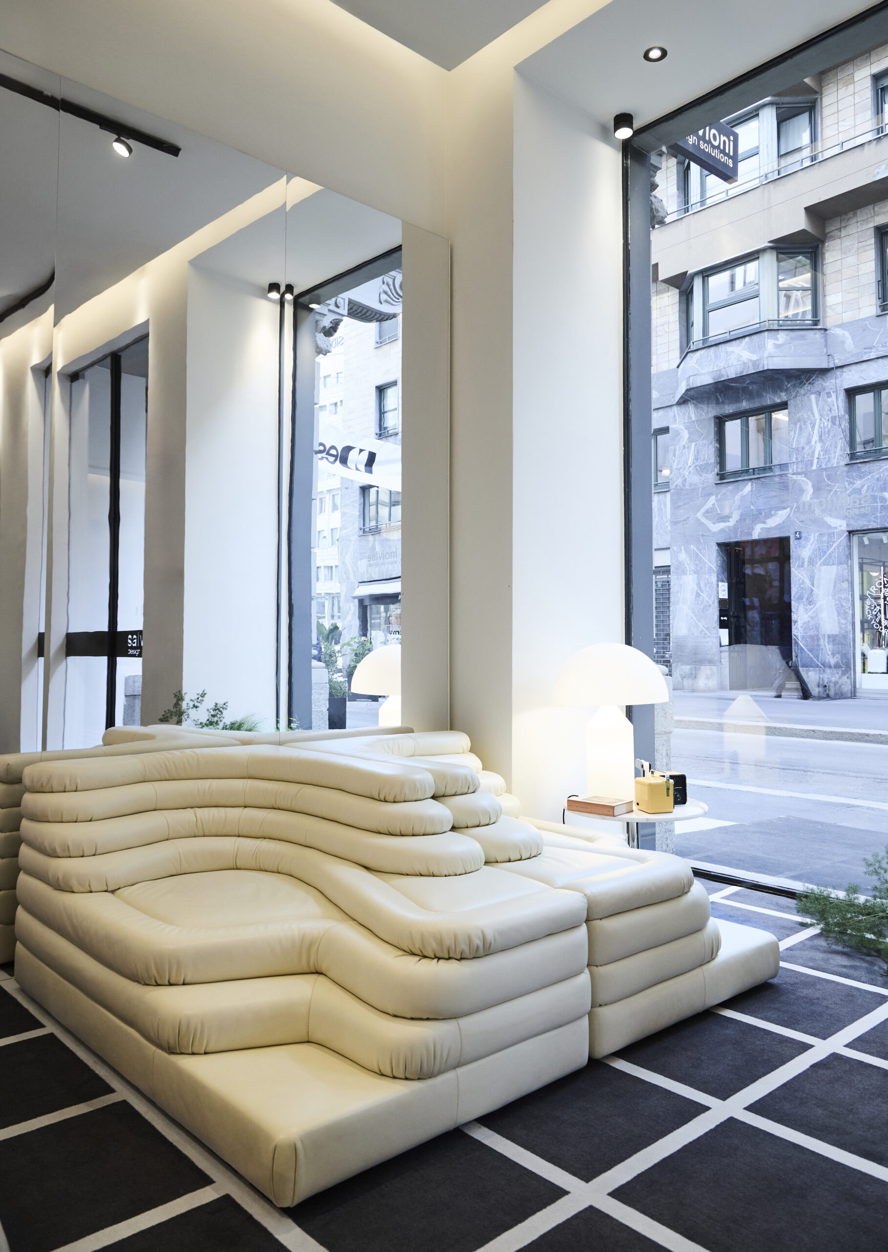 The showroom window on Via Durini becomes the setting for the de Sede brand, which for the occasion places two of its most iconic upholstered furniture: the DS-600 SNAKE sofa and the DS-909 FLOW, a duo available in brown, cream, green and black.