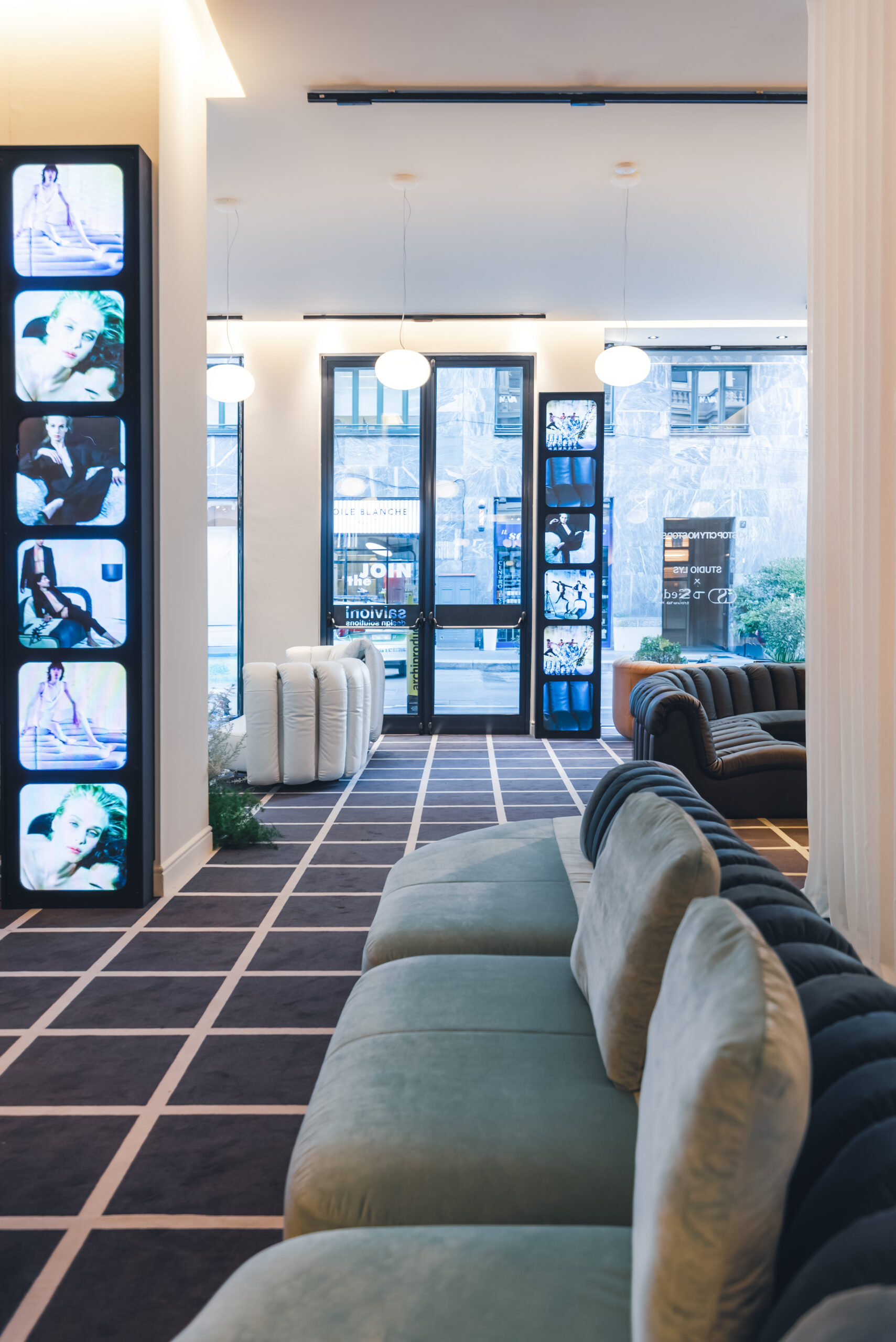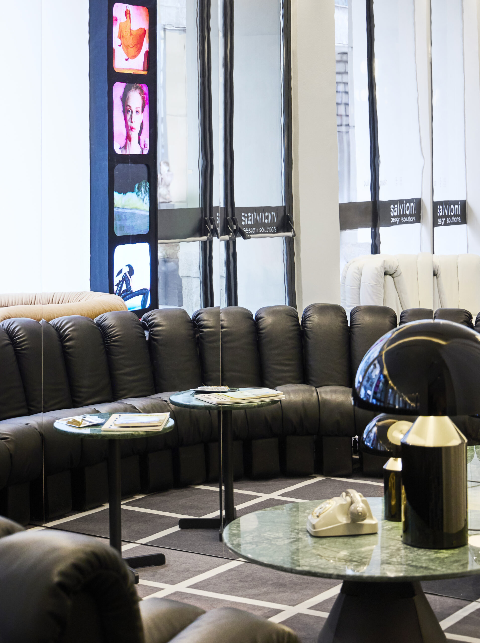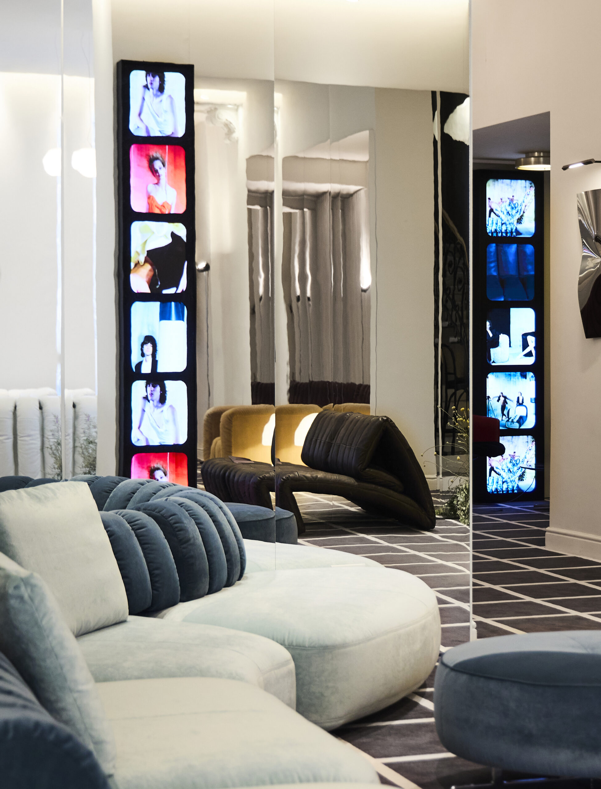 The creative direction held by Studio LYS wanted to create a 70s-style setting with mirrored walls, television screens and a game of labyrinthine proportions that gave the illusion of an infinite unfolding of each upholstered piece. The innermost part of the showroom is also strongly characterized, where the game of refractions continues until it leaves space for the offices. In this area you can find the Molletta by Riva, the Corona armchair by Fredericia and the Nuvola Rossa bookcase by Cassina.