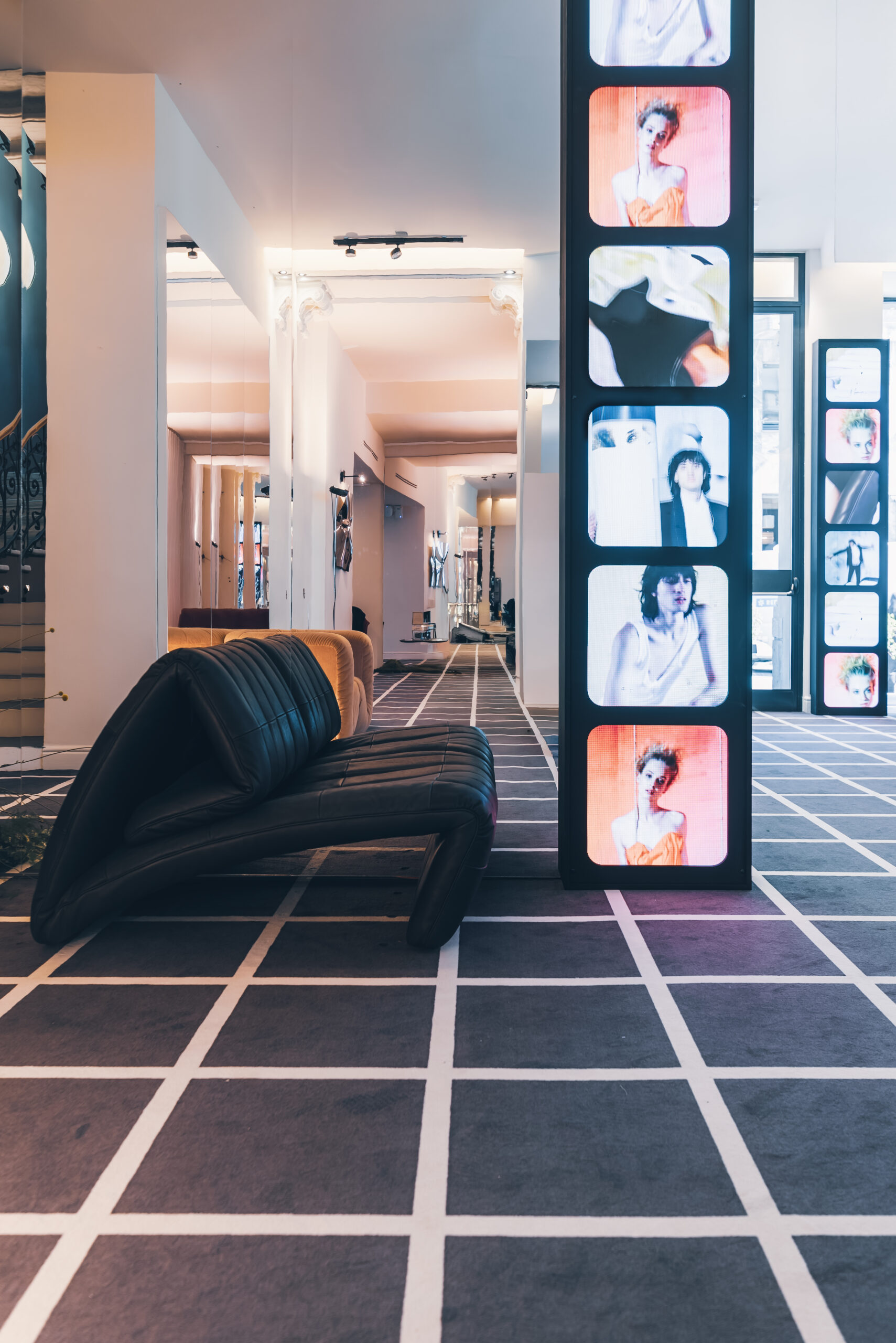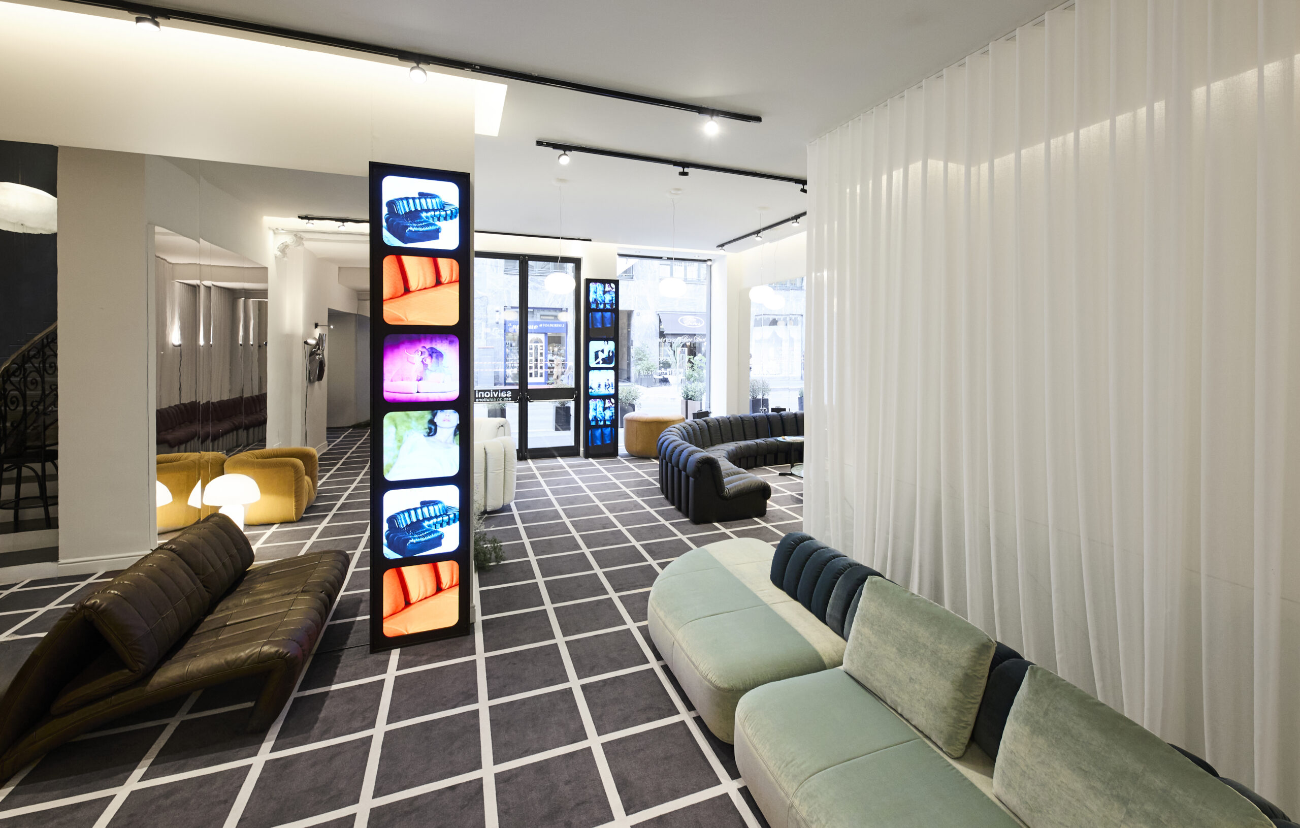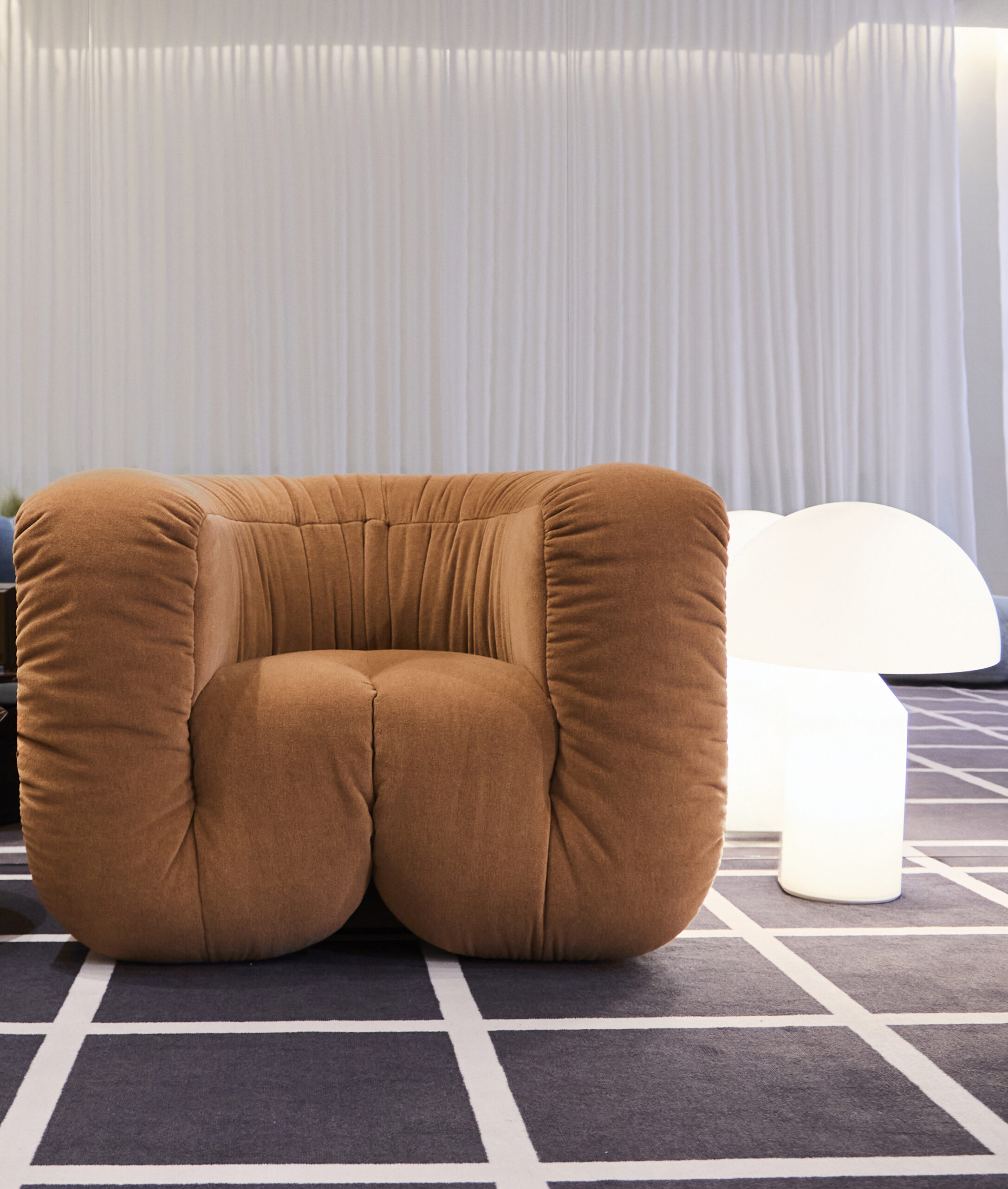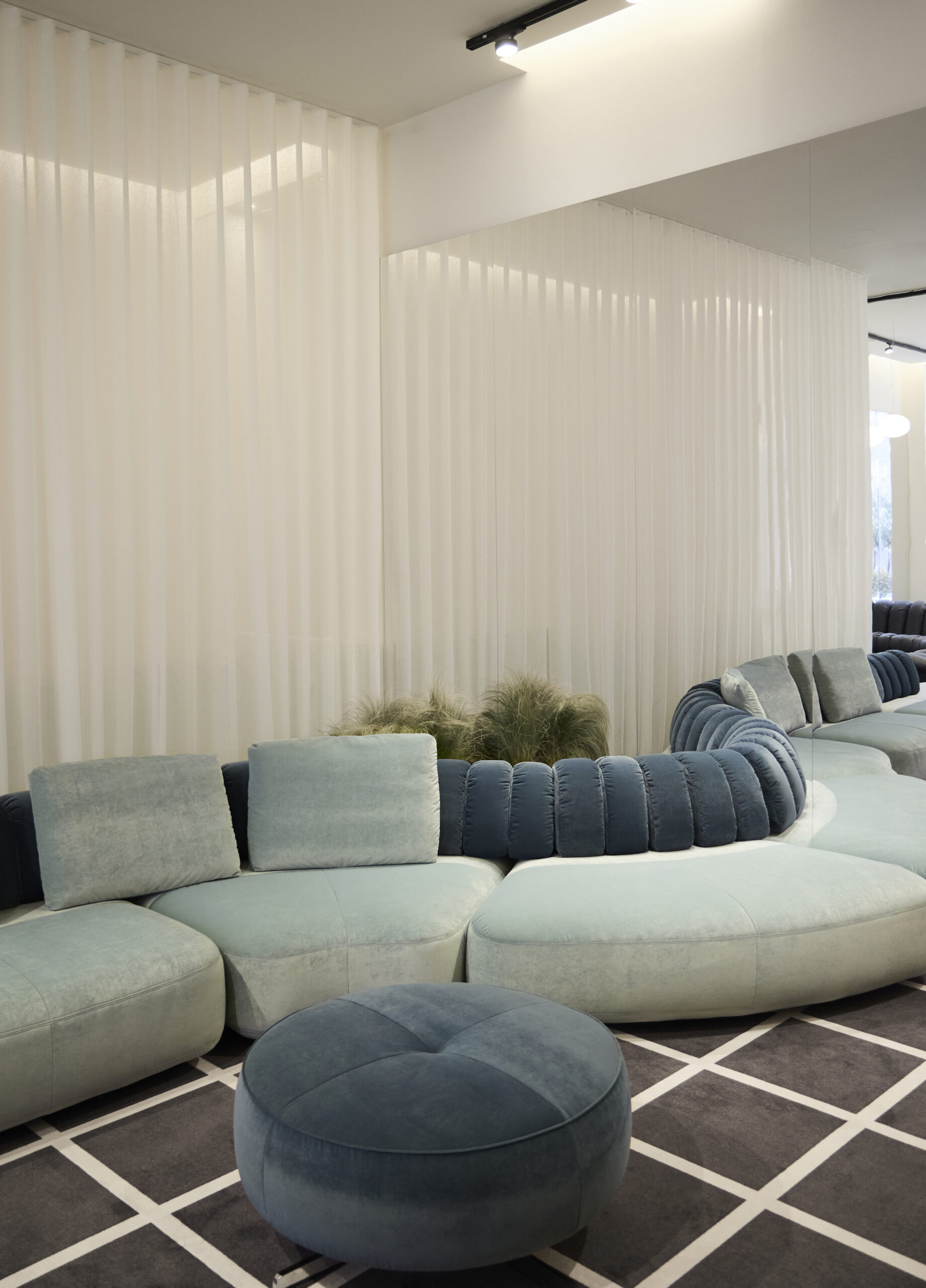 The creative direction held by Studio LYS wanted to create a 70s-style setting with mirrored walls, television screens and a game of labyrinthine proportions that gave the illusion of an infinite unfolding of each upholstered piece. The innermost part of the showroom is also strongly characterized, where the game of refractions continues until it leaves space for the offices. In this area you can find the Molletta by Riva, the Corona armchair by Fredericia and the Nuvola Rossa bookcase by Cassina.