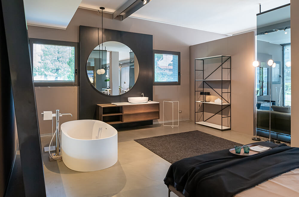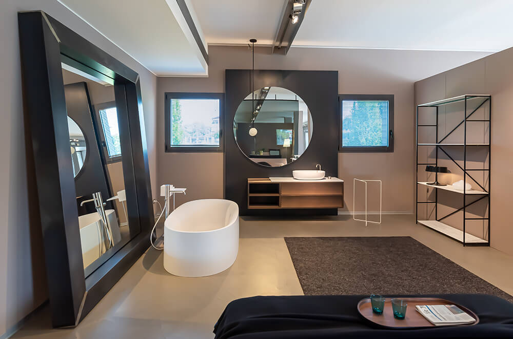Last but not least, Salvioni presents a Boffi space dedicated to the bathroom, where the Sabbia bathtub combined with the Wood-In bathroom in white Carrara marble, Art Mirror and Skyline floor lamp seal the Group’s 360 ° ability to furnish every room in the house, from the living room, the kitchen and finally the bathroom area.