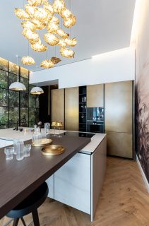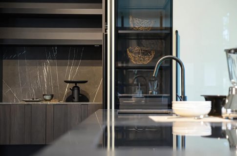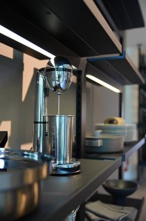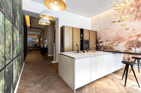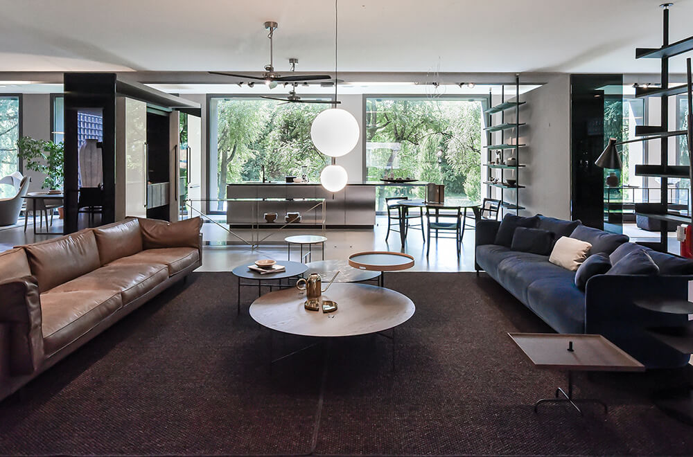But the news do not end here. A second Boffi kitchen related to an equally admirable De Padova space has been inserted inside the Salvioni Inverigo showroom. Against the background of two large windows of this store surrounded by greenery, the K14 kitchen combined with the Hide Columns guides the visitor in a corner entirely dedicated to the two design brands, famous for the quality and richness of their style. The soft shades of the Gray Stone marble of the top perfectly match the finishes of the ’95 table by De Padova, in turn surrounded by the M16 chairs.
