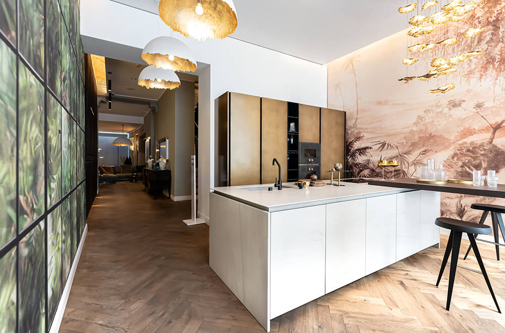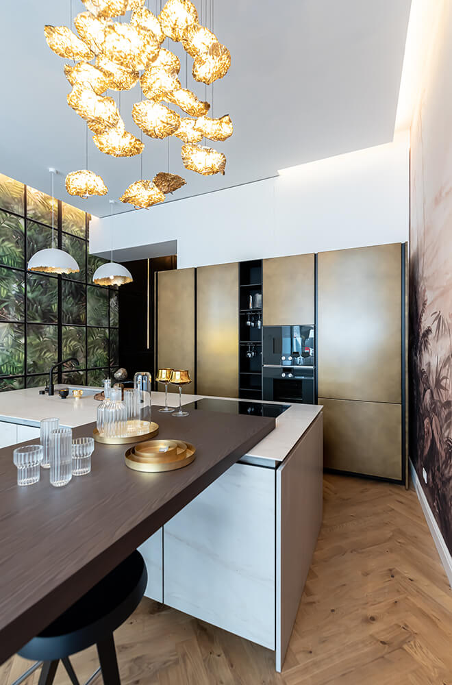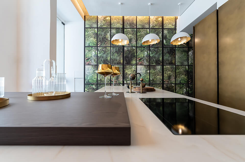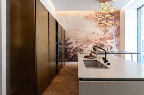 On the warm shades of a Wallpepper floral wallpaper, the quartzite finishes of the top intertwine with the Ecowood snack table coordinated with the open columns in vintage brass metallic finish. The Cassina Mexique Stool stools in black stained oak complete this glimpse, perfect for giving a final and unparalleled touch of style to the entire composition.