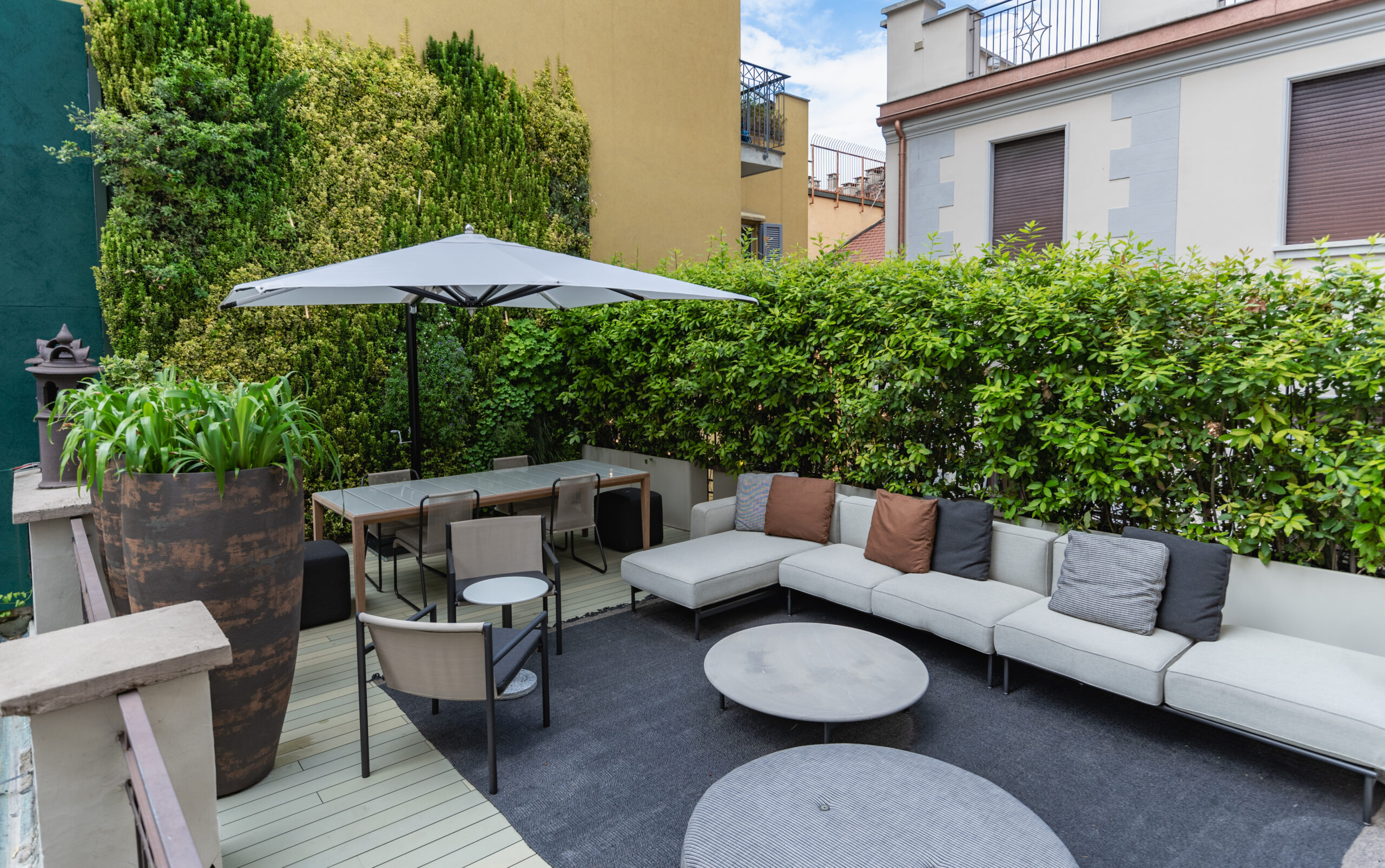 The first terrace, large and rich in vegetation, where the imposing tree walls frame the scene giving it an almost rainwater touch, focuses on creating two different spaces; the first dominated by the Eolie Gazebo and the second by the large Eden sofa whose size encloses the gaze offering a suggestion of relaxation. In the centre, the Tint carpet stands out with the Double poufs and the Button coffee table. More from the side you can see the Astra armchairs in the low and high back variants.