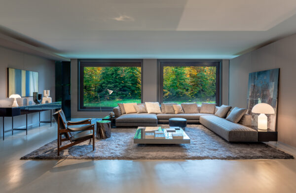 The last terrace has been set up as an outdoor lounge so as to create an intimate and private area where you can converse or just relax. Evidence of this intent is the Laze lounge chair in the rocking version. The green shades used here are visibly refreshing and mitigated by a play of shades tending towards aqua green, as in the case of the Dandy sofa. A note of value is represented by the Eolie coffee table and the practical Pillow lamps placed to illuminate the room at night.