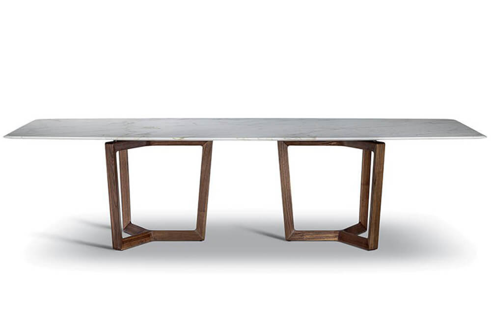 Bolero Ravel – Roberto Lazzeroni designs the Bolero Ravel table. The marble top obtained from a single slab with a barrel shape, the tapered edges and the three-post base give a physiognomy of absolute novelty and elegance. This piece of design incorporates slender and suspended forms, which despite the use of “important” materials, succeeds in the difficult task of deceiving the eye and literally floating in space.