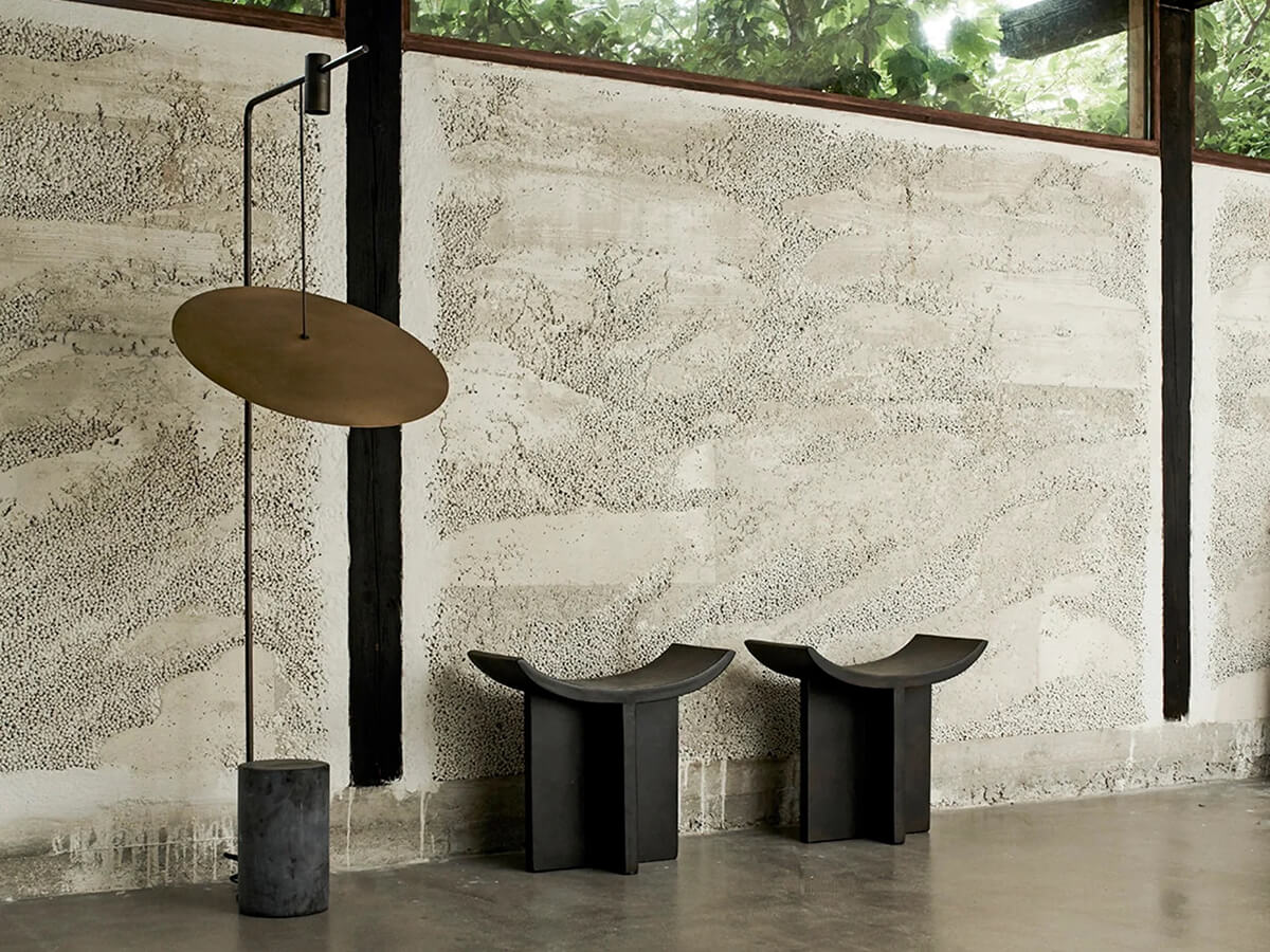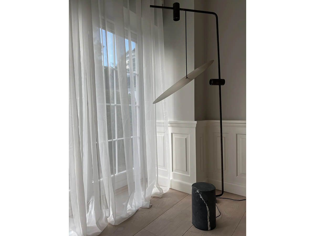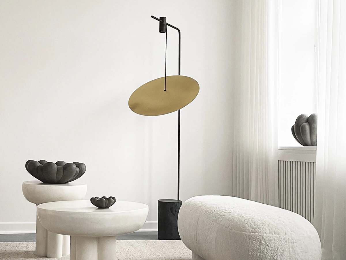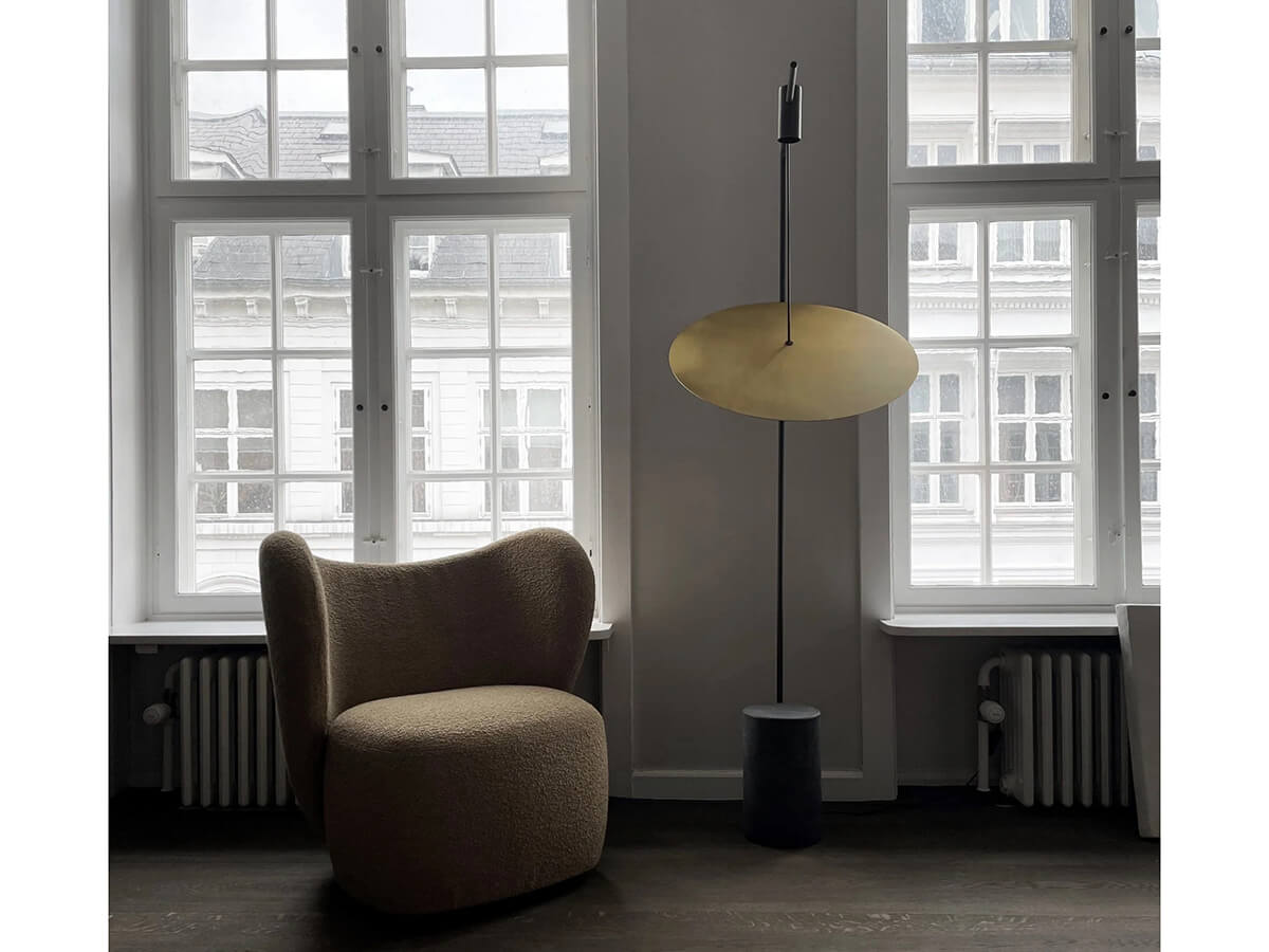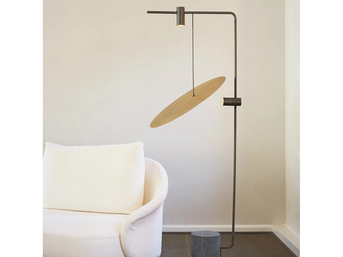 Minimalist design and unparalleled imaginative power are the foundations of The Moon floor lamp by 101 Copenhagen. The beauty of this model stands out for the geometries used and studied to maximize the light in all its aspects, from the ephemeral to the more physical. The Moon has two light sources positioned as compositional fixed points along an oxidized brass arm. A large circular lampshade hangs from the lamp arm like a floating reflector in space. The lampshade of the brushed brass reflector is illuminated on both sides and creates a warm and soft light, suitable for any type of environment, from more to less formal.