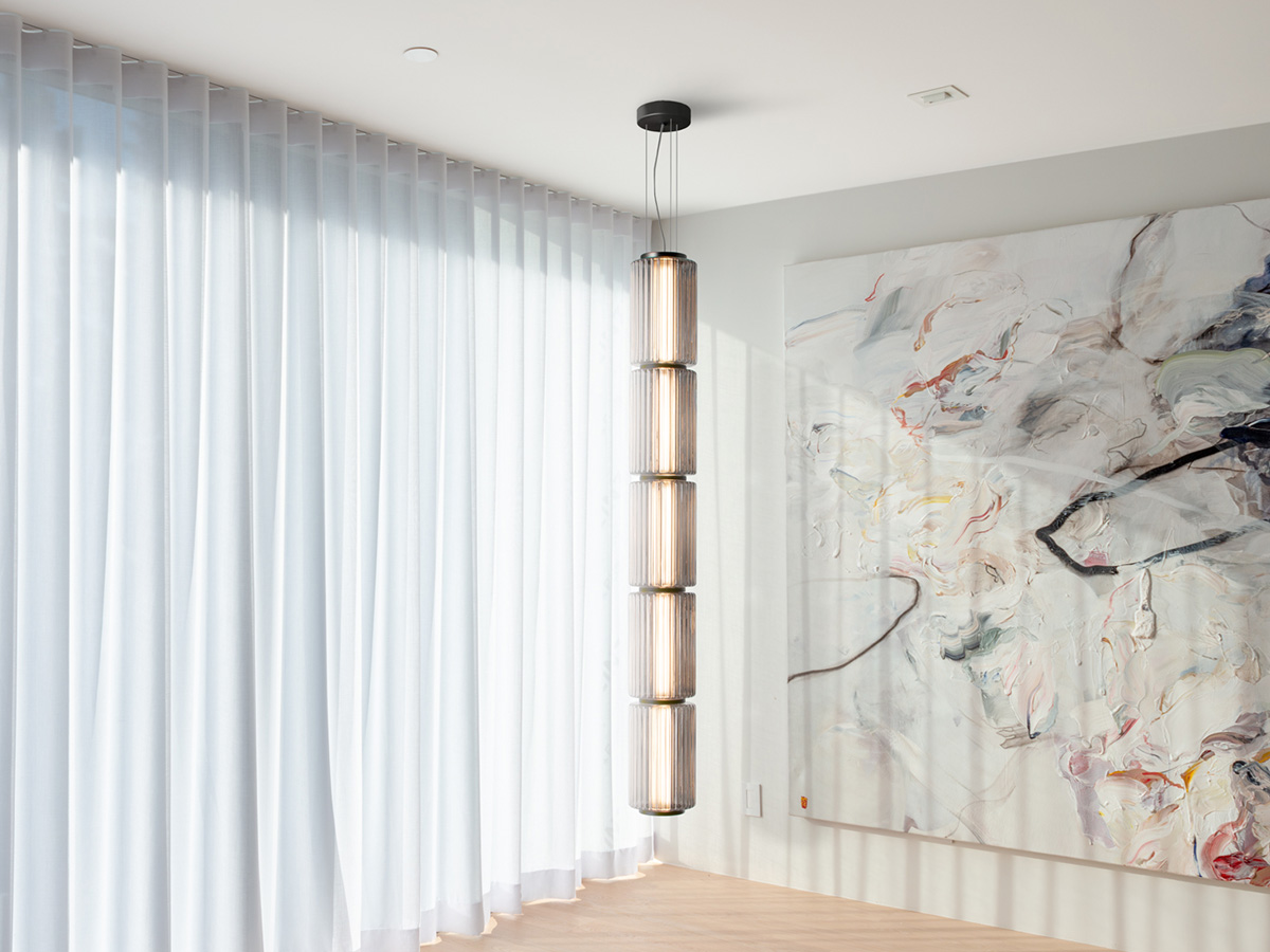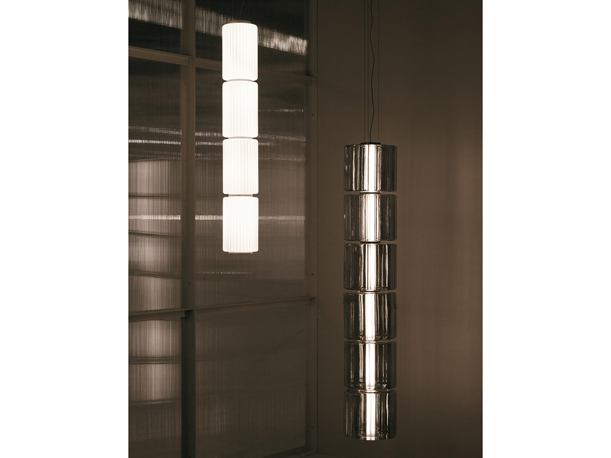 A lamp with an elegant design, conceived to create a perfect synthesis between glass and aluminum. Column is a pendant lamp designed by Lukas Peet and produced in different models and finishes to adapt to any room in the house. The Horizontal version in particular is perfect for living spaces, a focal point where the eye converges and convivial situations. Column draws inspiration from the Greek Doric columns of classical architecture, from which it takes the symmetry and the numerous facets, used here to channel the light and spread its reflection in a homogeneous and extremely pleasant way.