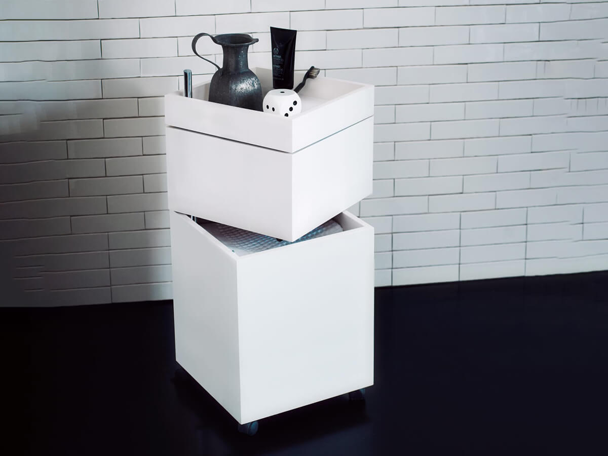 O.J.C. is a practical storage unit on wheels for the bathroom, the protagonist of the Agape collections since 1991. It bears the signature of Giampaolo Benedini, the charismatic founder of the brand, who with his revolutionary ideas has forever changed the way of conceiving the bathroom. An ingenious vision that can also be found in apparently simpler projects such as that of O.J.C., in which several squared compartments of different heights are superimposed in a compact and space-saving volume and can be opened thanks to the lateral sliding around a single pin. O.J.C. it is available in various finishes, from natural essences such as natural, brown, dark oak, recomposed wood with teak finish up to the more neutral lacquers.