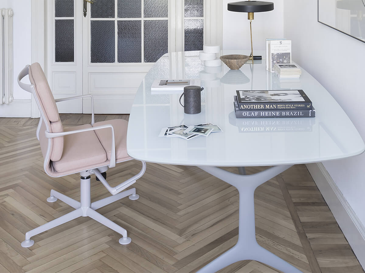 The Alias Meetingframe series of office chairs, designed by Alberto Meda, is characterized by seating comfort, ease of use and an aseptic but elegant look. Available in different versions and finishes, with or without armrests, Meetingframe rests on a solid 4-star swivel base with adjustable height and is characterized by a comfortable seat consisting of a polyester mesh coated with PVC. The structure, with elements in extruded aluminum and die-cast elements, is widely customizable in the choice of colors to integrate it into environments with a more diverse taste.