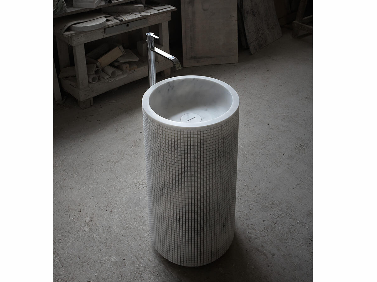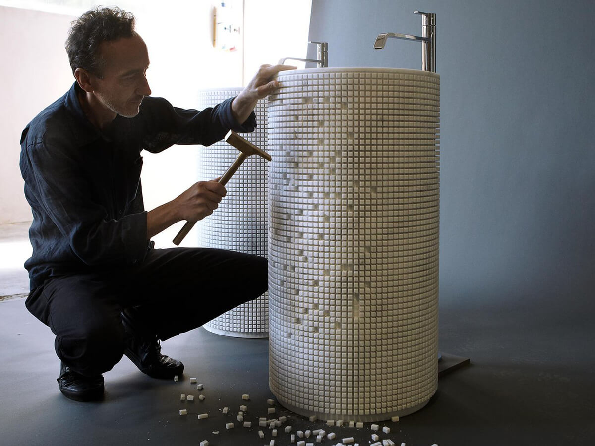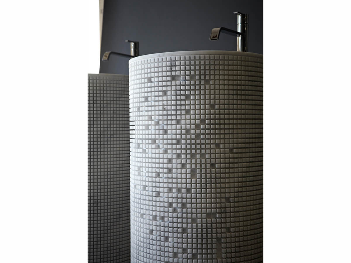 The Pixel free-standing washbasin by Antoniolupi is a real "artist's creation". In fact, it bears the signature of the eclectic Paolo Ulian and his unprecedented work of destructive dialogue with forms that gives life to ever new objects. Pixel was born monolithic and imposing, a large block of marble whose surface is divided into a very dense orthogonal grid of square tiles that almost give it the appearance of a mosaic. To this predefined processing, already precious and fascinating in itself, Paolo Ulian adds the unpredictability of human intervention: the individual pixels are in fact designed to be destroyed at will, thus outlining an original design on the surface of the washbasin, which in its complex intertwining of lights and shadows revives the rigorous geometry of the washbasin enriching it with a touch of unpredictability.