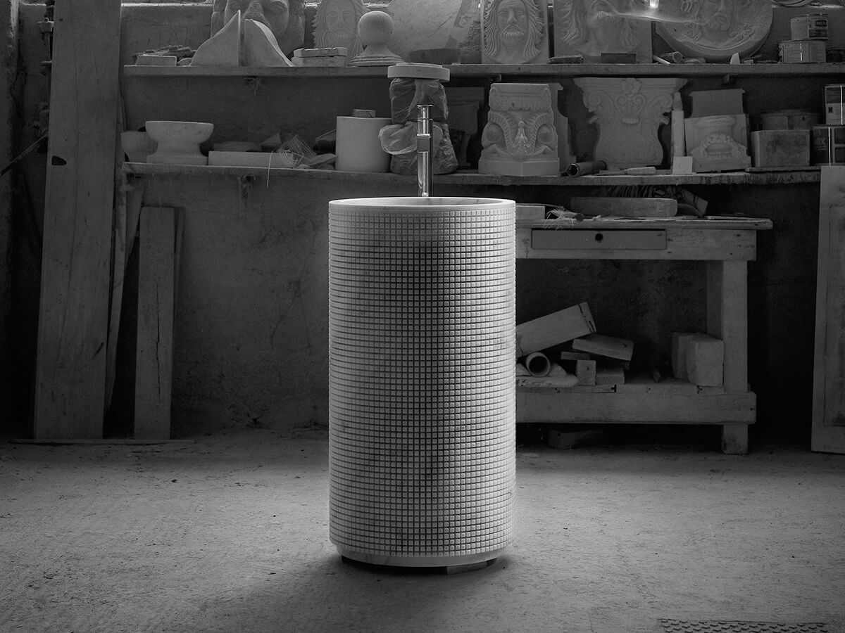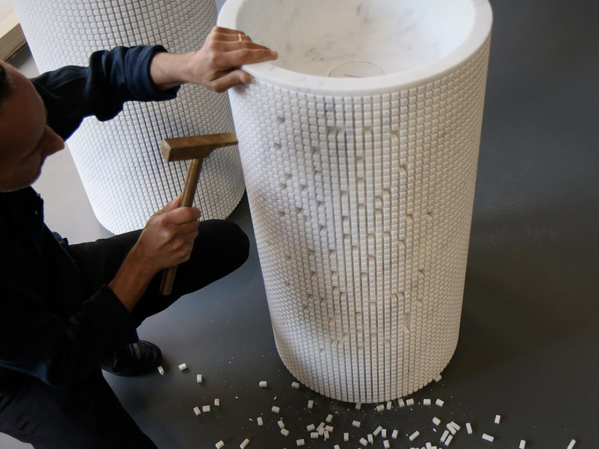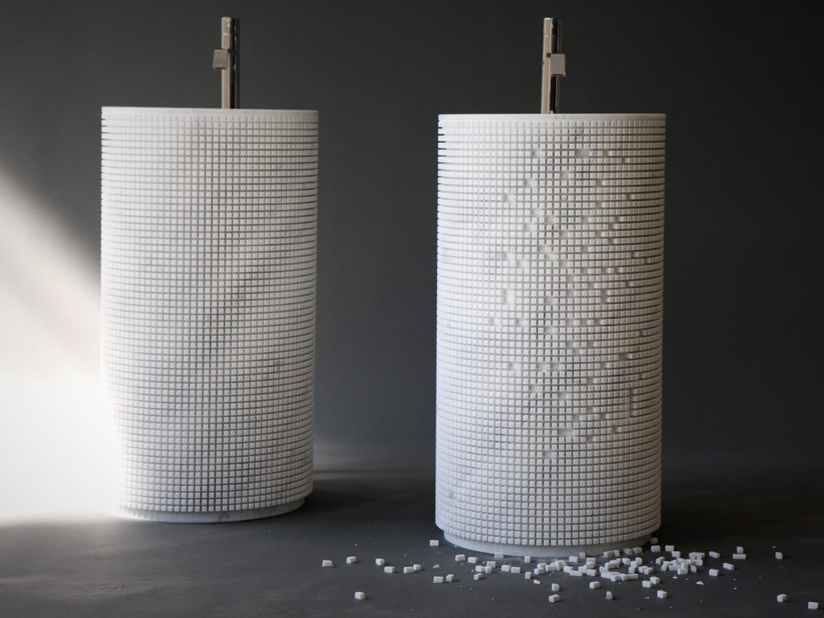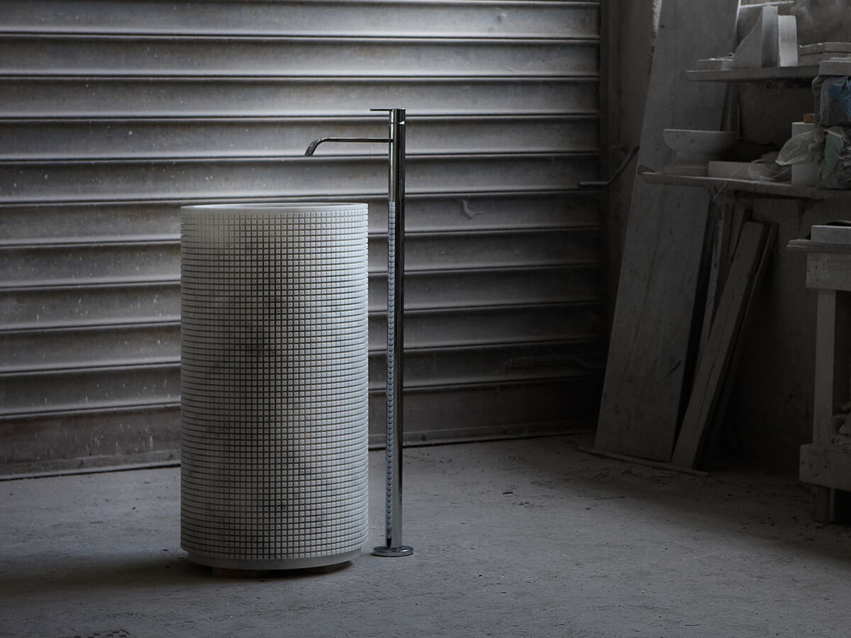 The Pixel free-standing washbasin by Antoniolupi is a real "artist's creation". In fact, it bears the signature of the eclectic Paolo Ulian and his unprecedented work of destructive dialogue with forms that gives life to ever new objects. Pixel was born monolithic and imposing, a large block of marble whose surface is divided into a very dense orthogonal grid of square tiles that almost give it the appearance of a mosaic. To this predefined processing, already precious and fascinating in itself, Paolo Ulian adds the unpredictability of human intervention: the individual pixels are in fact designed to be destroyed at will, thus outlining an original design on the surface of the washbasin, which in its complex intertwining of lights and shadows revives the rigorous geometry of the washbasin enriching it with a touch of unpredictability.